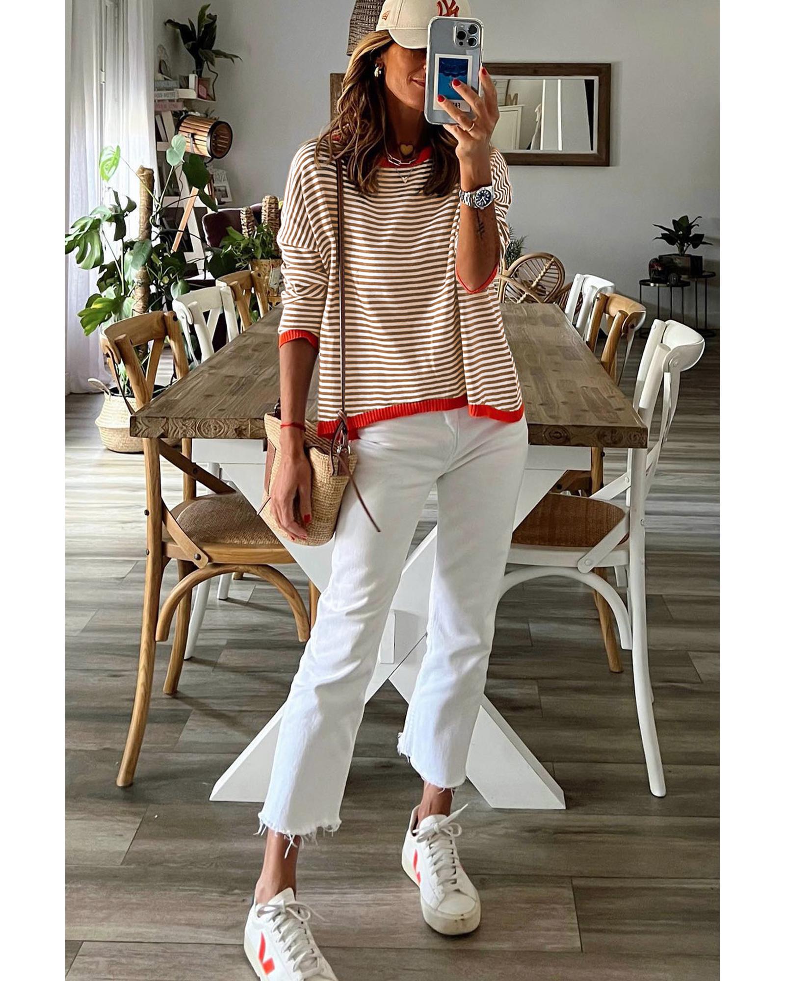 Classic striped sweater with contrast trimmed detailing Chic and comfortable drop shoulder design Regular fit style suitable for most body shapes Versatile piece that pairs well with jeans joggers or skirts Available in various sizes - Material: 100% Cotton