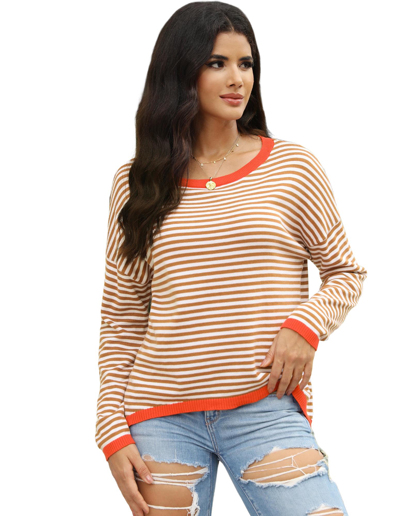 Brown Contrast Trimmed Striped Drop Shoulder Sweater – M