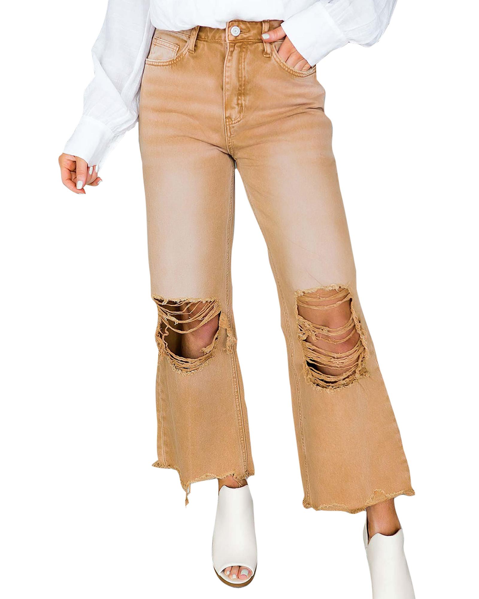 Brown Distressed Hollow-out High Waist Cropped Flare Jeans – 12 US