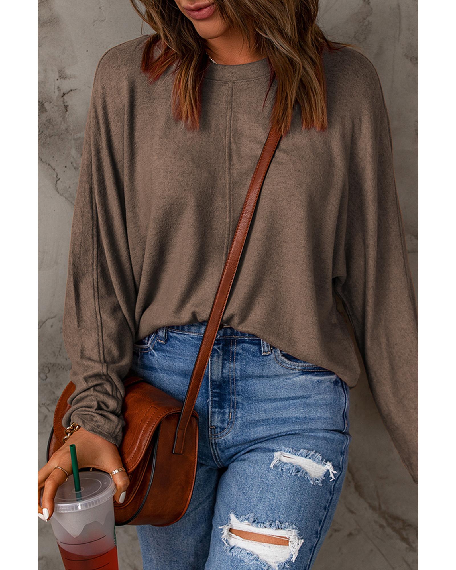 Brown Fiery Solid Color Patchwork Long Sleeve Top – XL