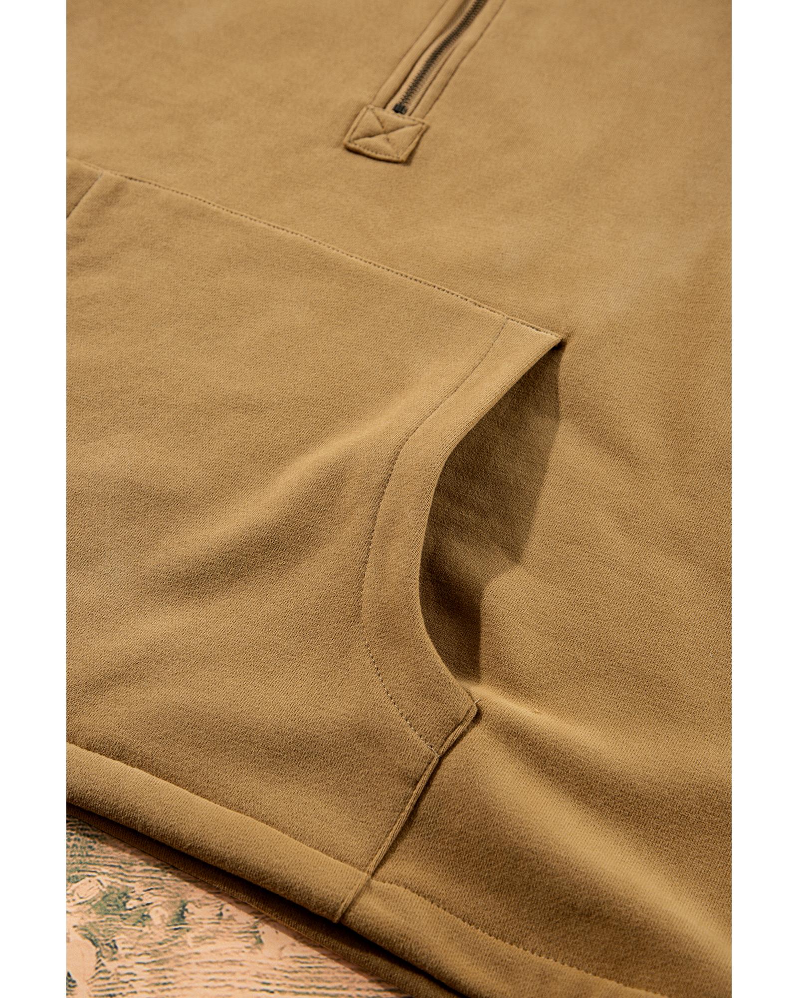 Brown Fleece Lined Half Zipper Kangaroo Pockets Loose Hoodie – M