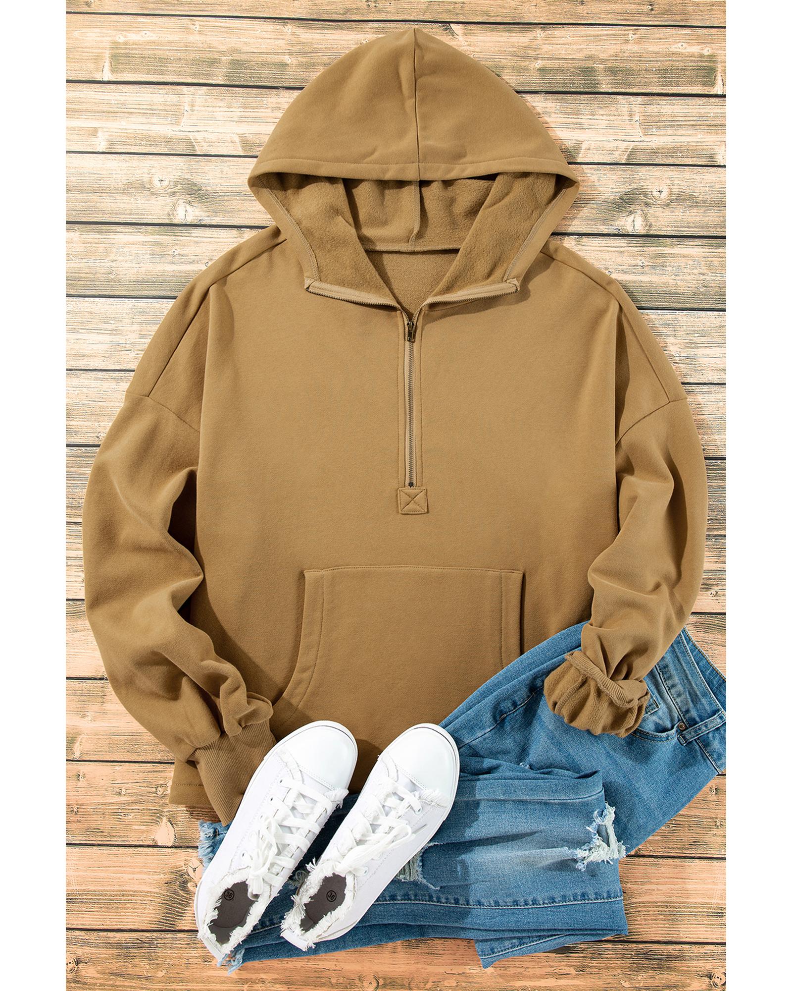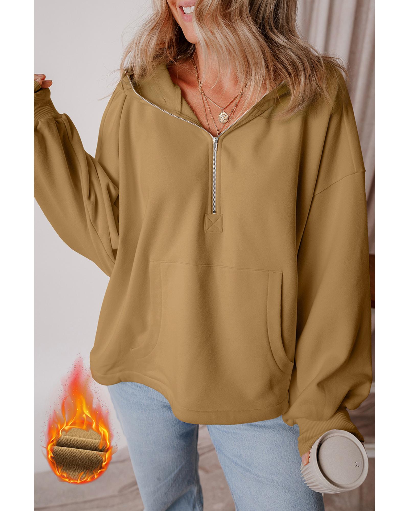 Brown Fleece Lined Half Zipper Kangaroo Pockets Loose Hoodie – S