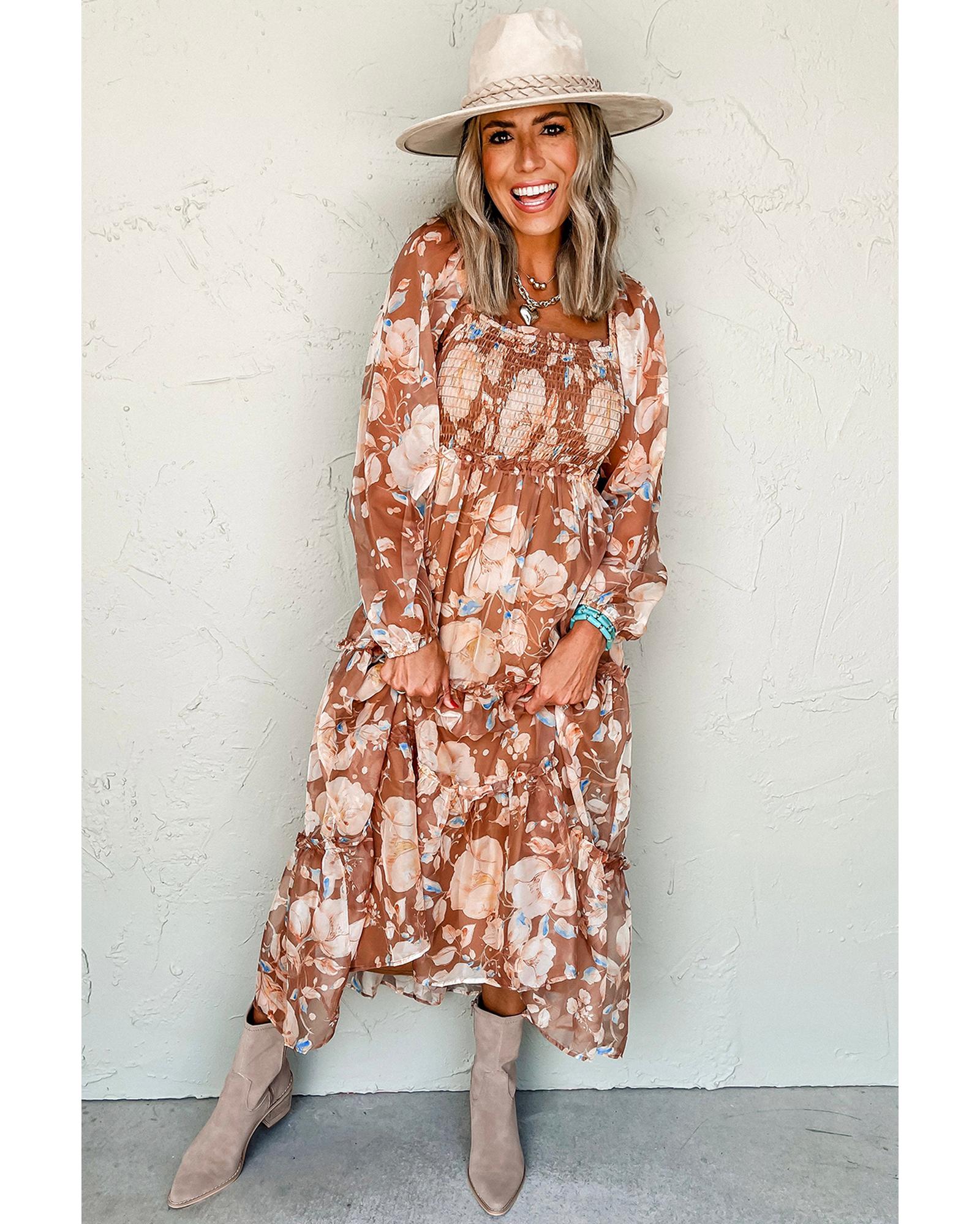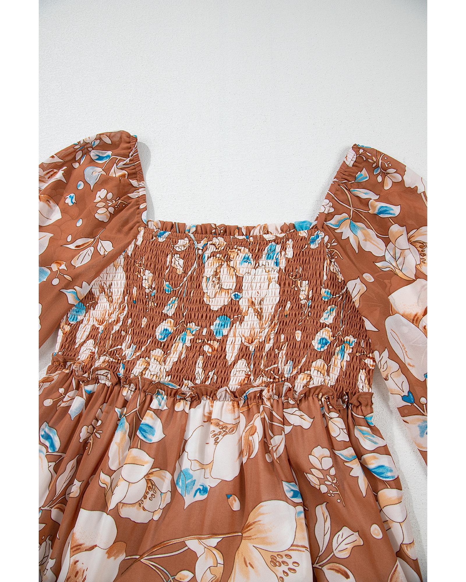 • Brown Floral Print Shirred Square Neck High Waist Maxi Dress