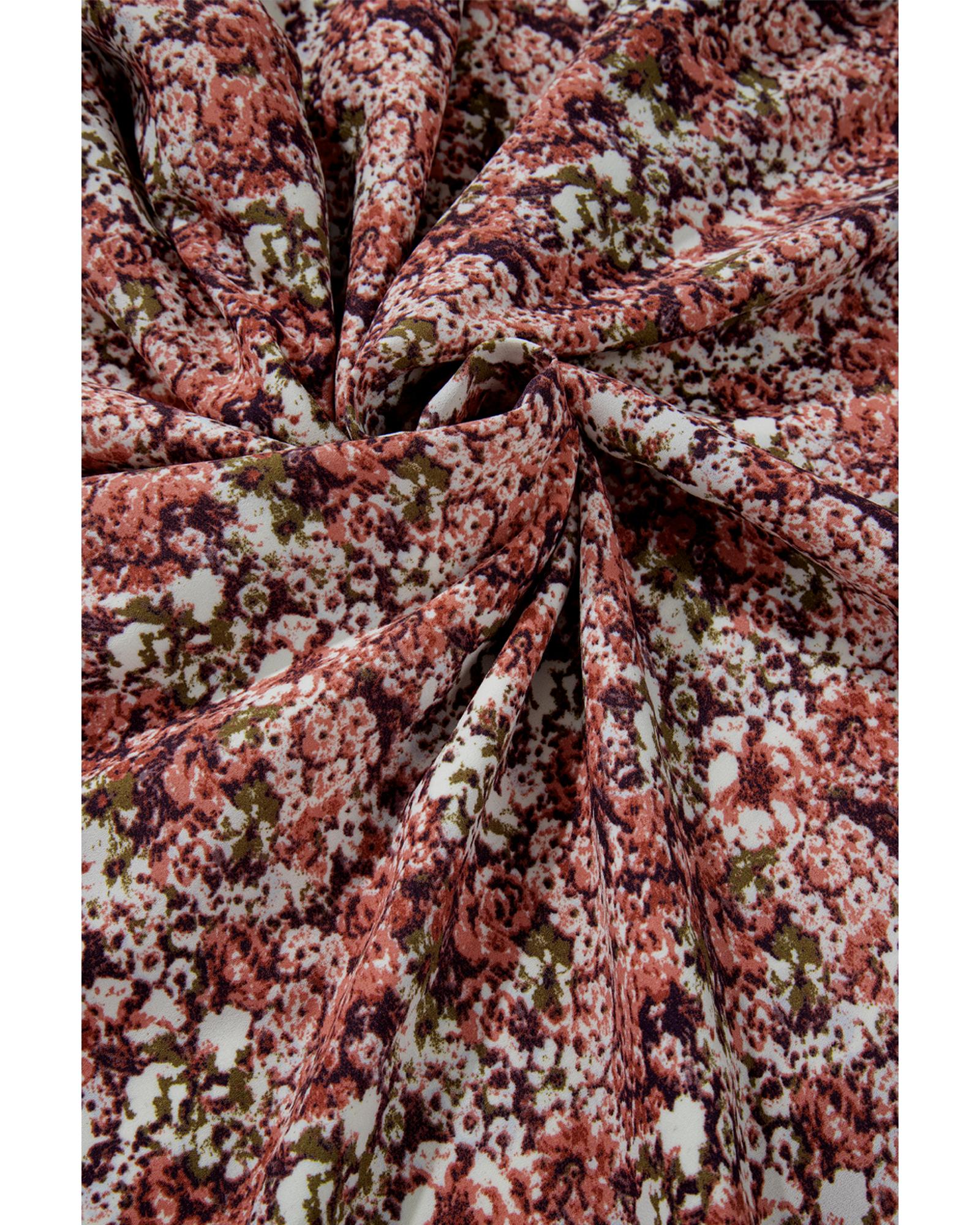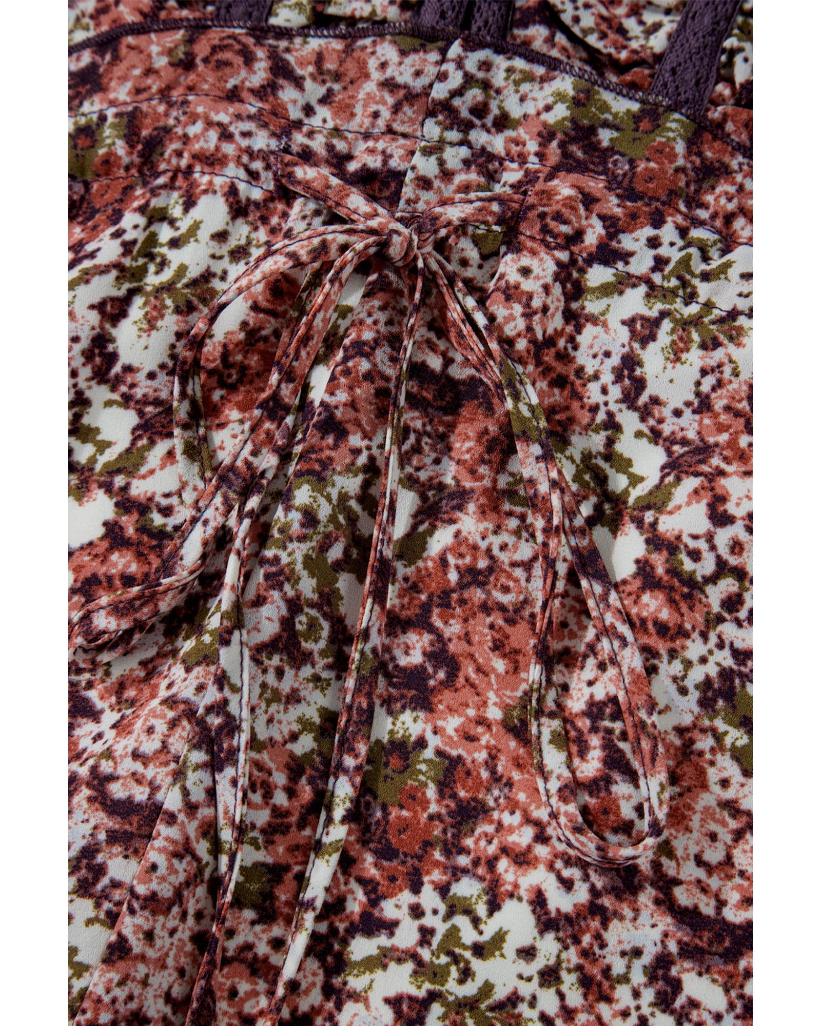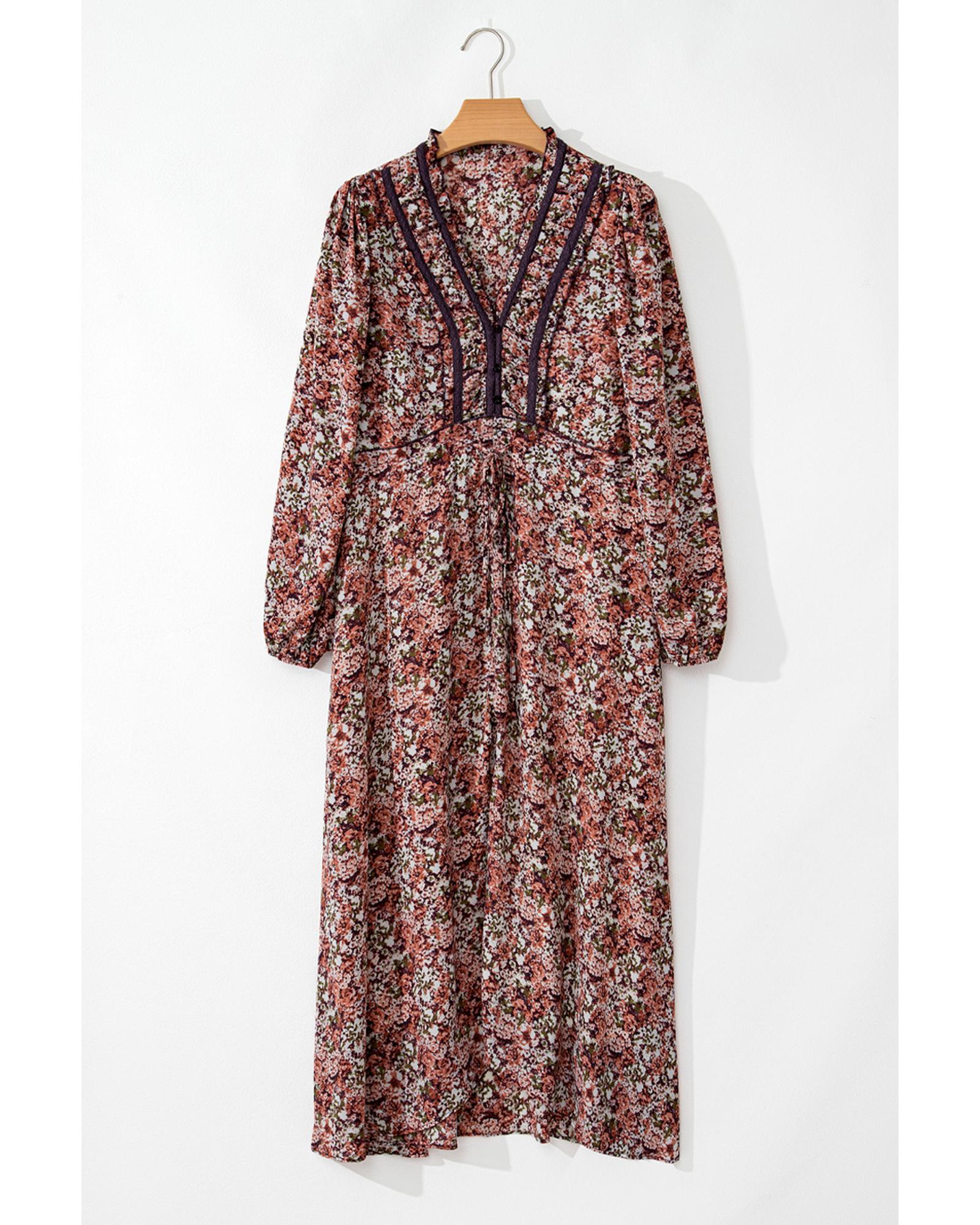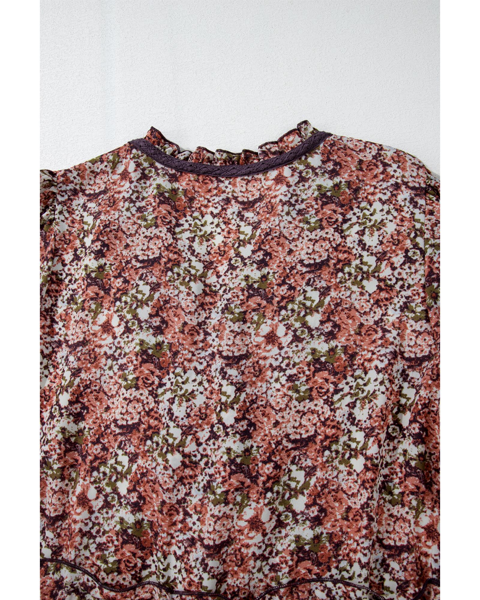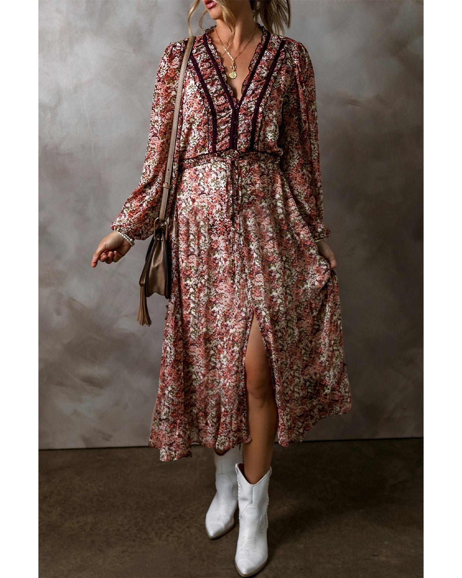 Brown Floral Print Split Front Tiered Frilled V Neck Midi Dress – S