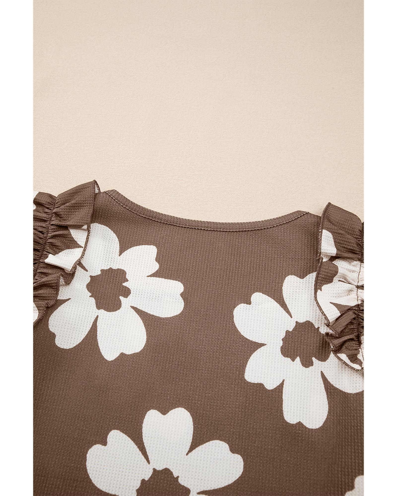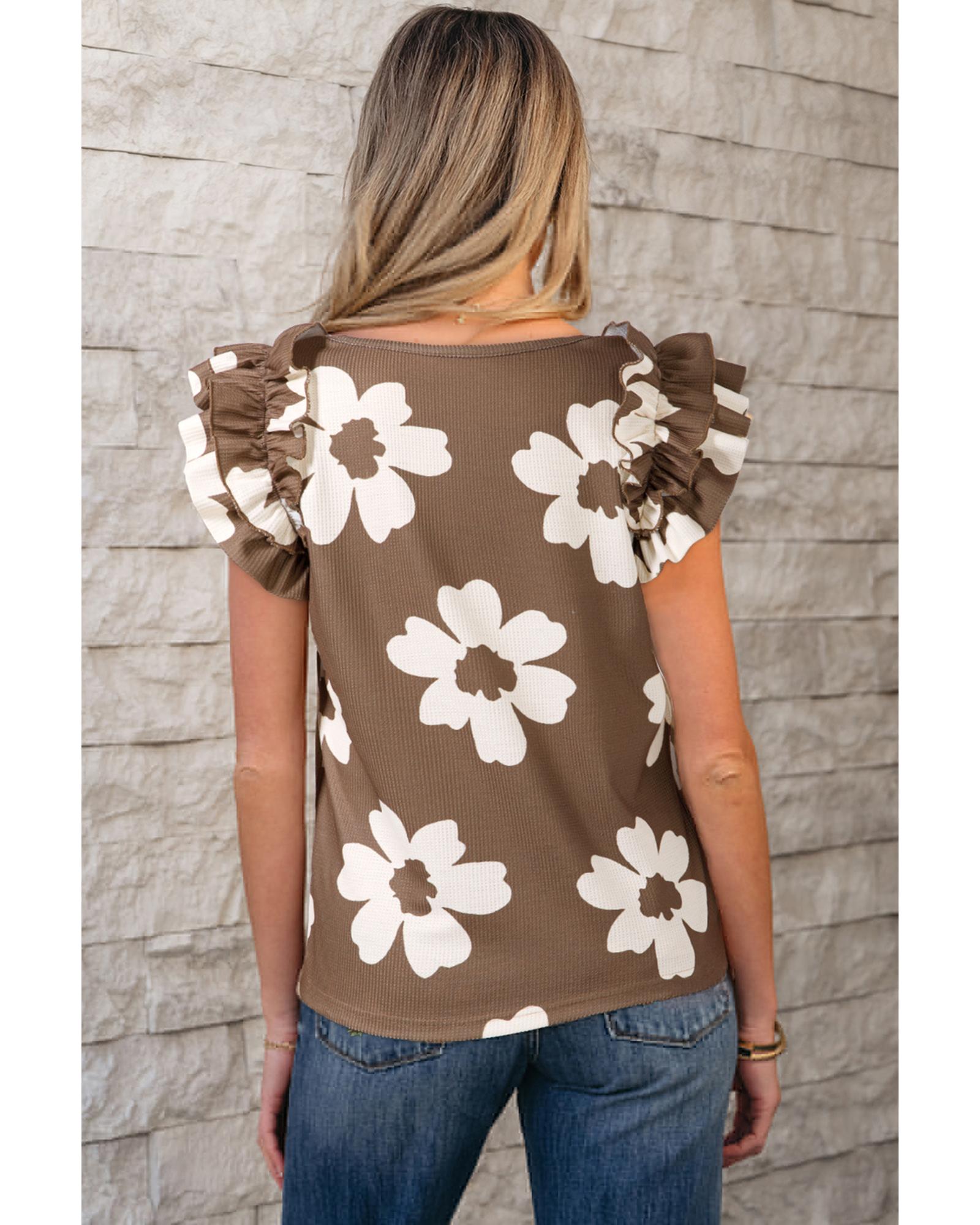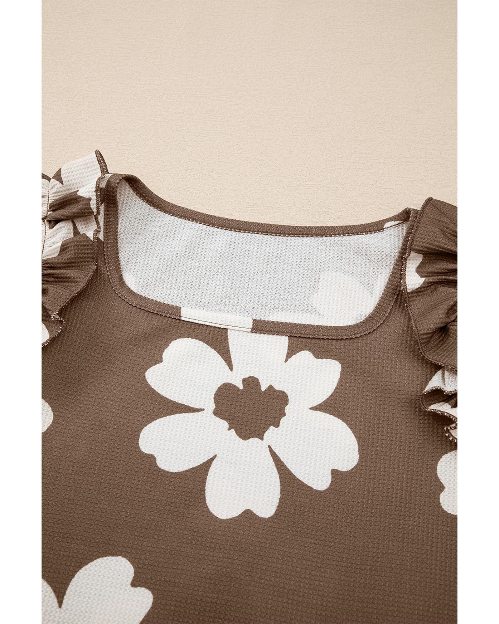 Brown Floral Textured Ruffled Short Sleeve Square Neck Blouse – L