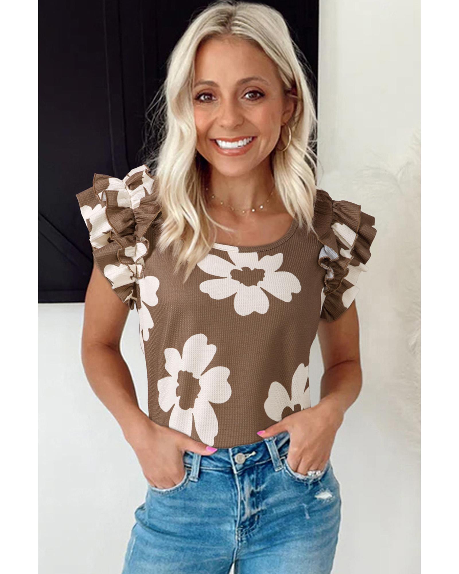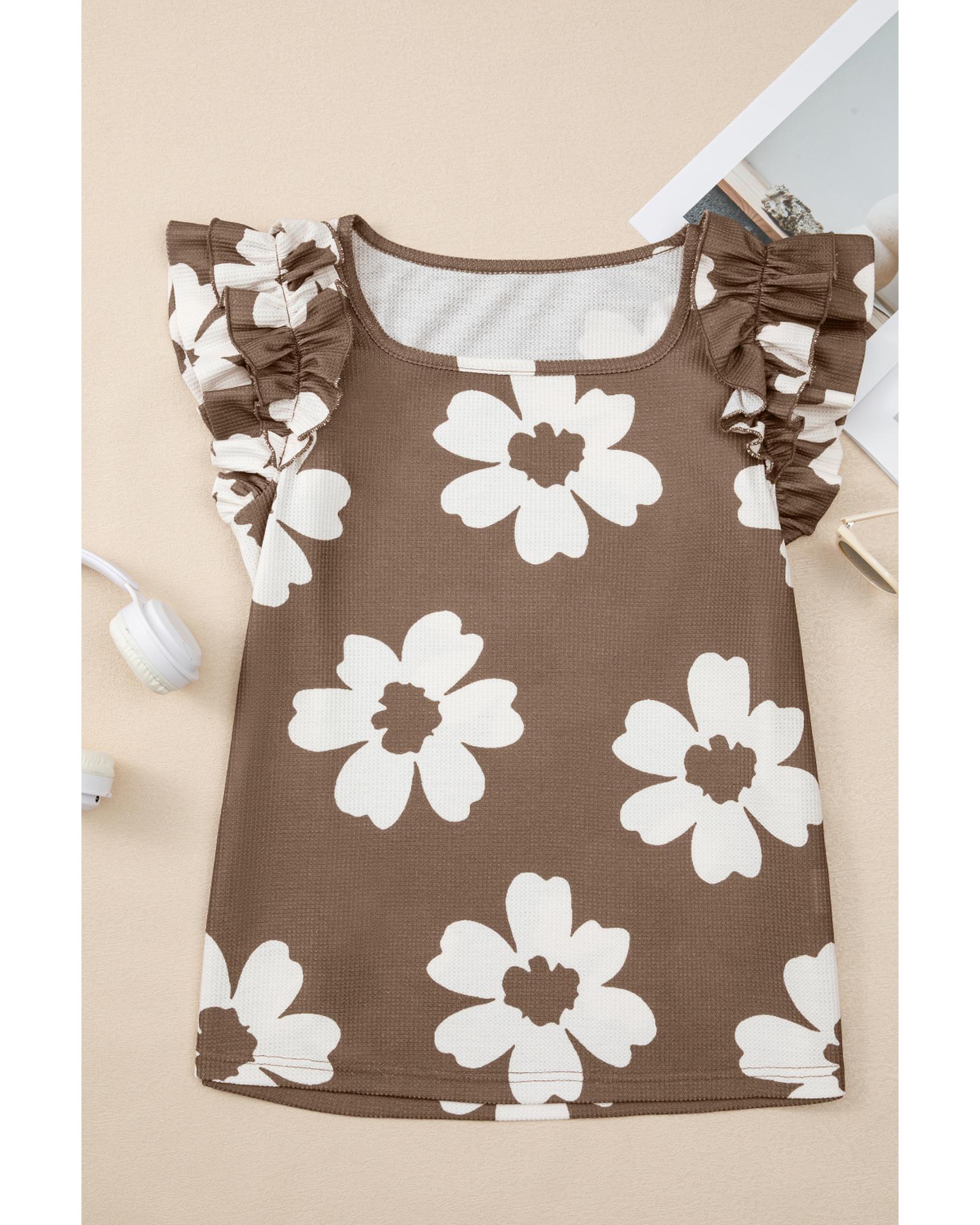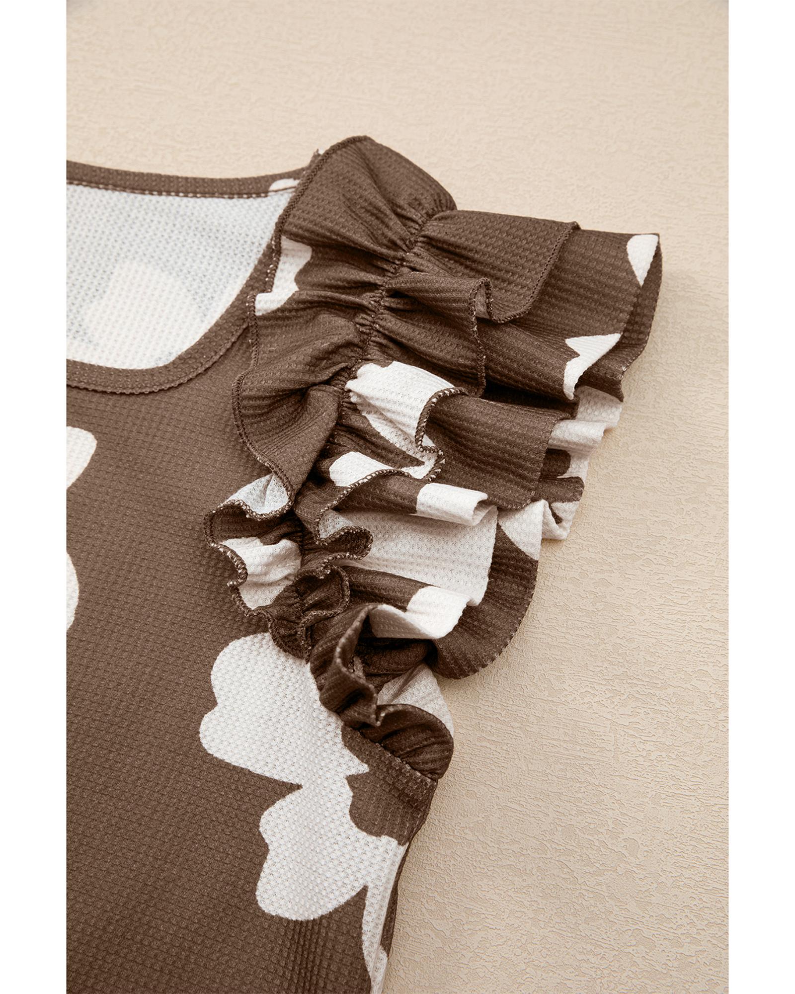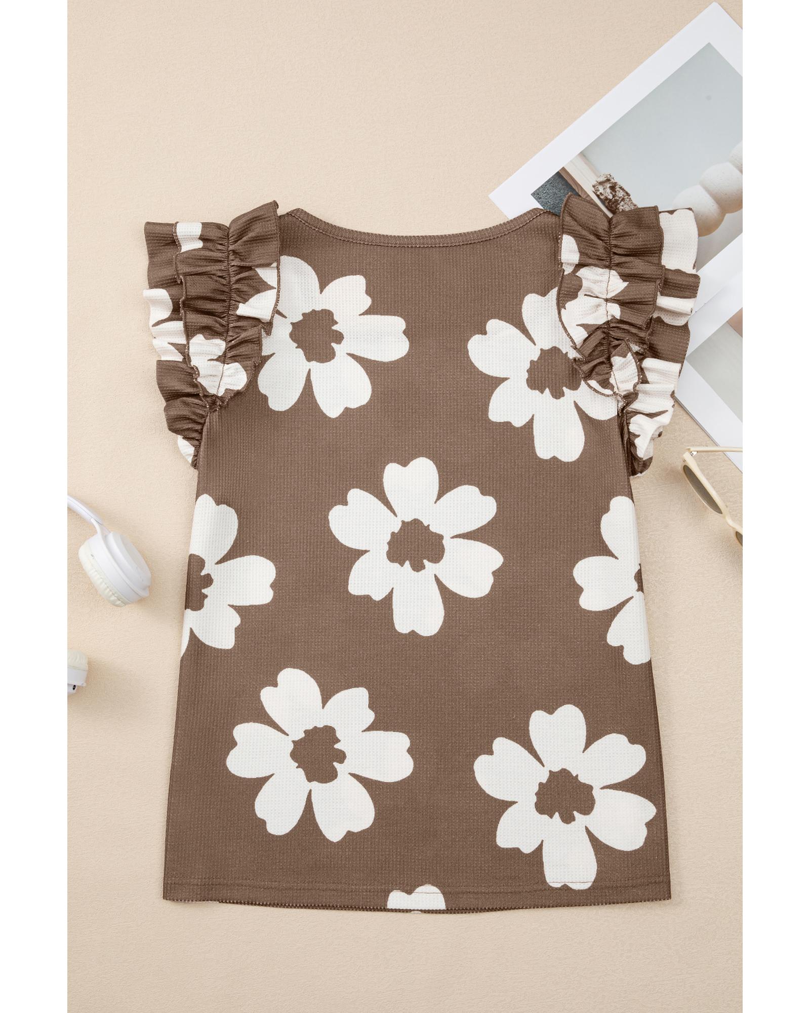 Brown Floral Textured Ruffled Short Sleeve Square Neck Blouse – L