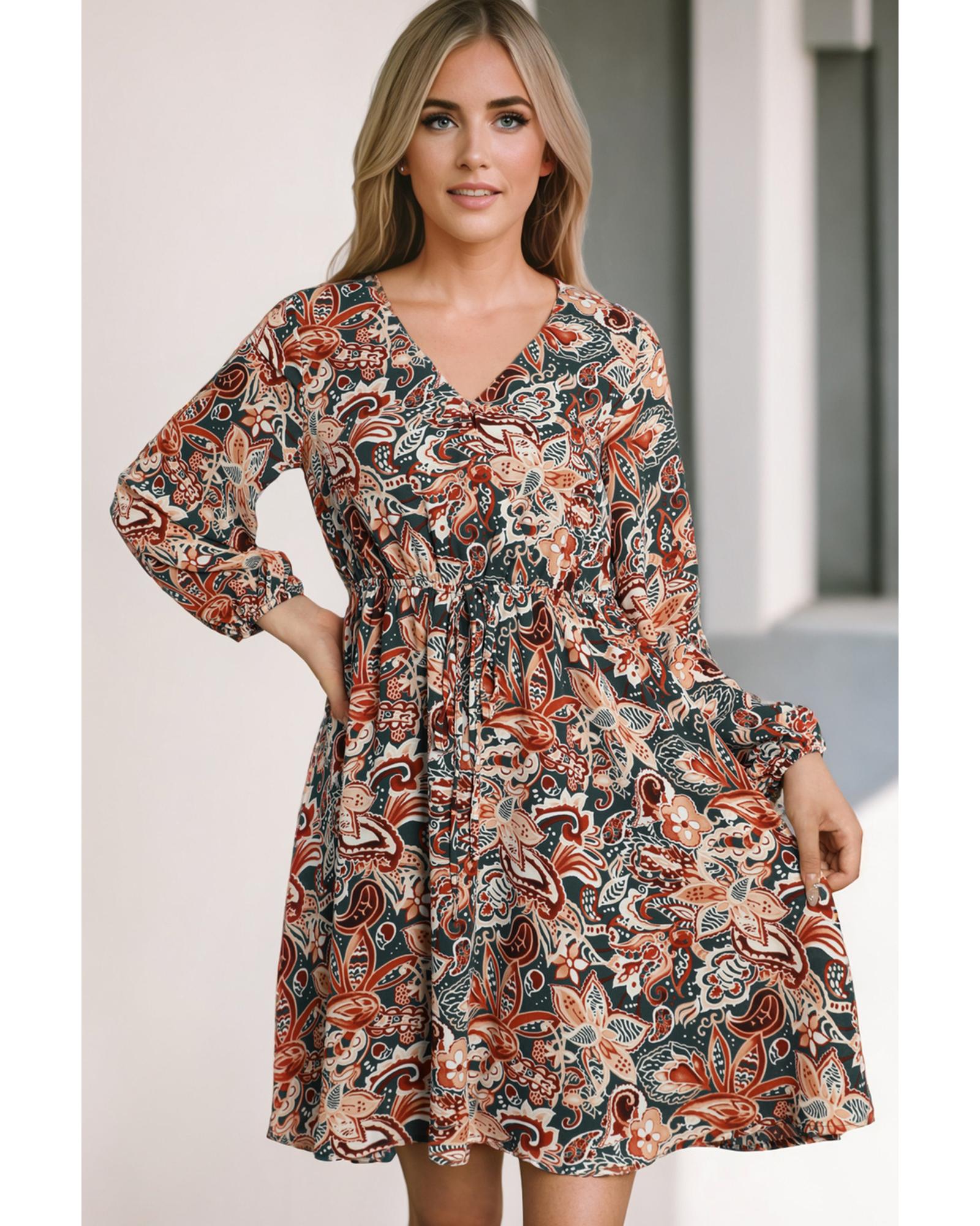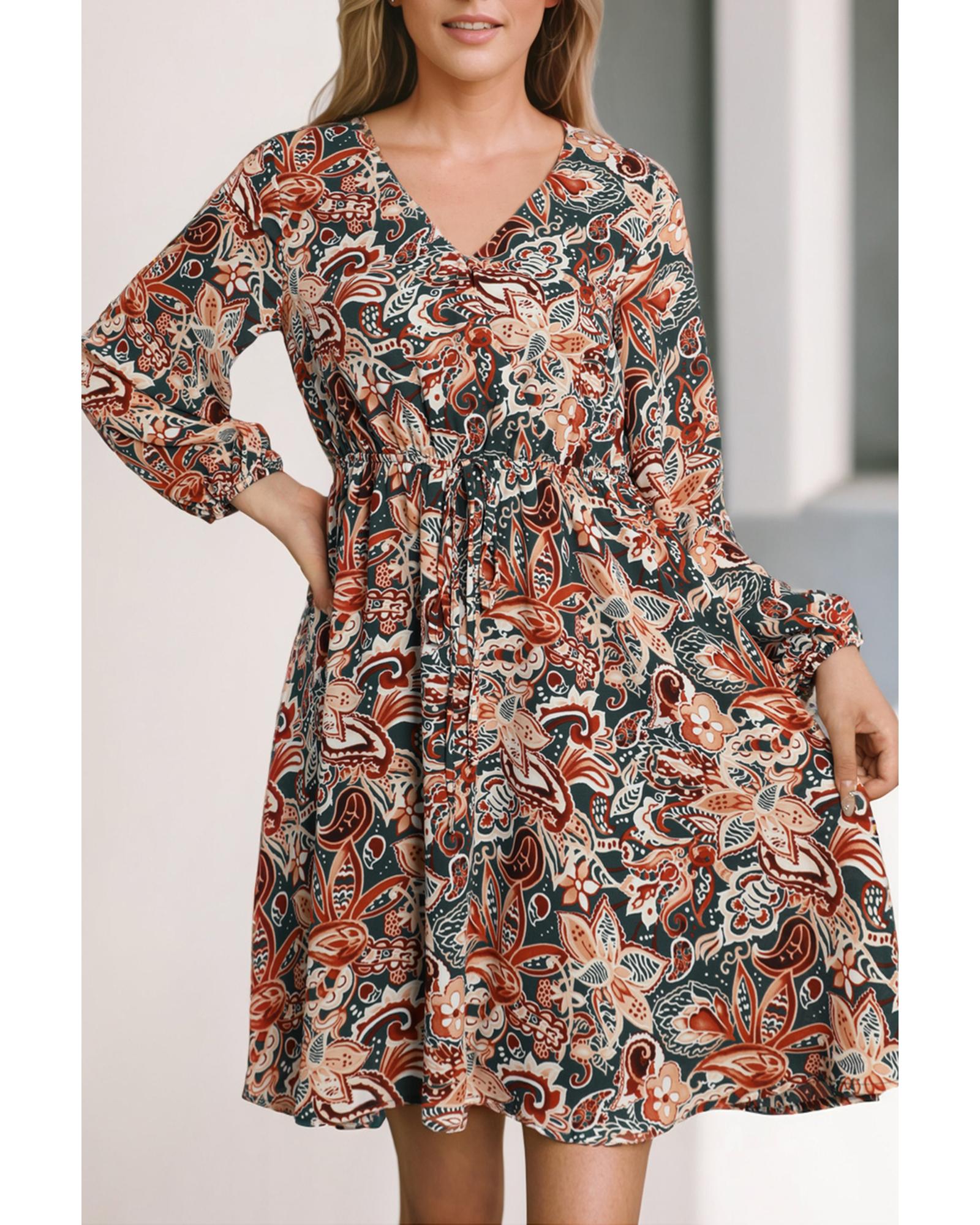 Brown Geometric Print Long Sleeve Surplice Flowy Dress – M