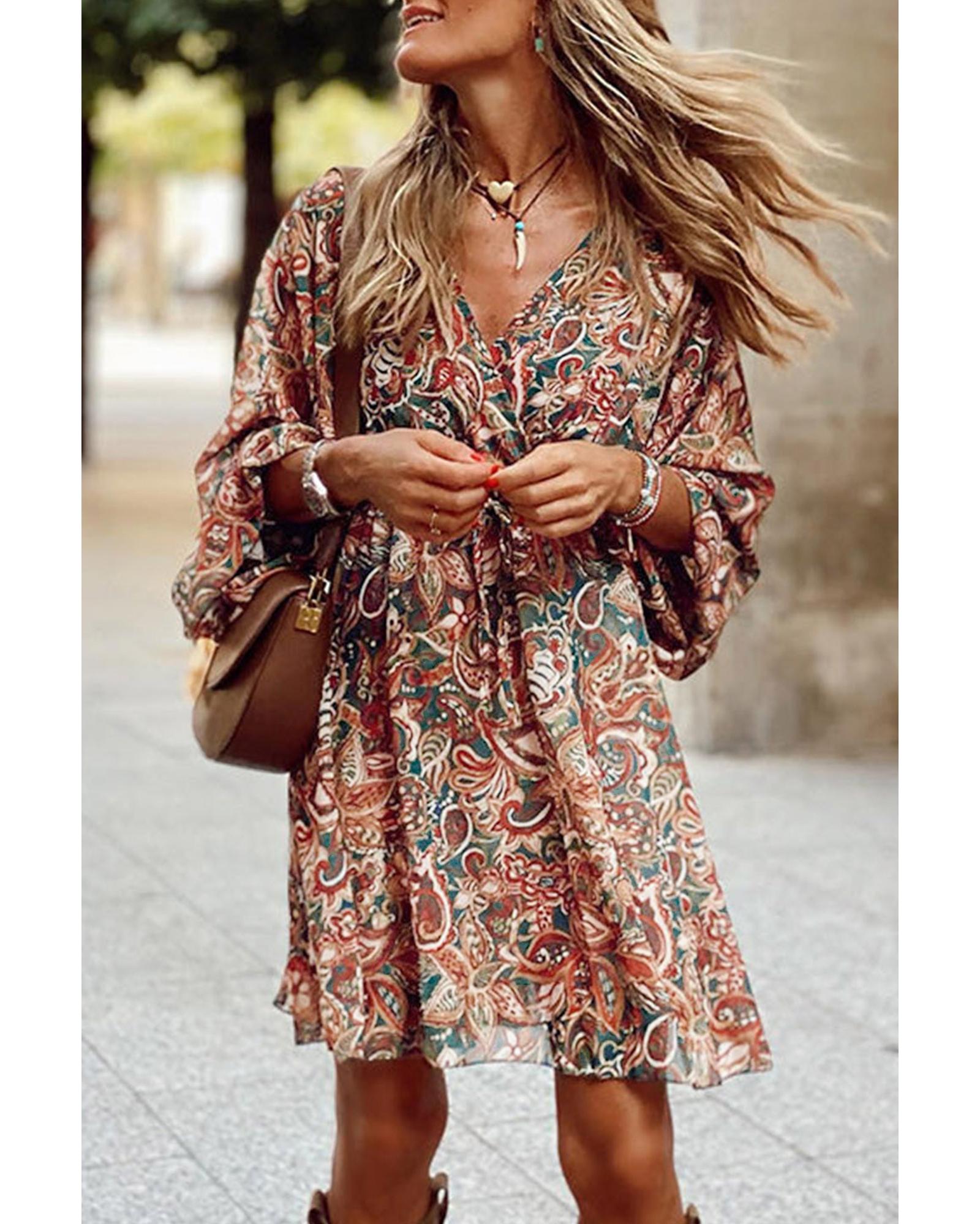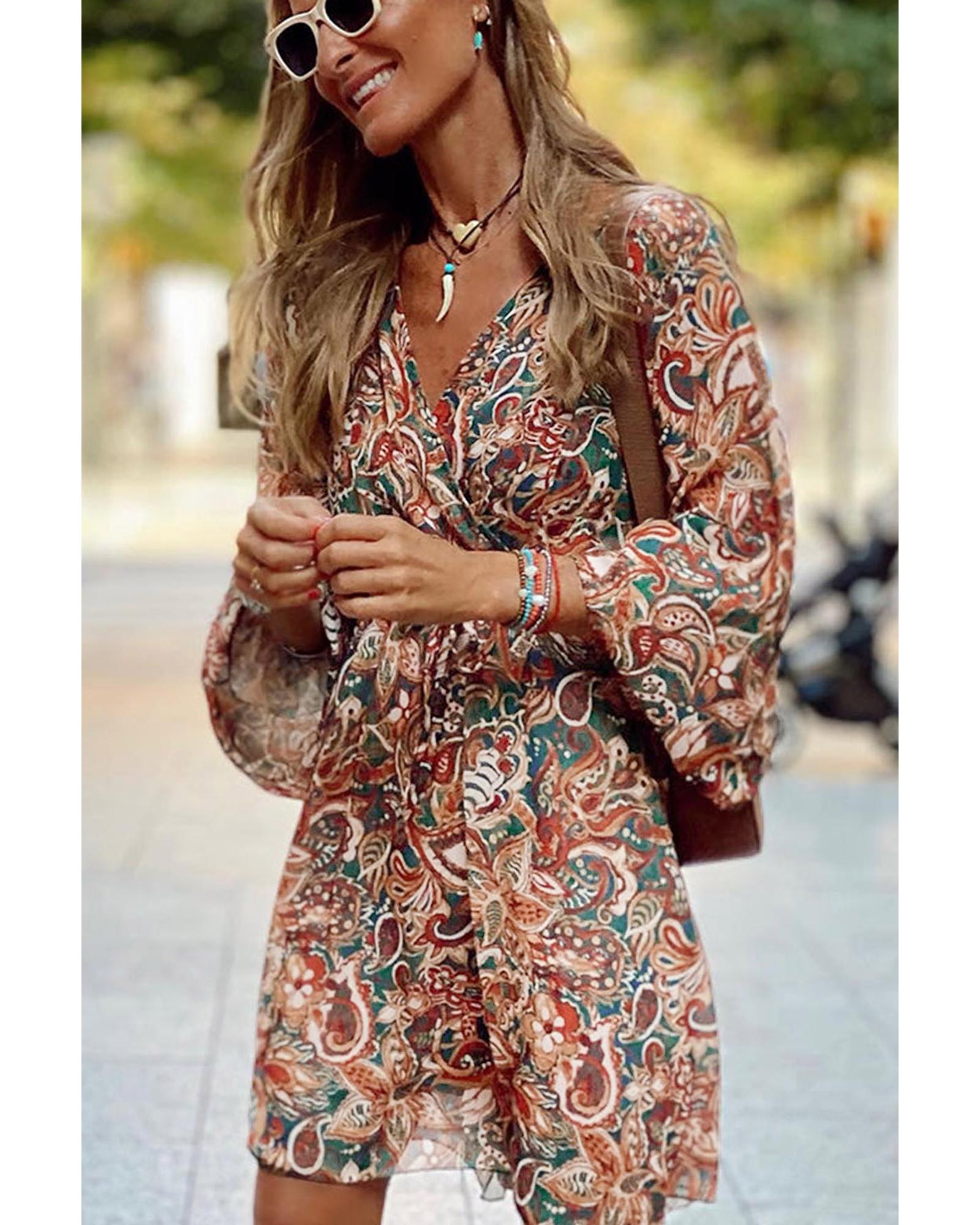 Brown Geometric Print Long Sleeve Surplice Flowy Dress – XL