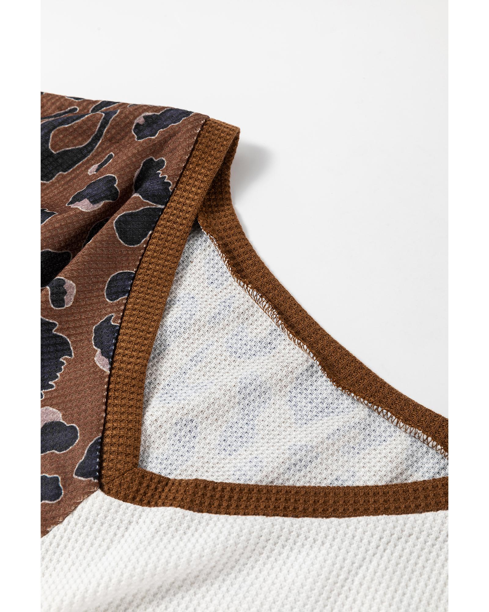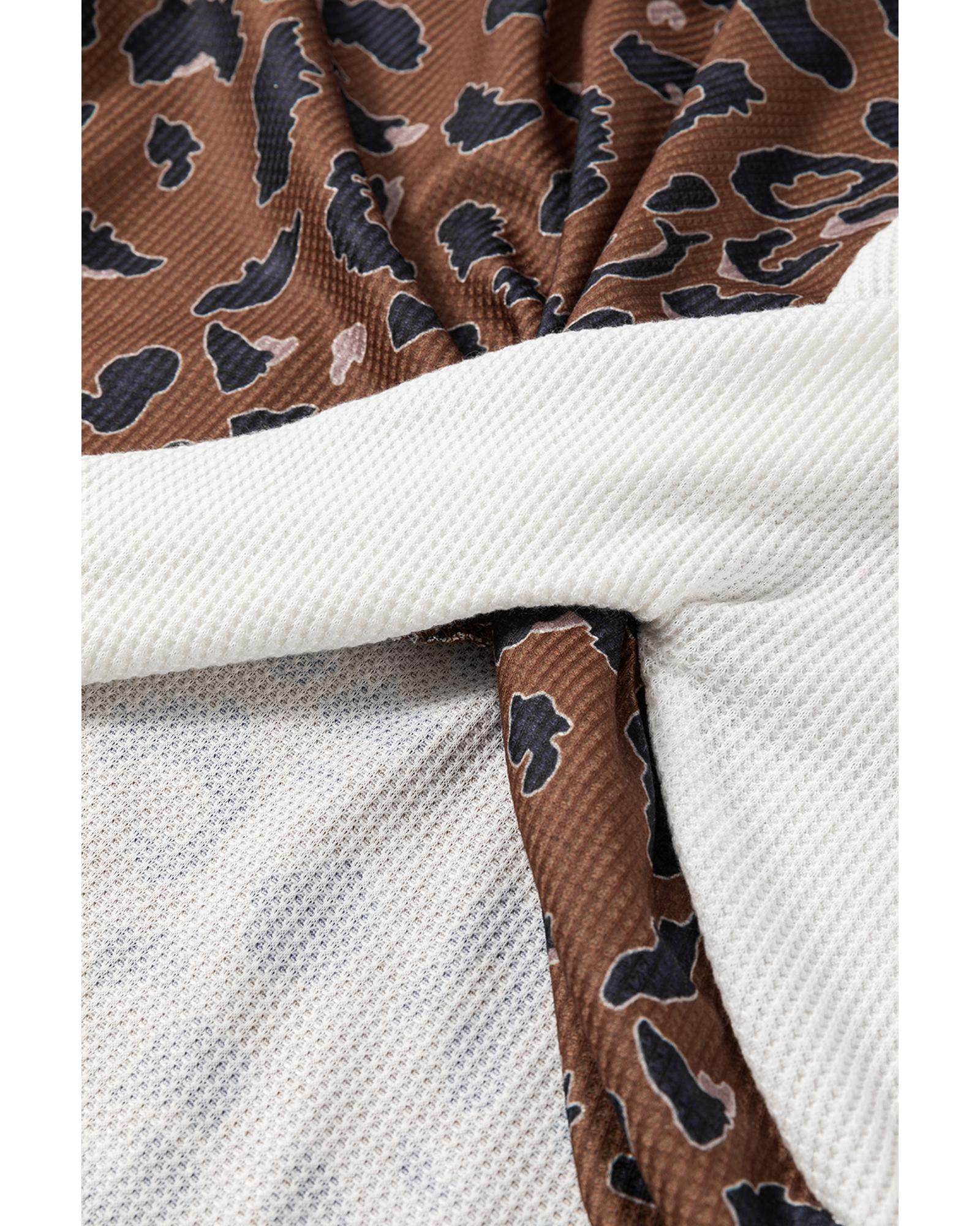 - Unisex Brown Leopard Contrast Waffle Knit Twist Hem V Neck Top