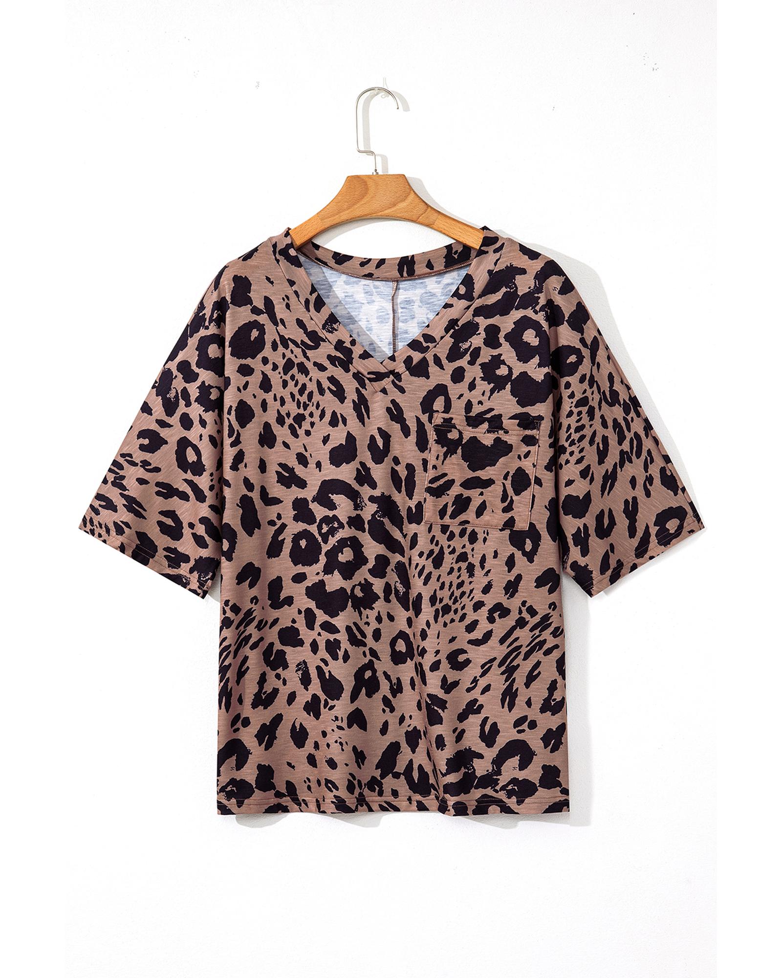 Brown Leopard Print V Neck Half Sleeve Oversized Tee – M