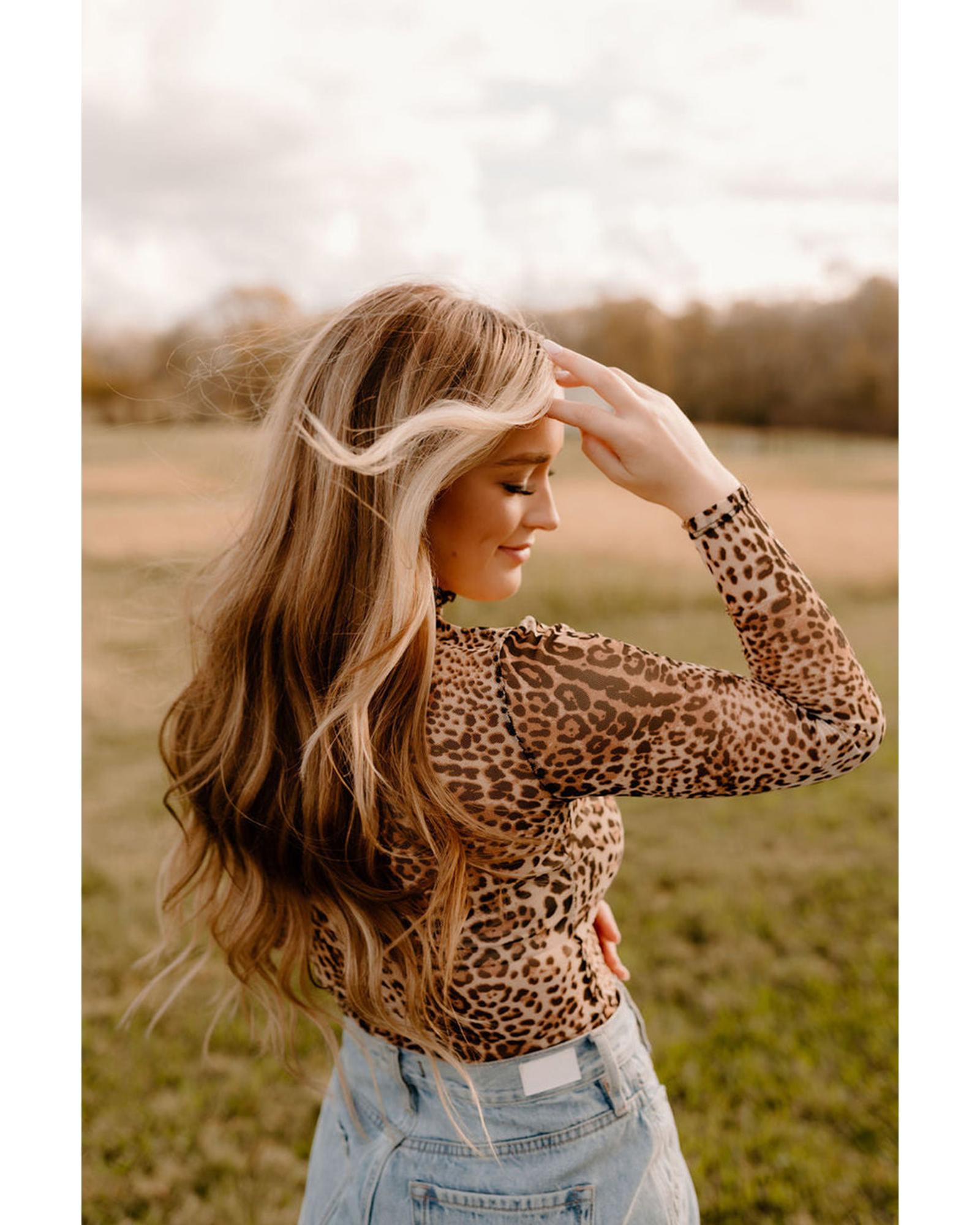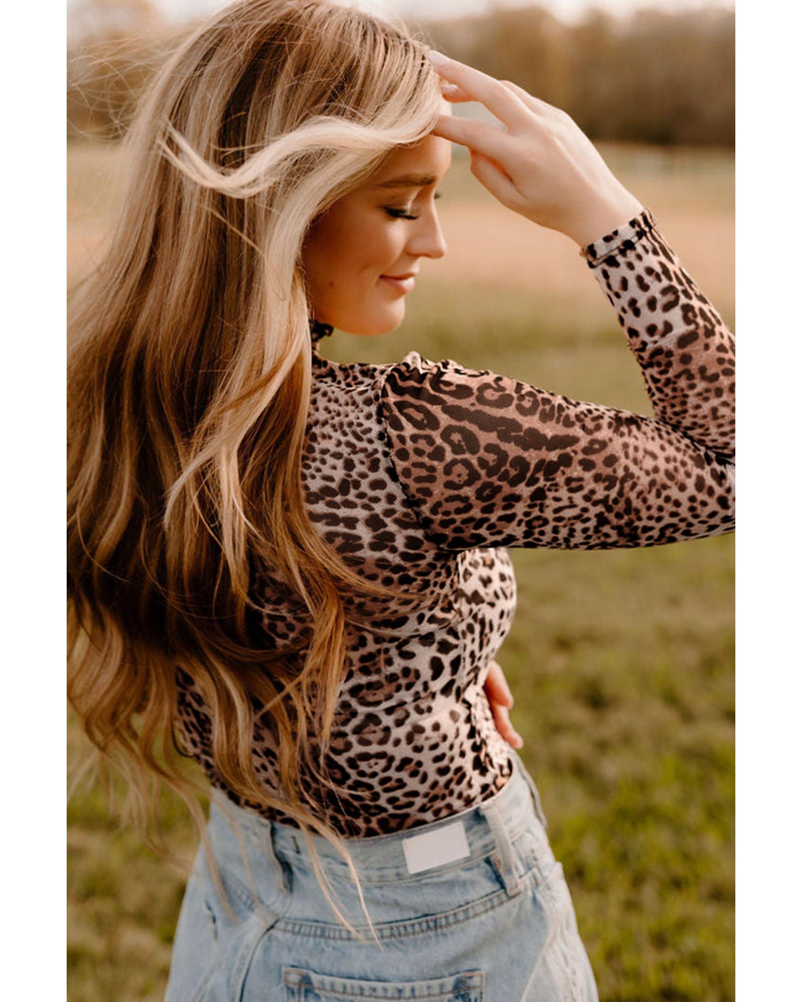 - Brown Leopard Smocked Neck Mesh Long Sleeve Bodysuit