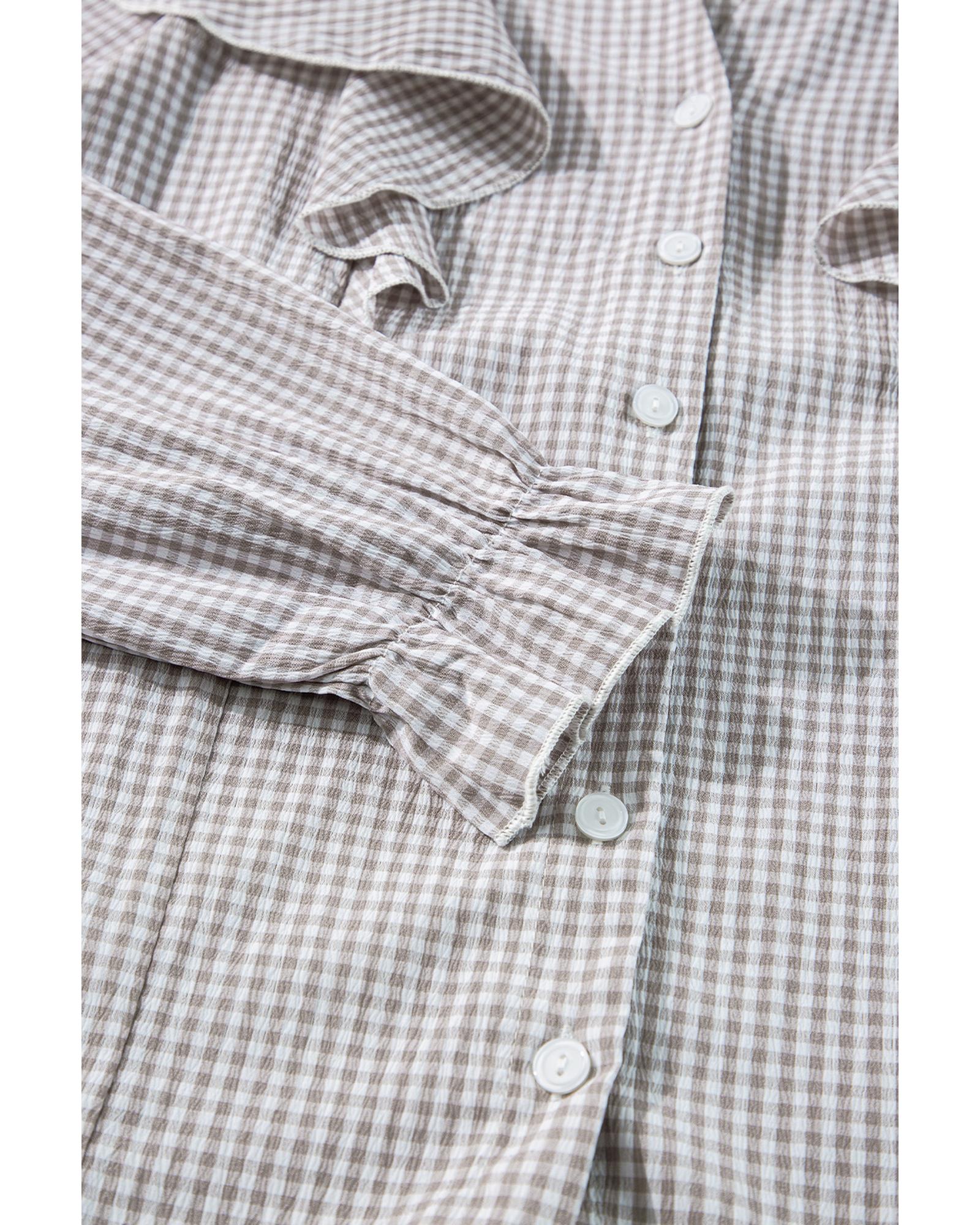 Brown Plaid Flounce Sleeve Notched Neck Ruffled Shirt – XL