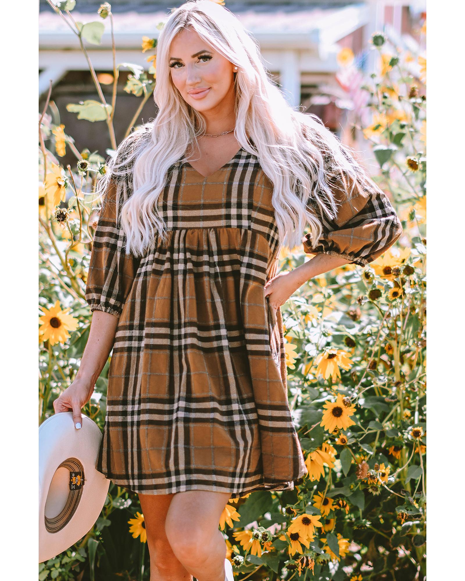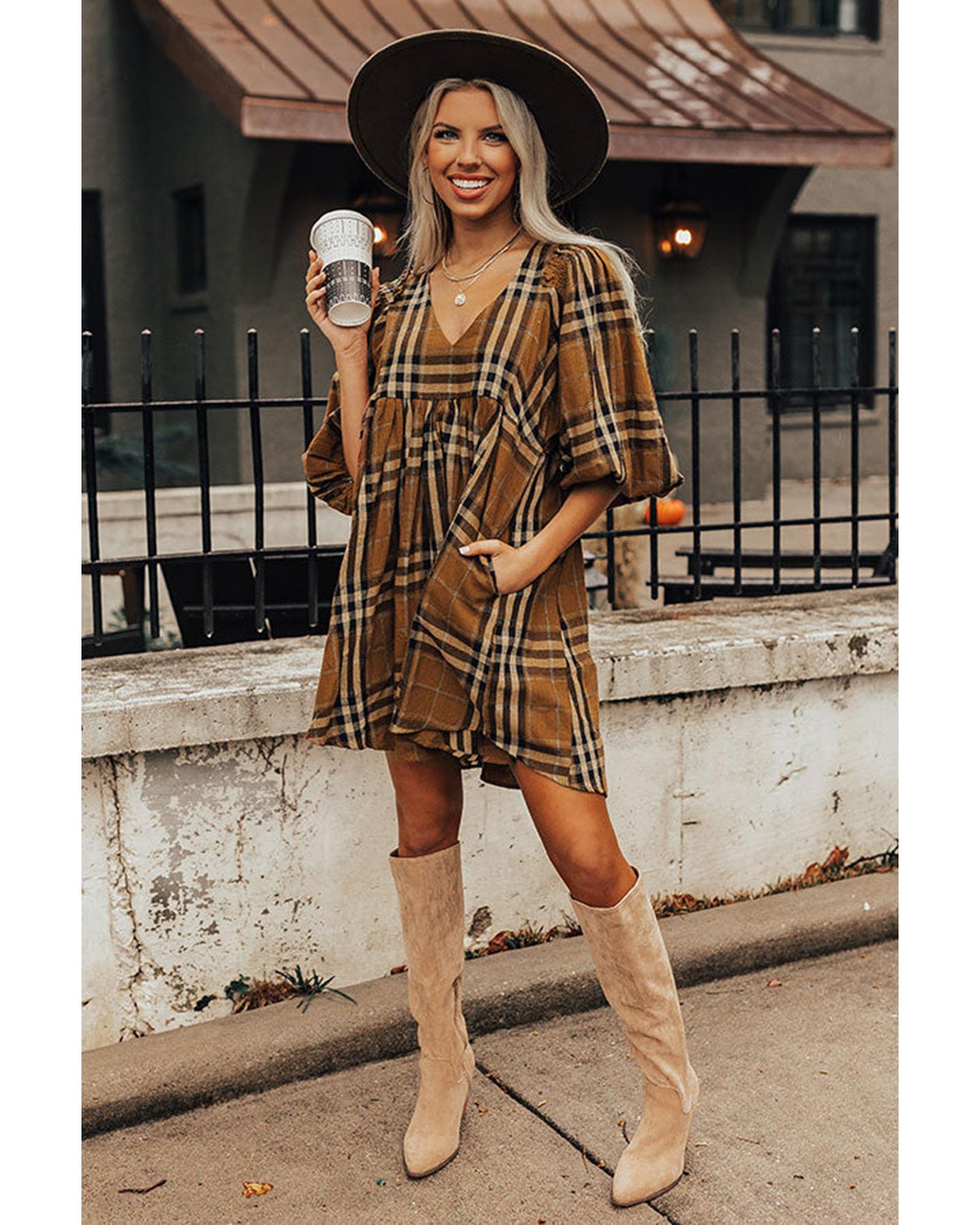 Brown Plaid Pattern Empire Waist Babydoll Dress – S