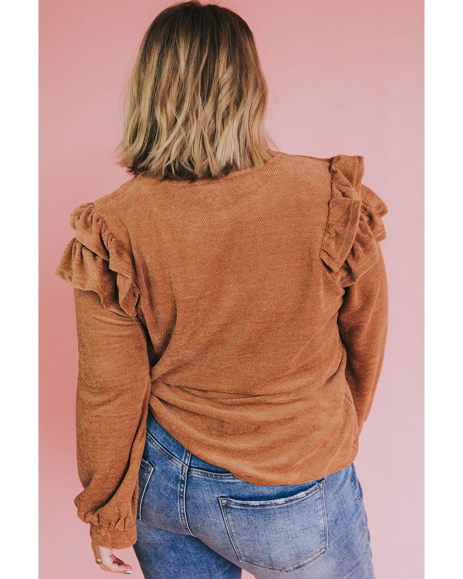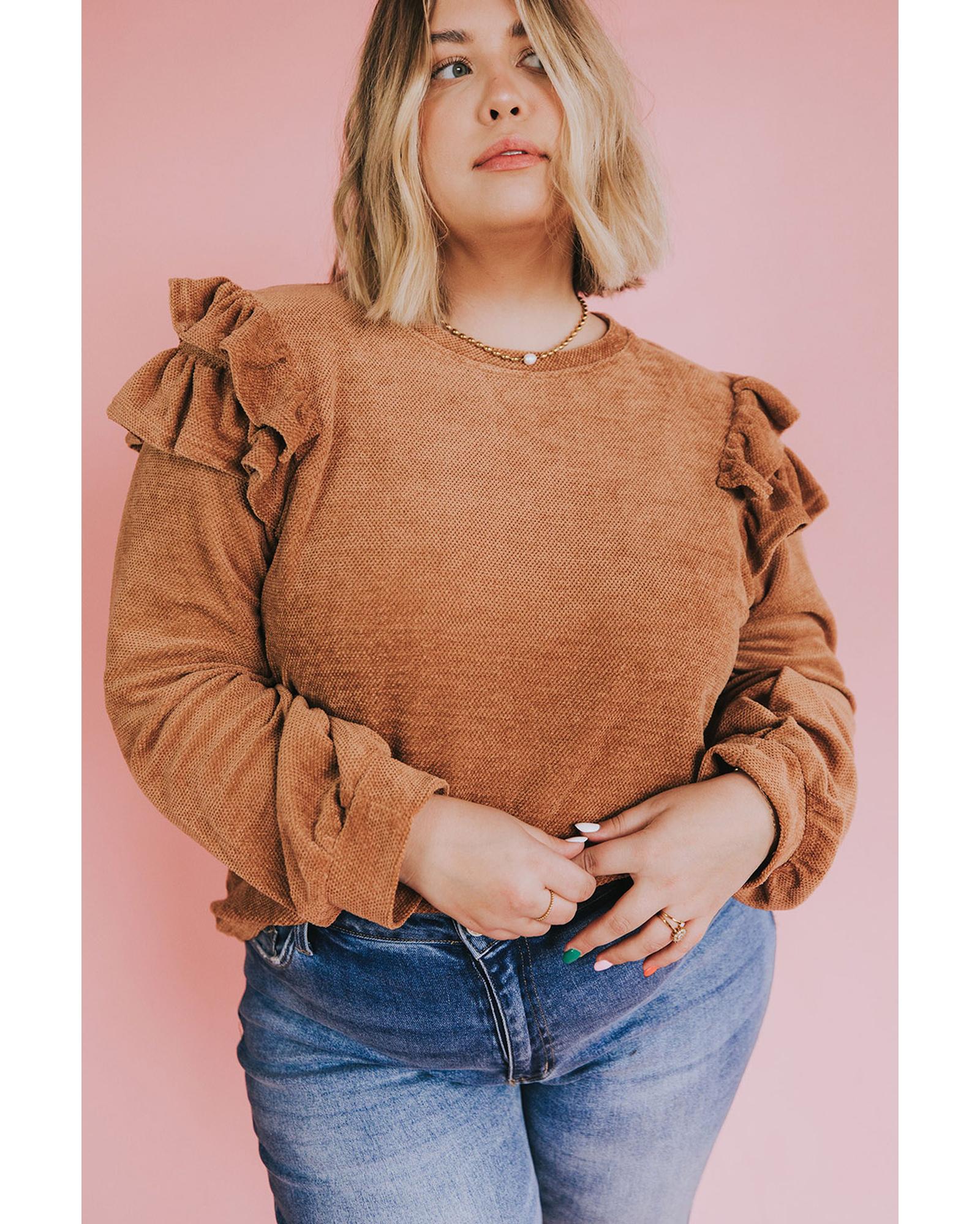 Brown Plus Size Solid Ruffled Tiered Long Sleeve Top – 1X