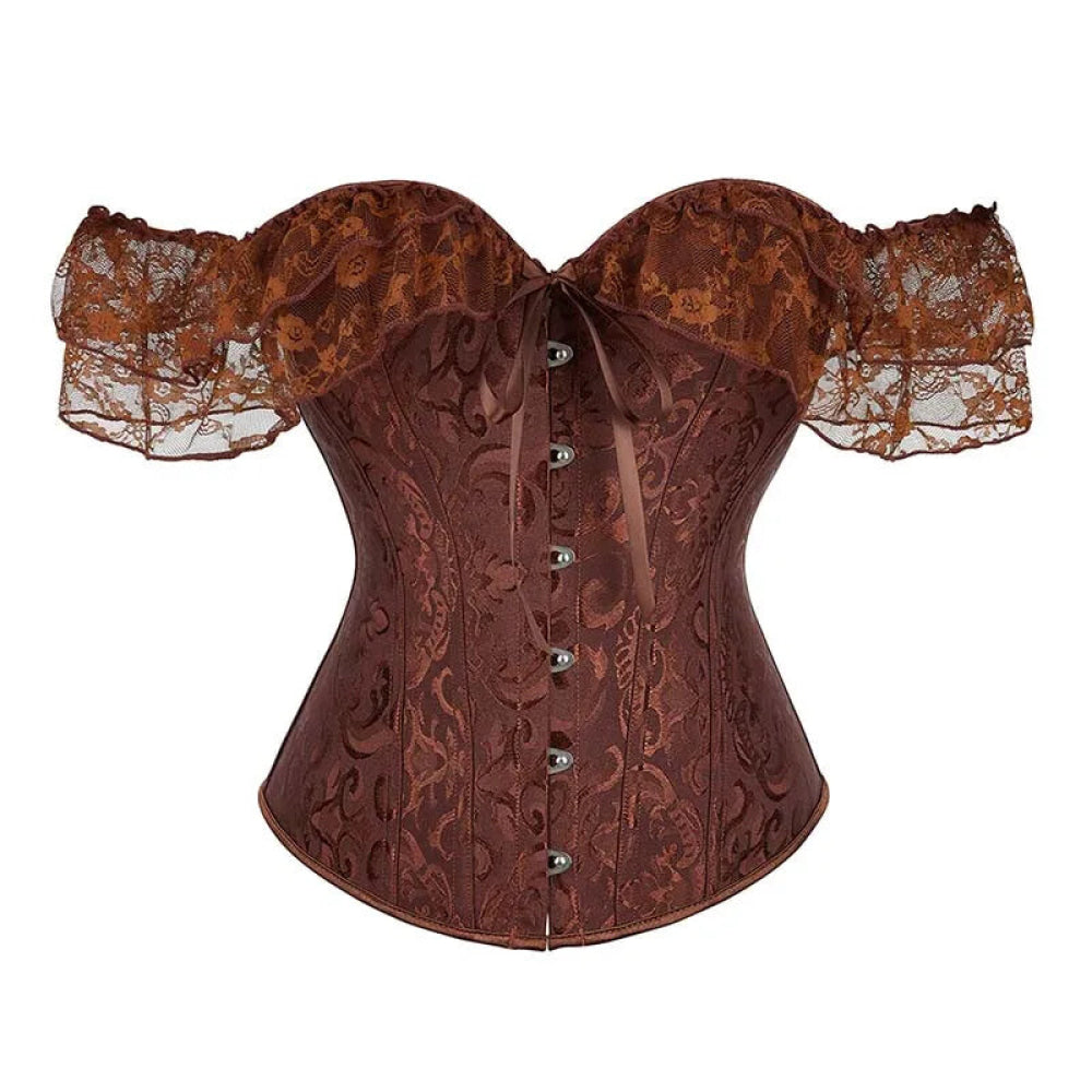• 1 x Brown Steampunk Corset With Front Busk Closure Floral Lace And Puff Sleeves