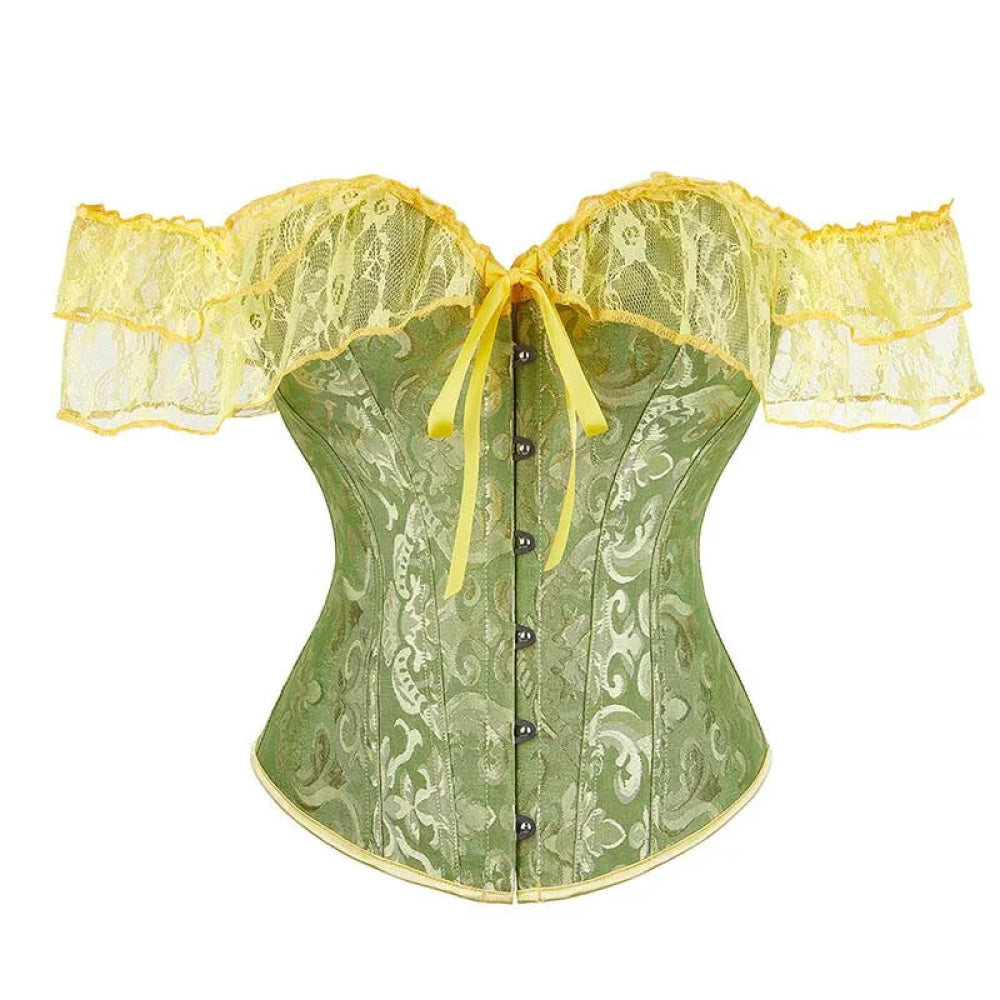 Brown Steampunk Corset With Front Busk Closure Floral Lace And Puff Sleeves – Green – S