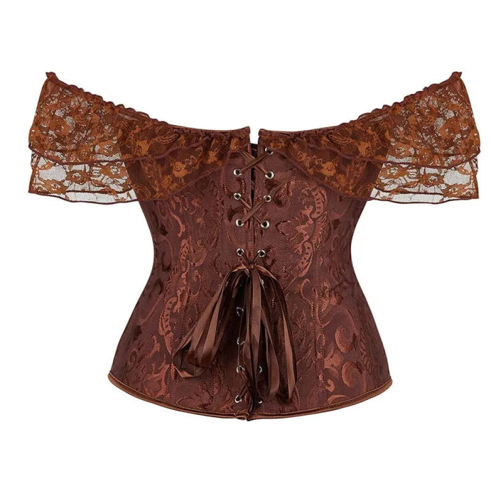 • 1 x Brown Steampunk Corset With Front Busk Closure Floral Lace And Puff Sleeves