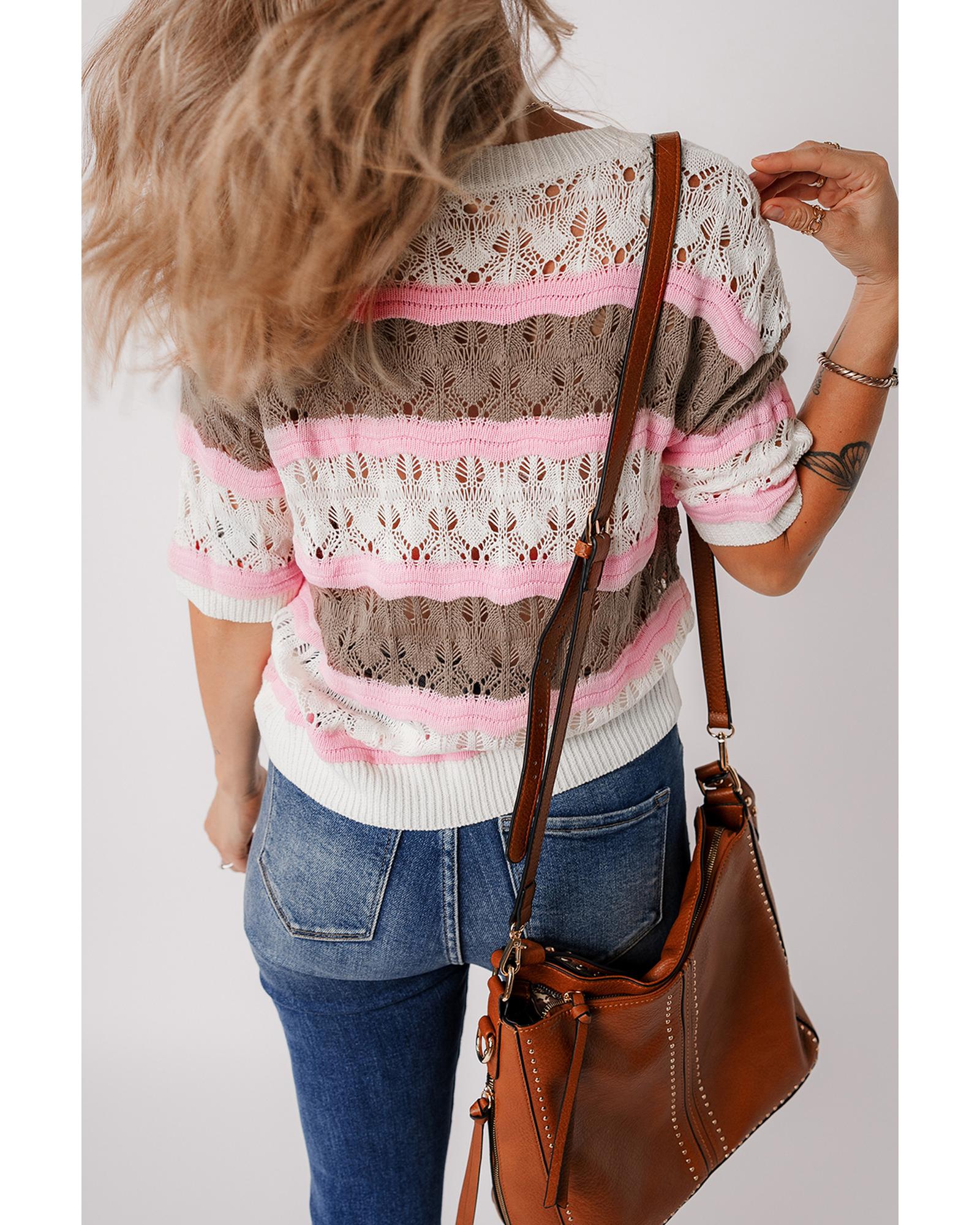 - Brown Stripe Color Block Hollow Out Crochet Half Sleeve Sweater