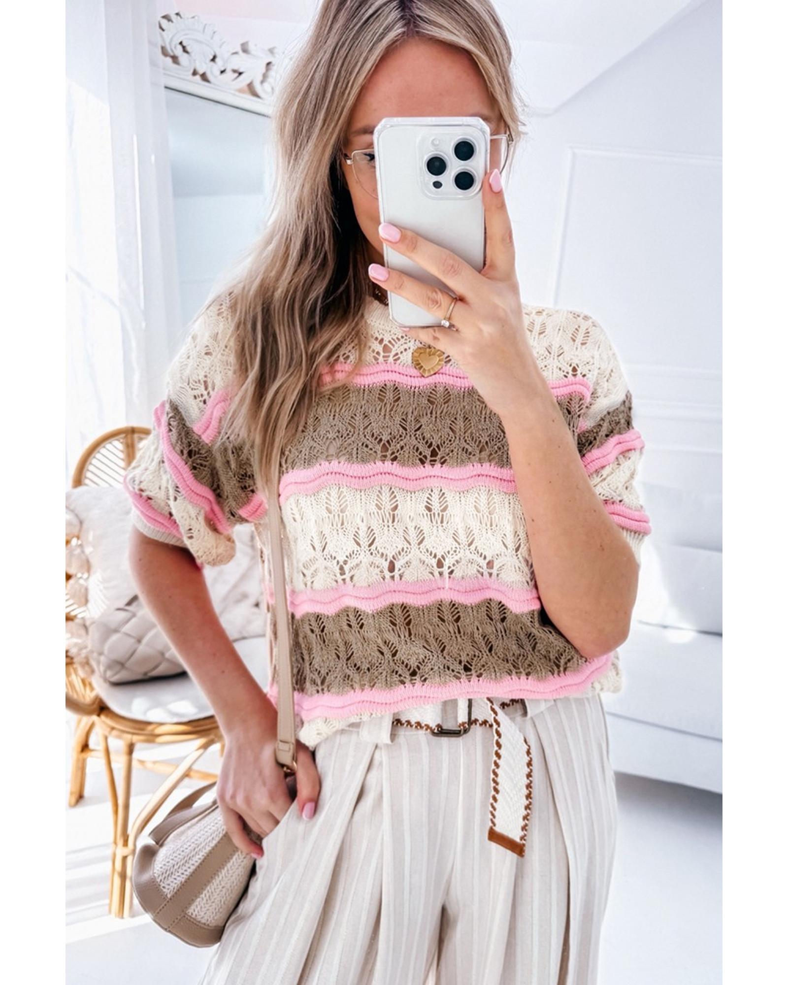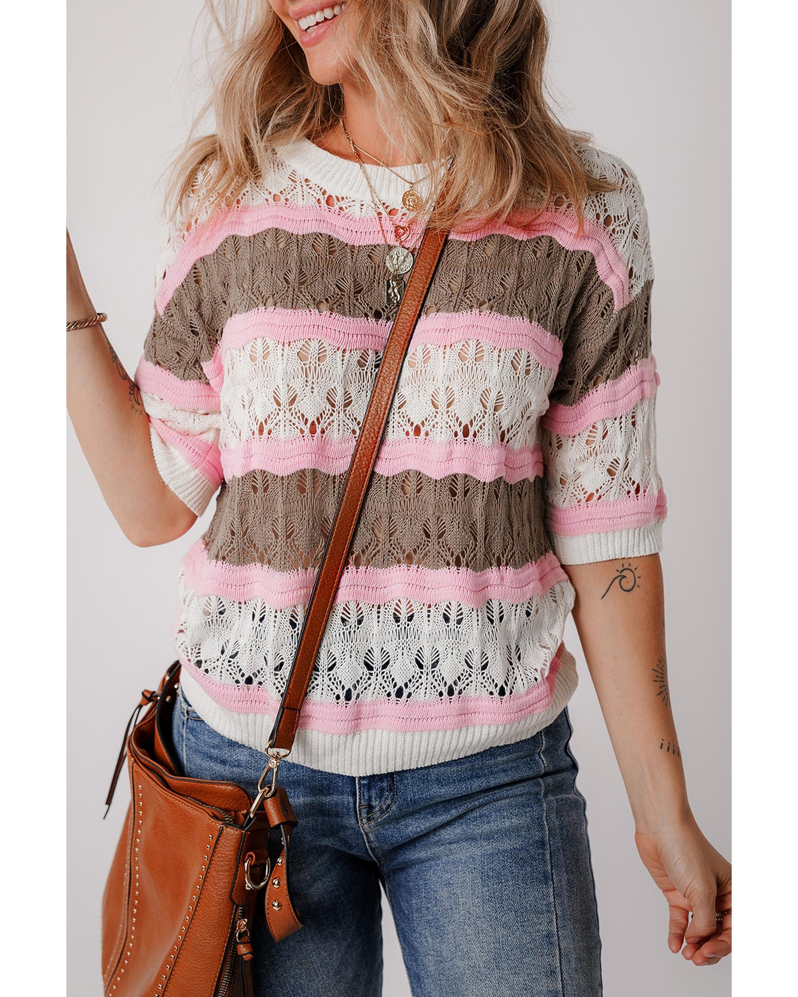 - Brown Stripe Color Block Hollow Out Crochet Half Sleeve Sweater
