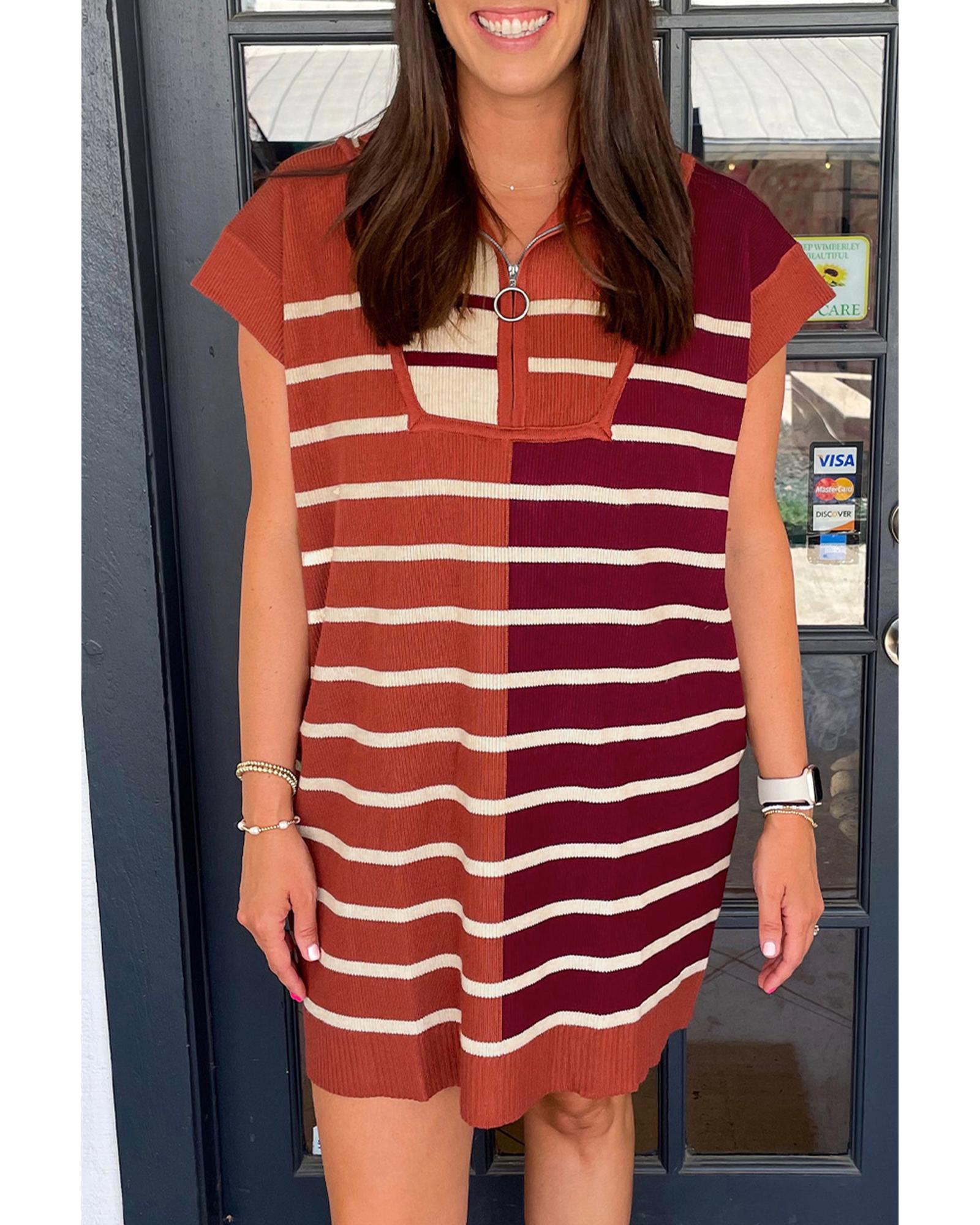 Brown Stripe Color Block Quarter Zip Collar Short Sleeve Sweater Dress – L