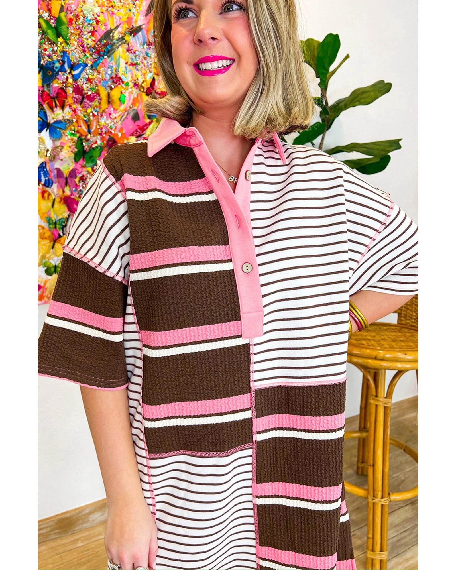 - Brown Stripe Striped Textured Patchwork Buttoned T