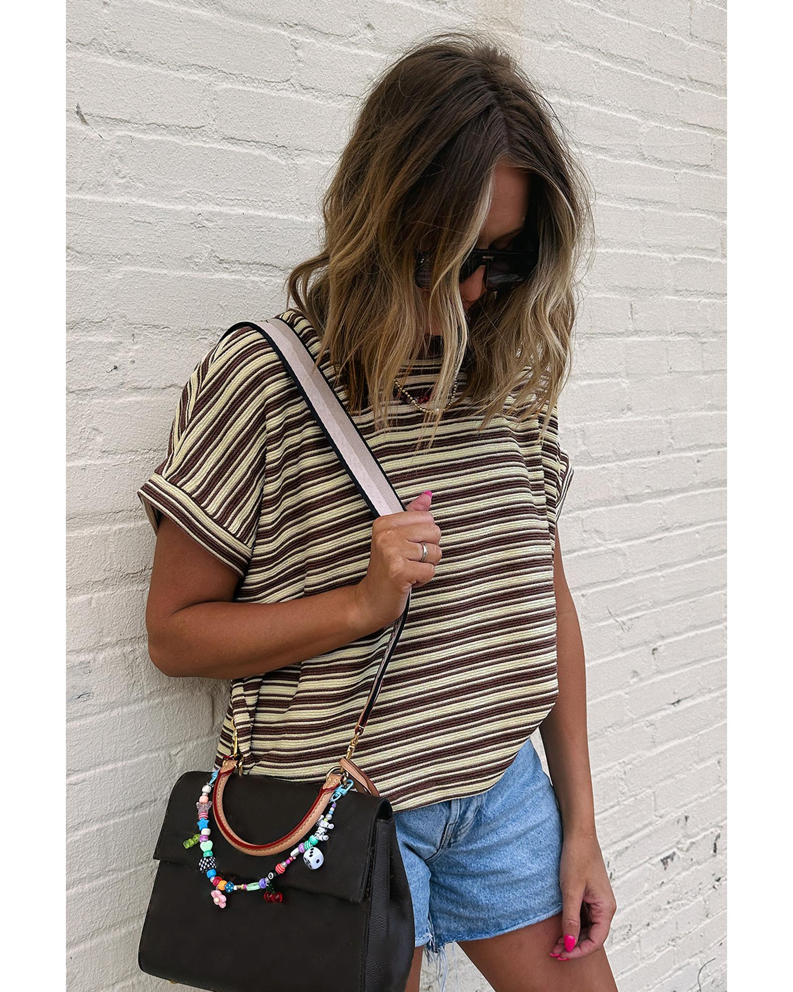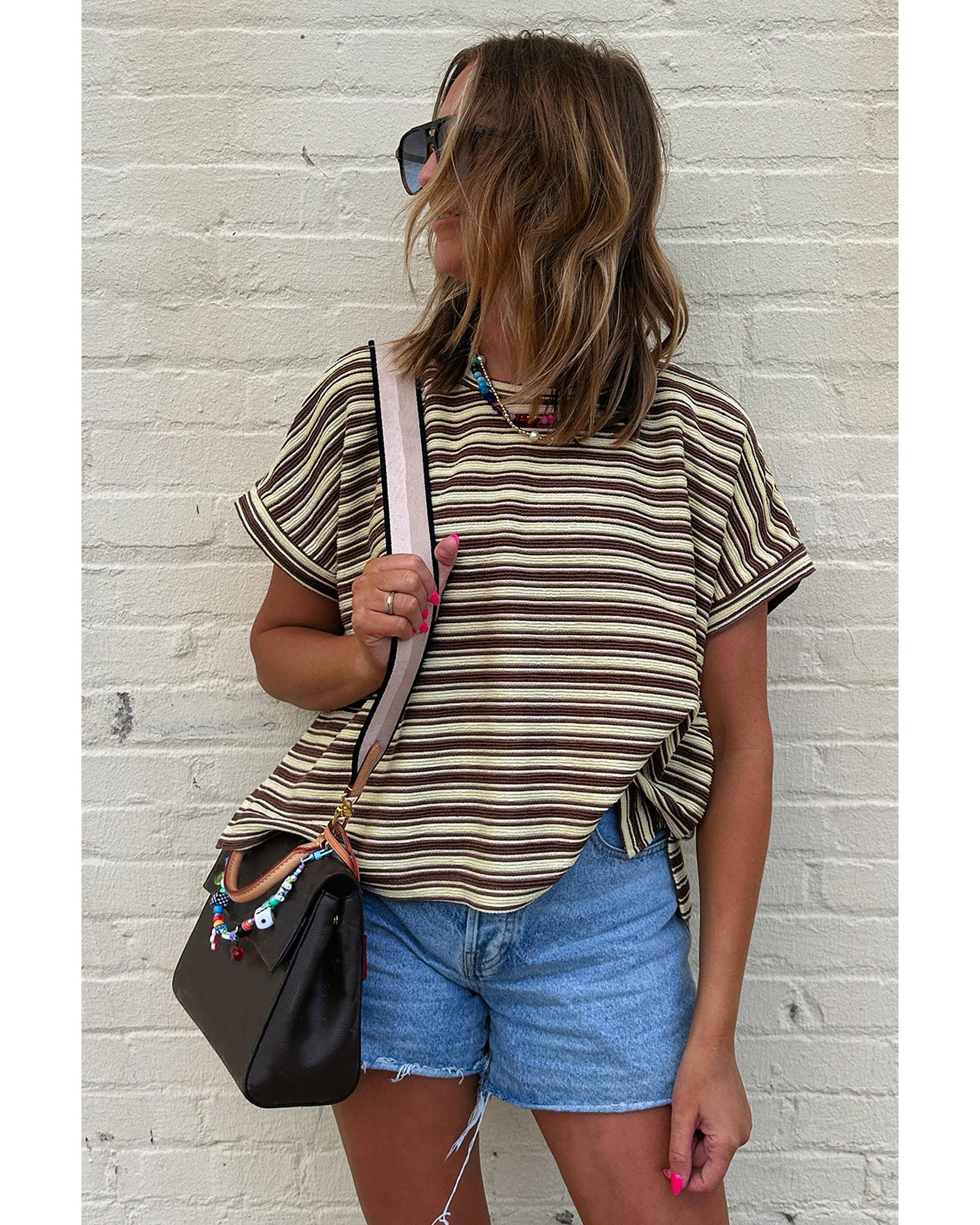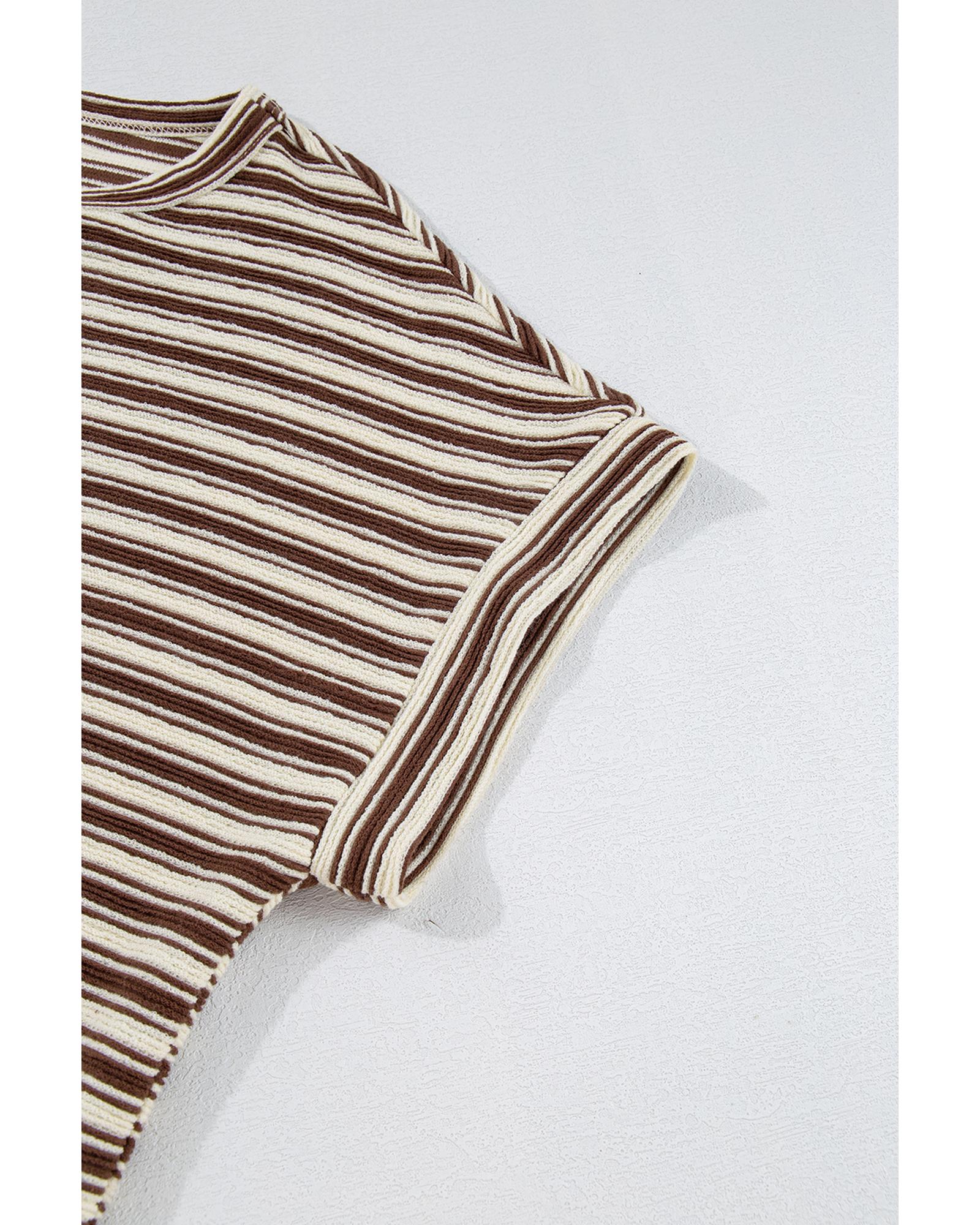 Brown Stripe Textured Side Slits Crew Neck T Shirt – M