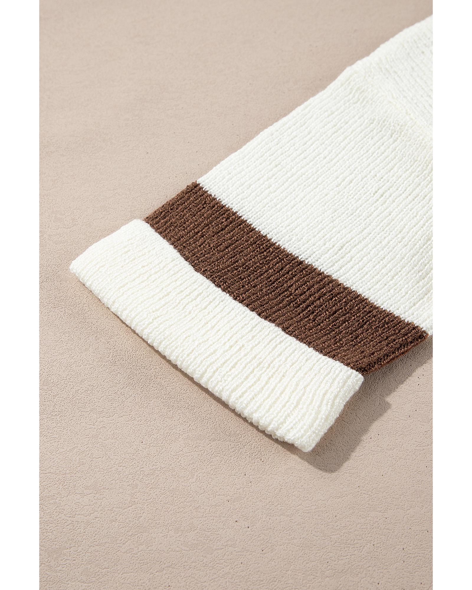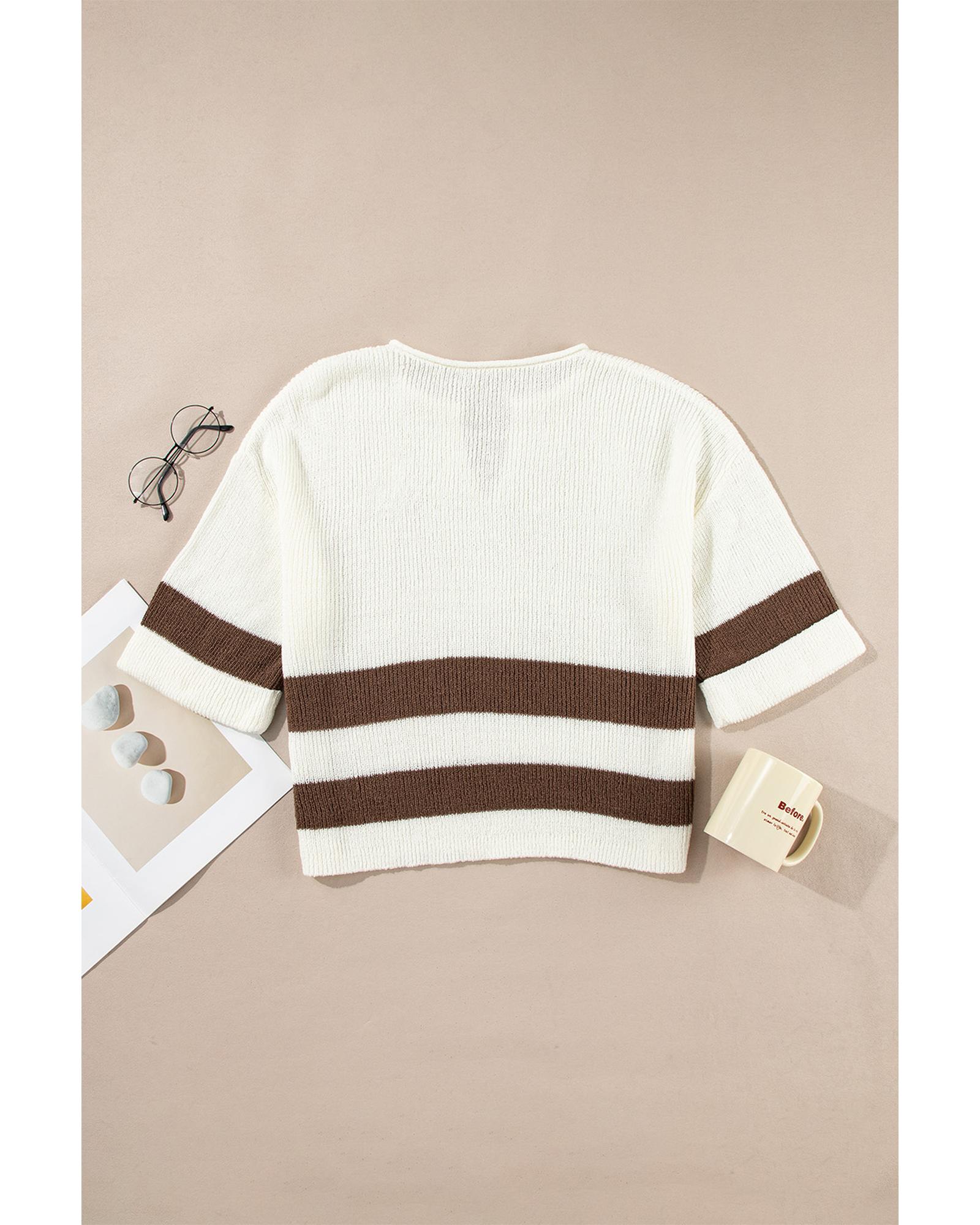 - Brown Striped Accent Notched V Neck Cropped Sweater T Shirt