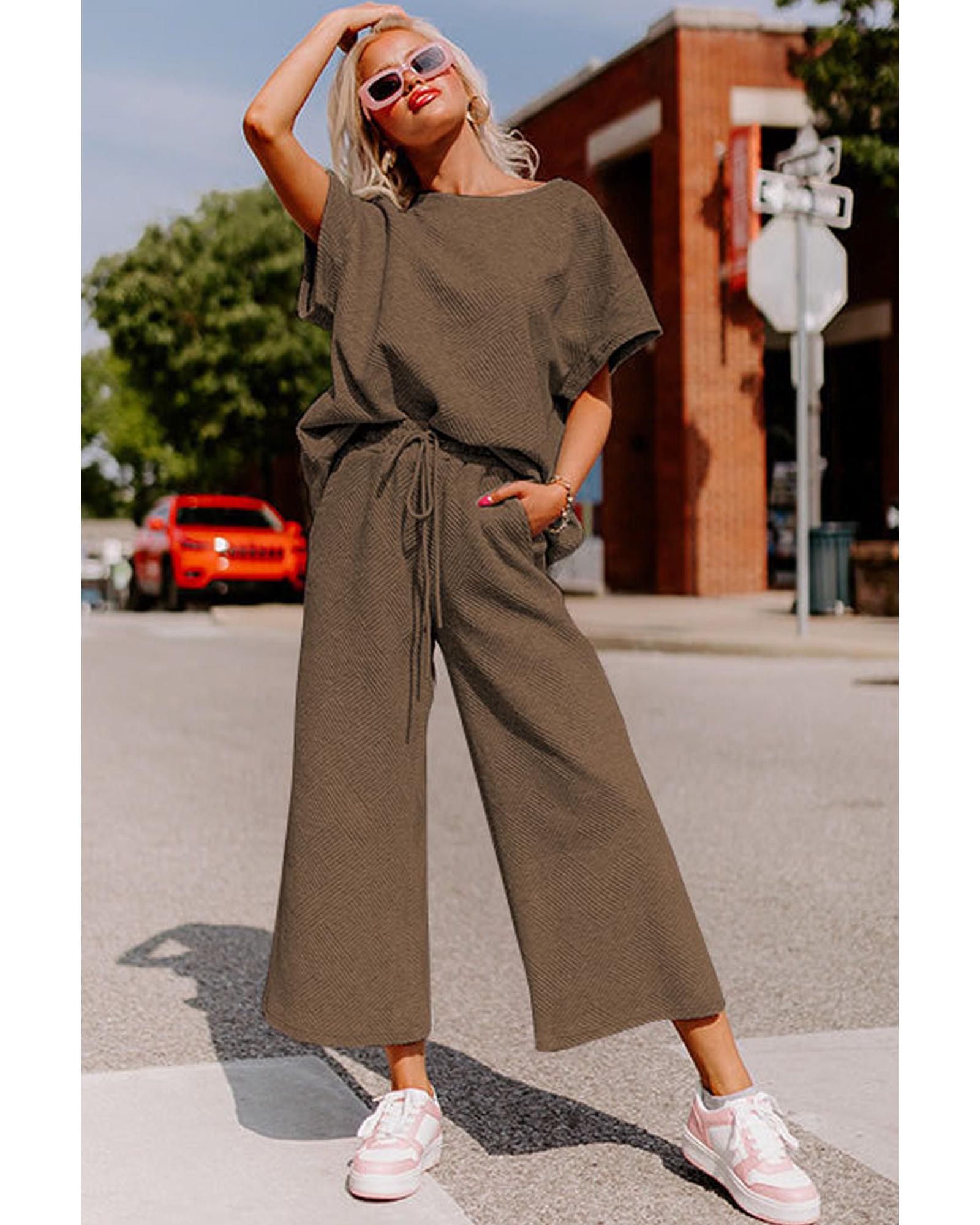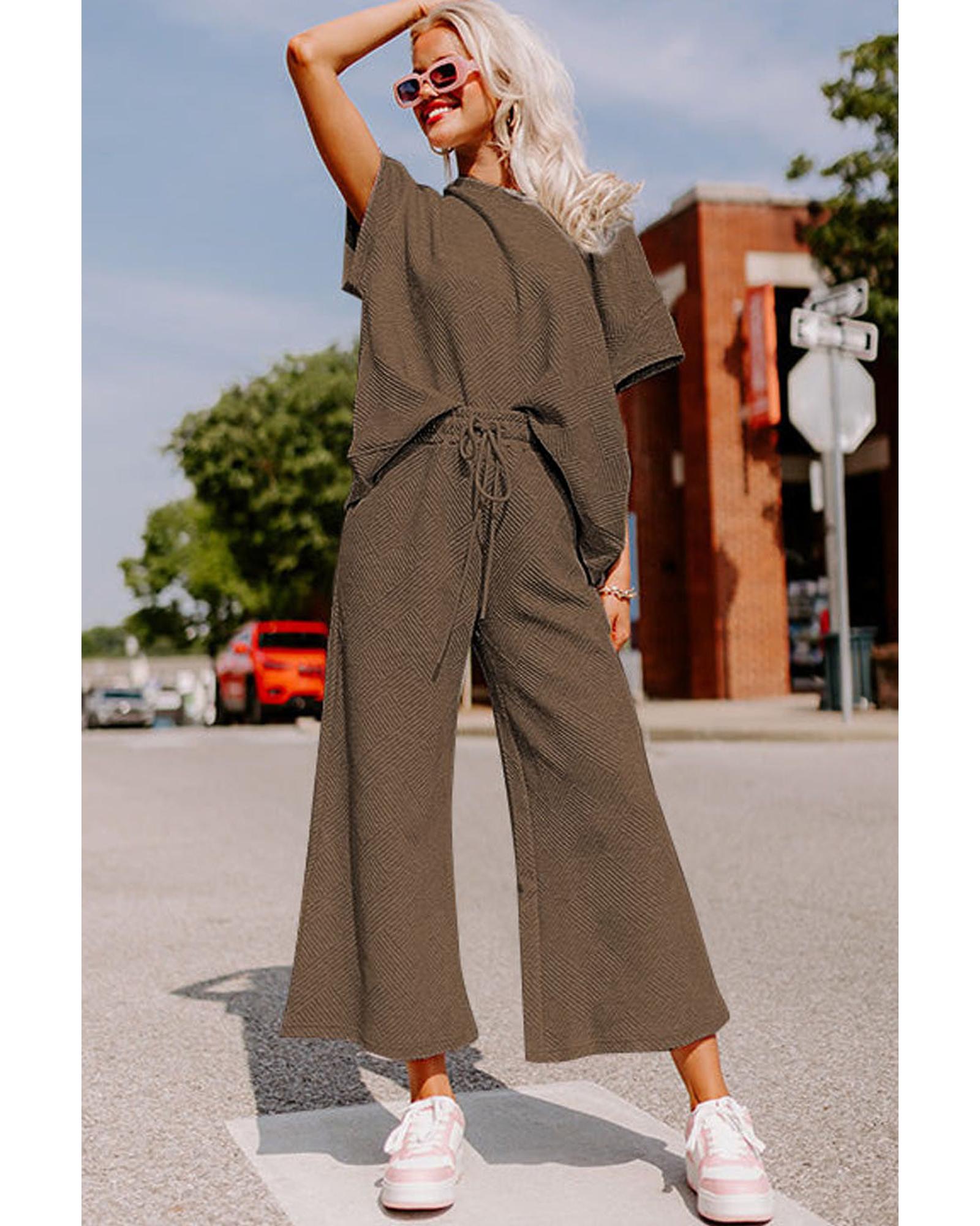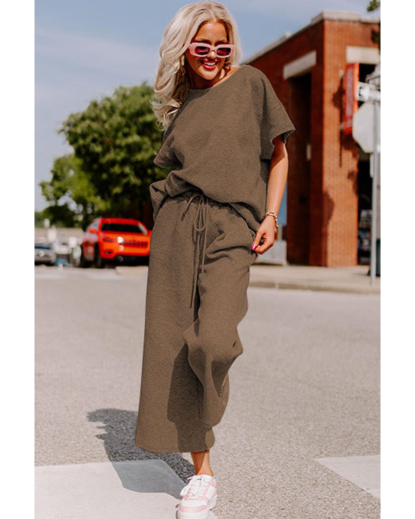 Brown Textured Loose Fit T Shirt and Drawstring Pants Set – L