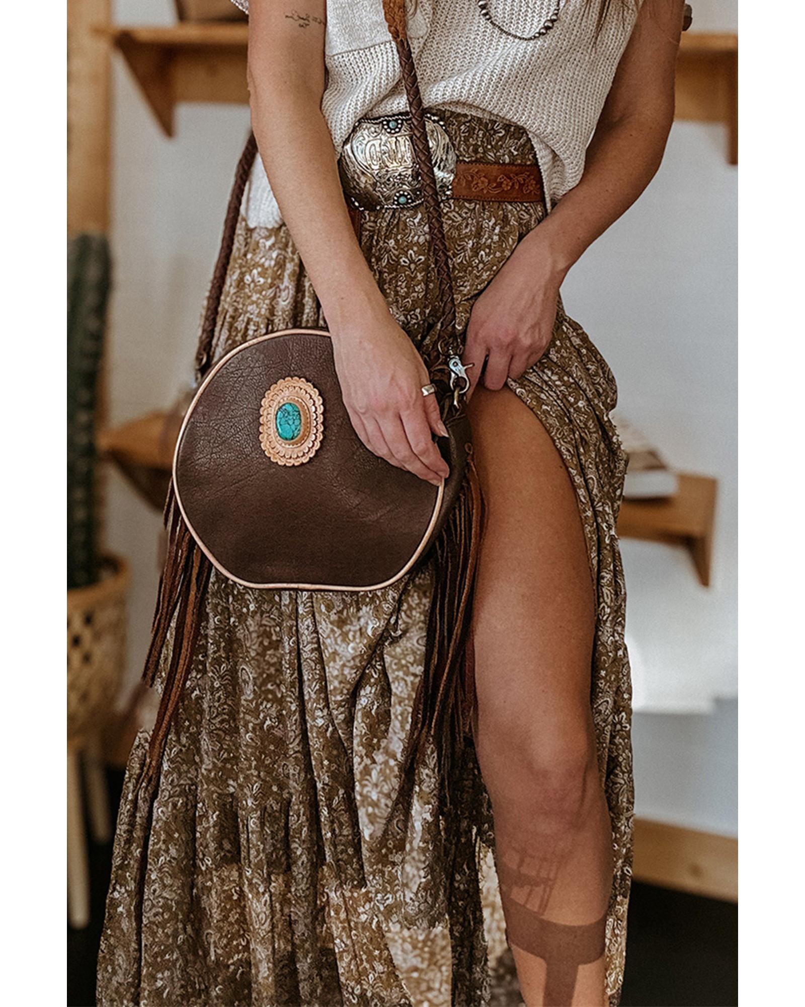 • Brown Western Floral Print Ruffled Hem High Waist Loose Maxi Skirt