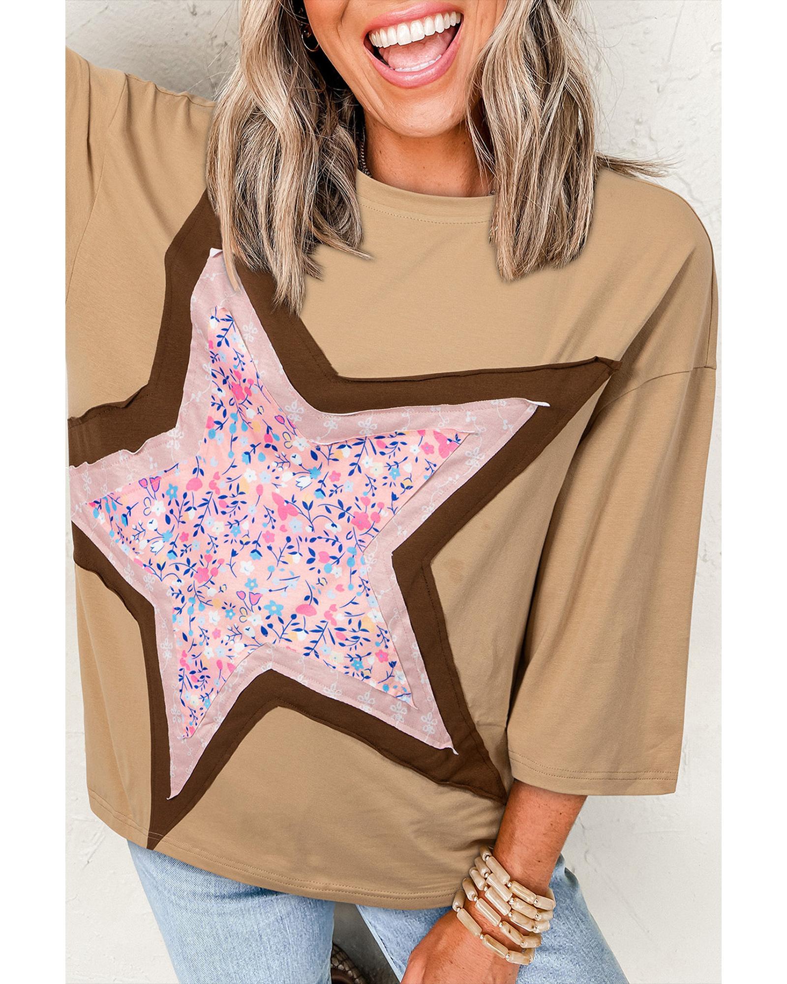 Camel Floral Star Patchwork 3/4 Long Sleeve Top – M