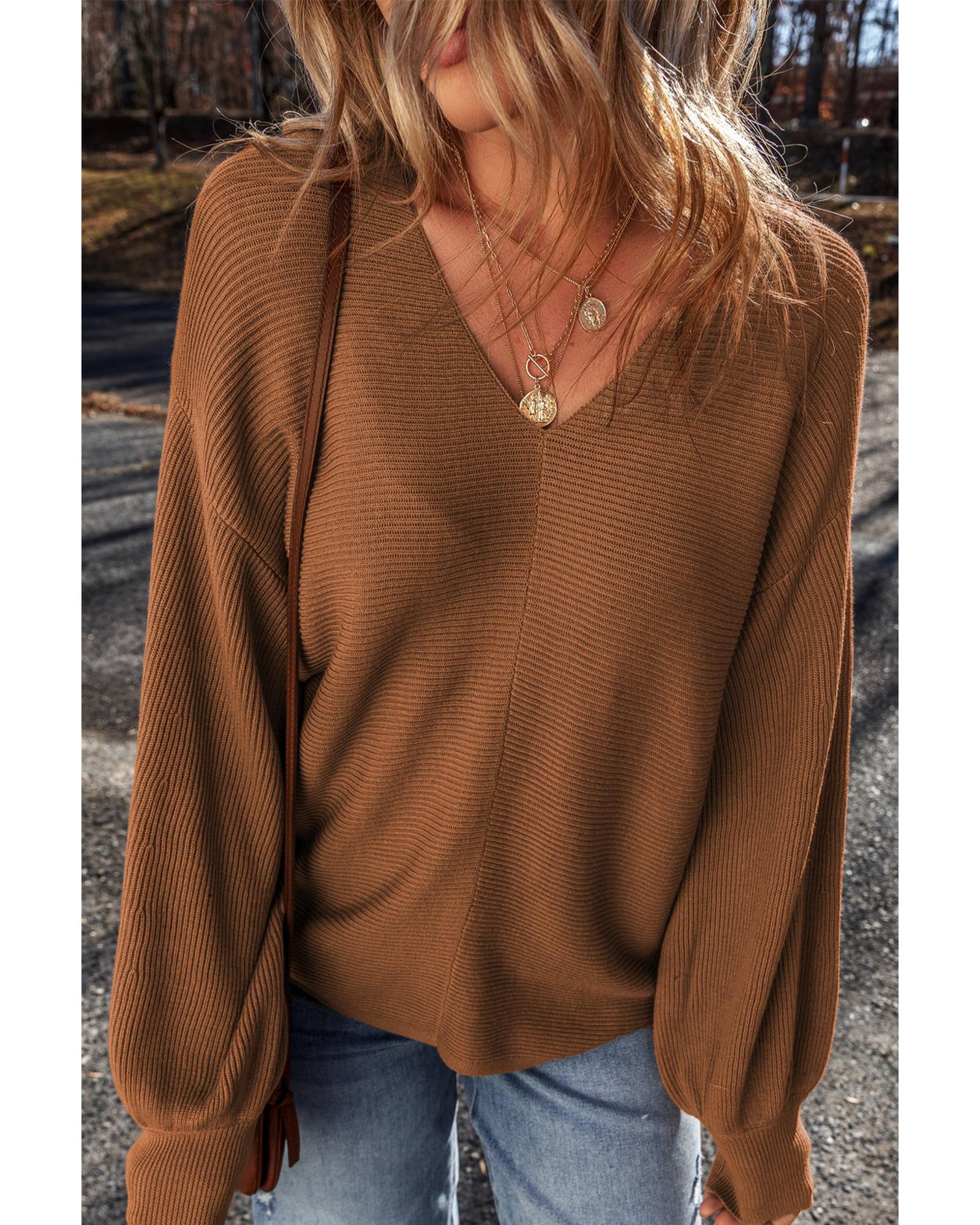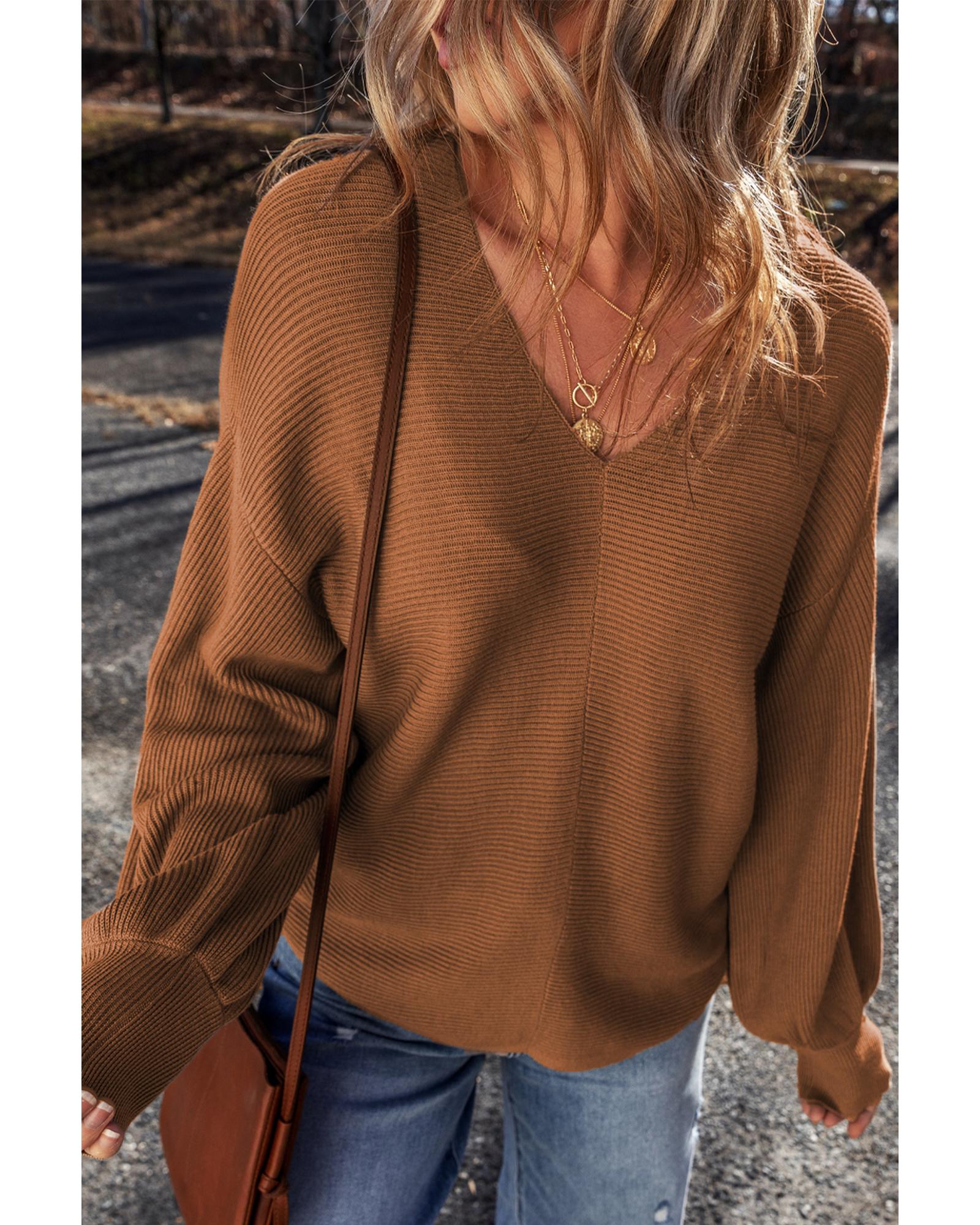 Camel Ribbed Knit Drop Sleeve V Neck Loose Fit Sweater - S Original price was: $70.99.Current price is: $37.99.