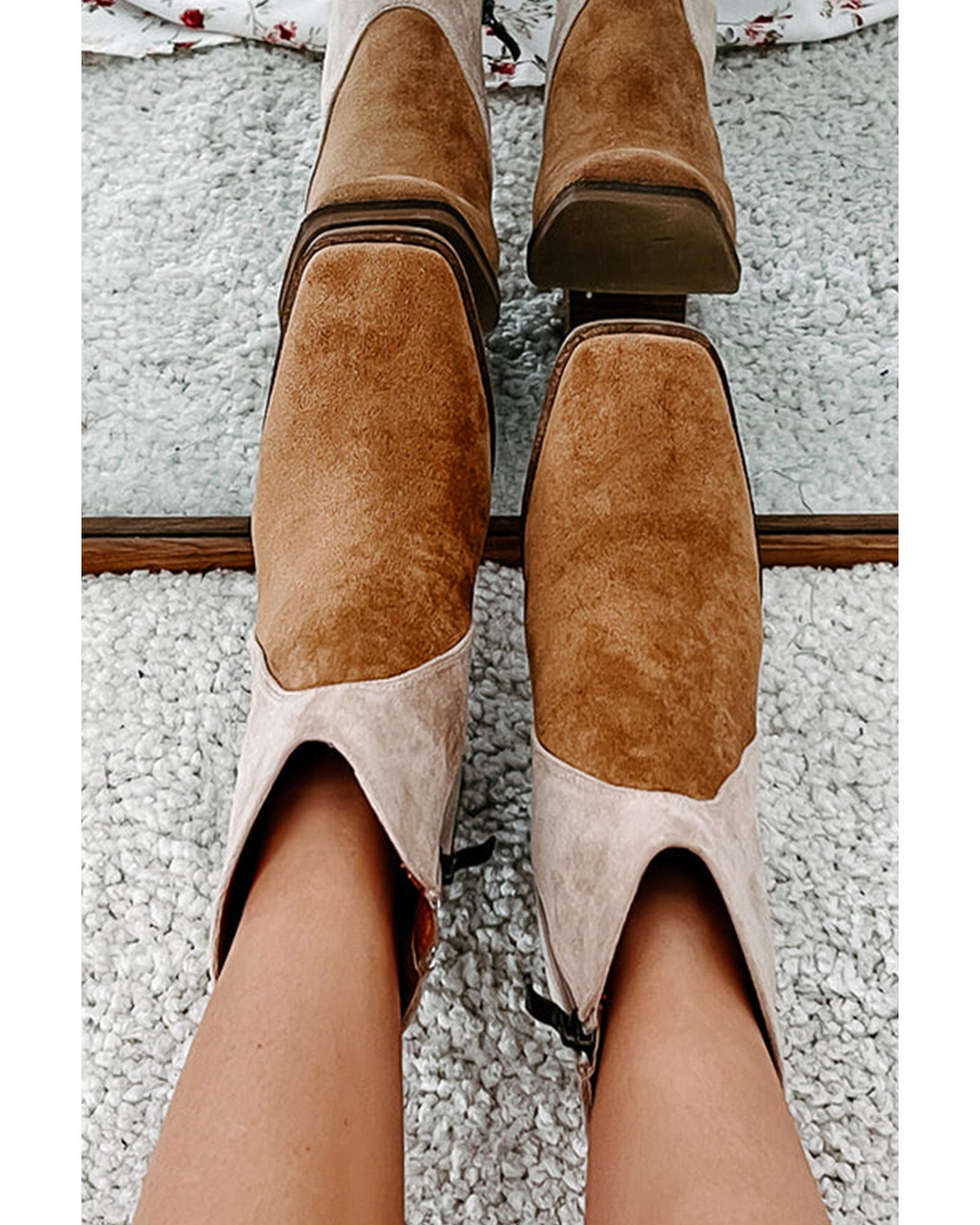 Camel Two Tone Faux Suede Square Toe Chunky Heel Boots – 37 EU