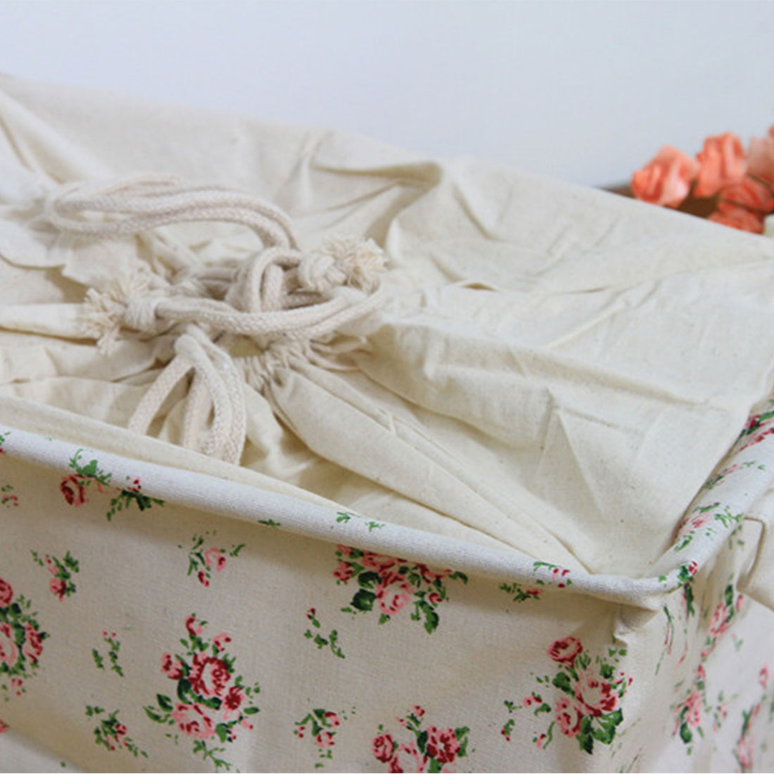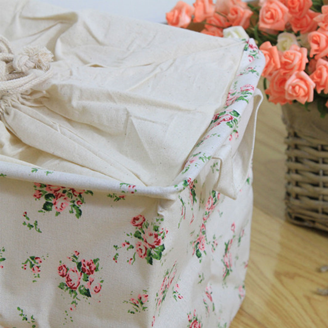 Canvas Zakka Vintage Drawstring Storage Laundry Shopping Basket Fold Bin Flower