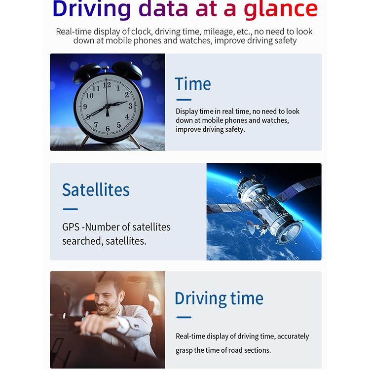 • Displays driving speed, battery voltage, number of satellites, single driving distance, real-time time, altitude, compass, and mile switch