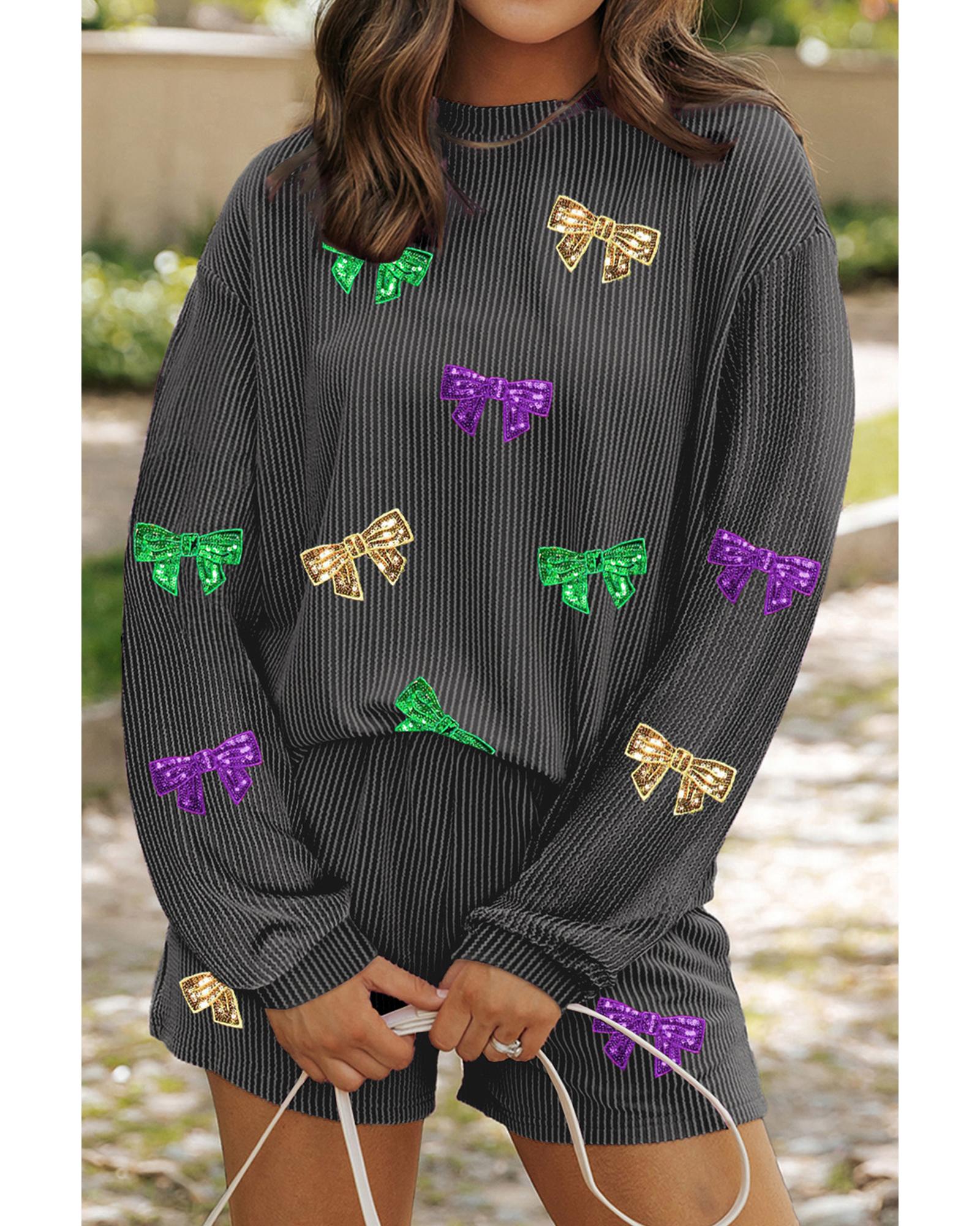 Carbon Grey Bowknot Patched Pattern Corded Long Sleeve Top and Shorts Outfit - M