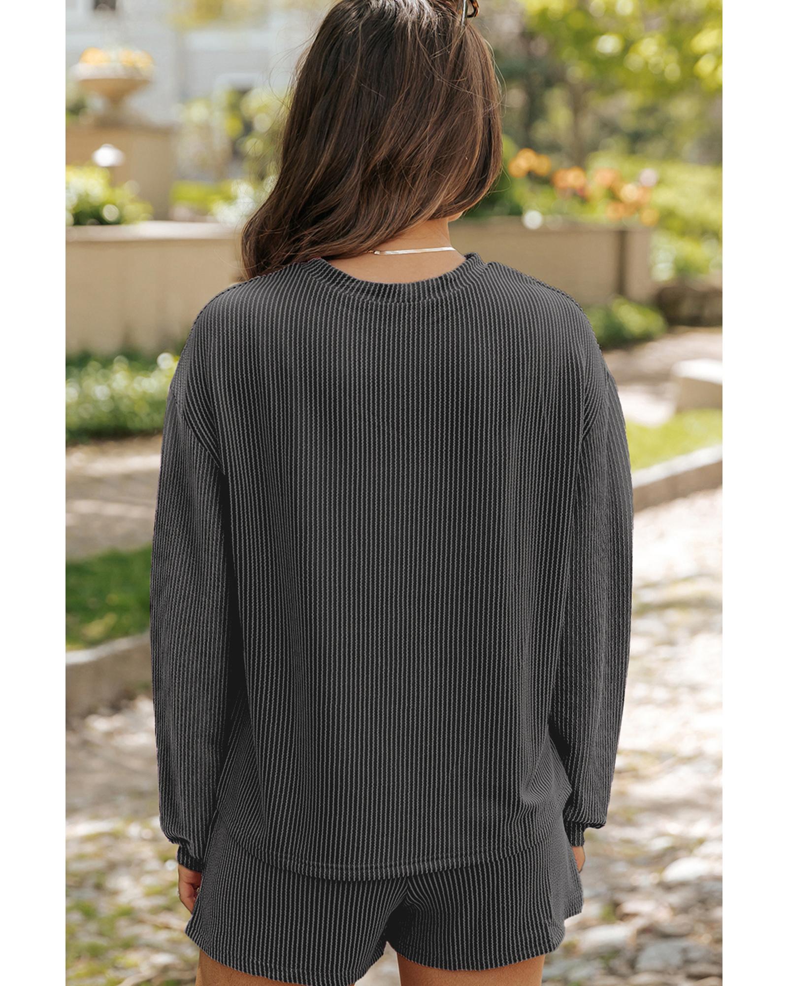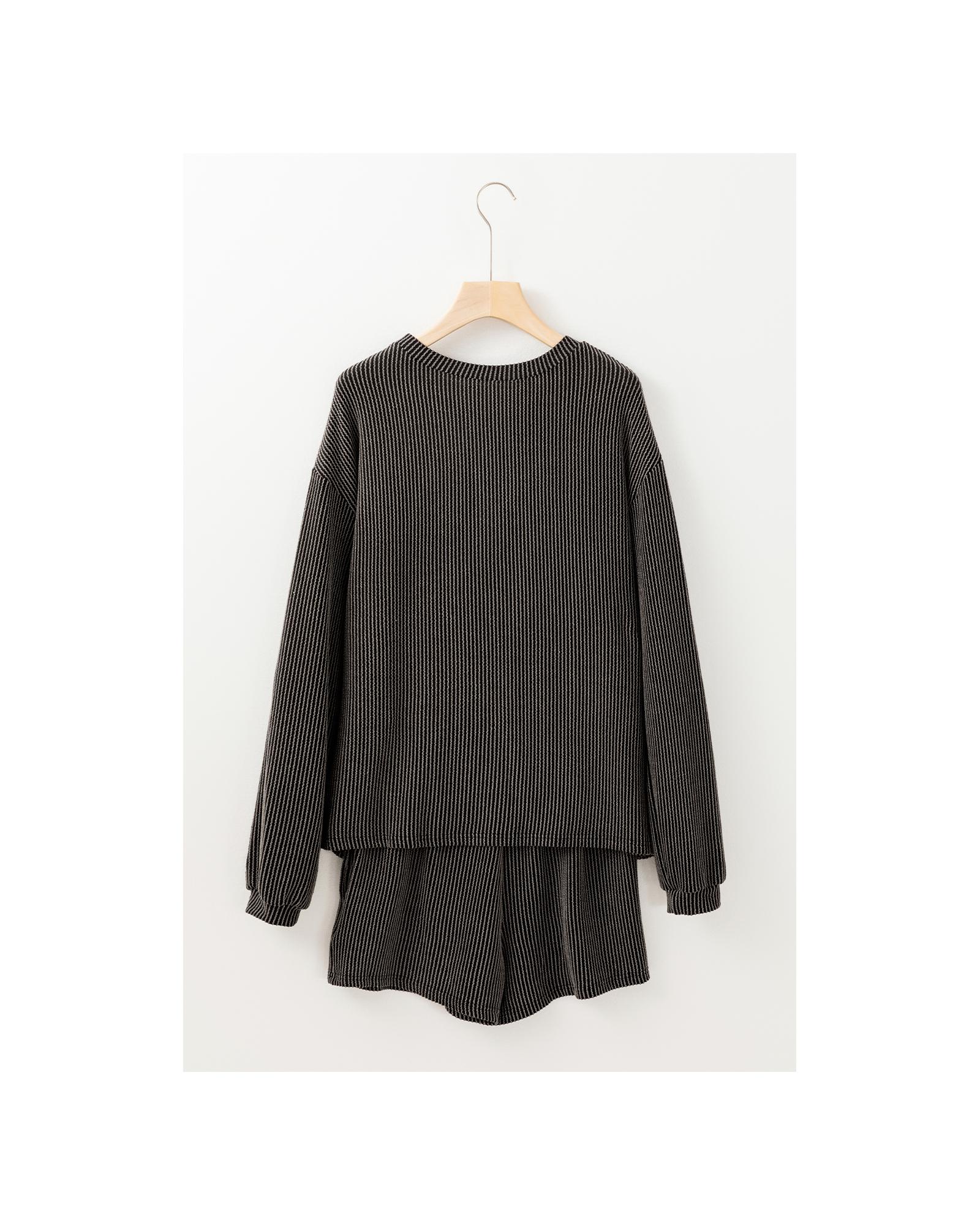 Carbon Grey Bowknot Patched Pattern Corded Long Sleeve Top and Shorts Outfit – S