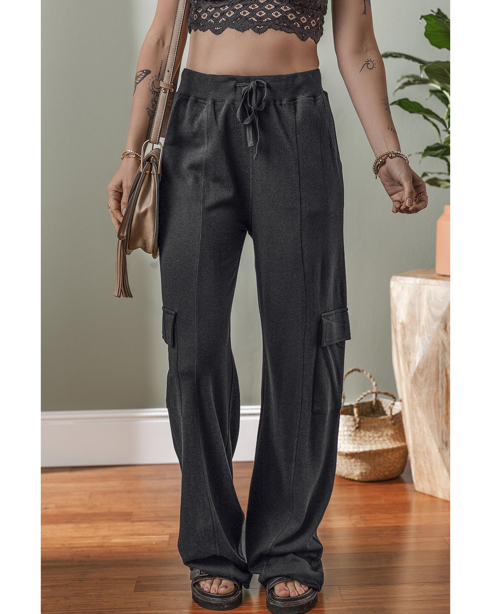 Black Stripe Lace-up Waist Casual Flared Pants - L