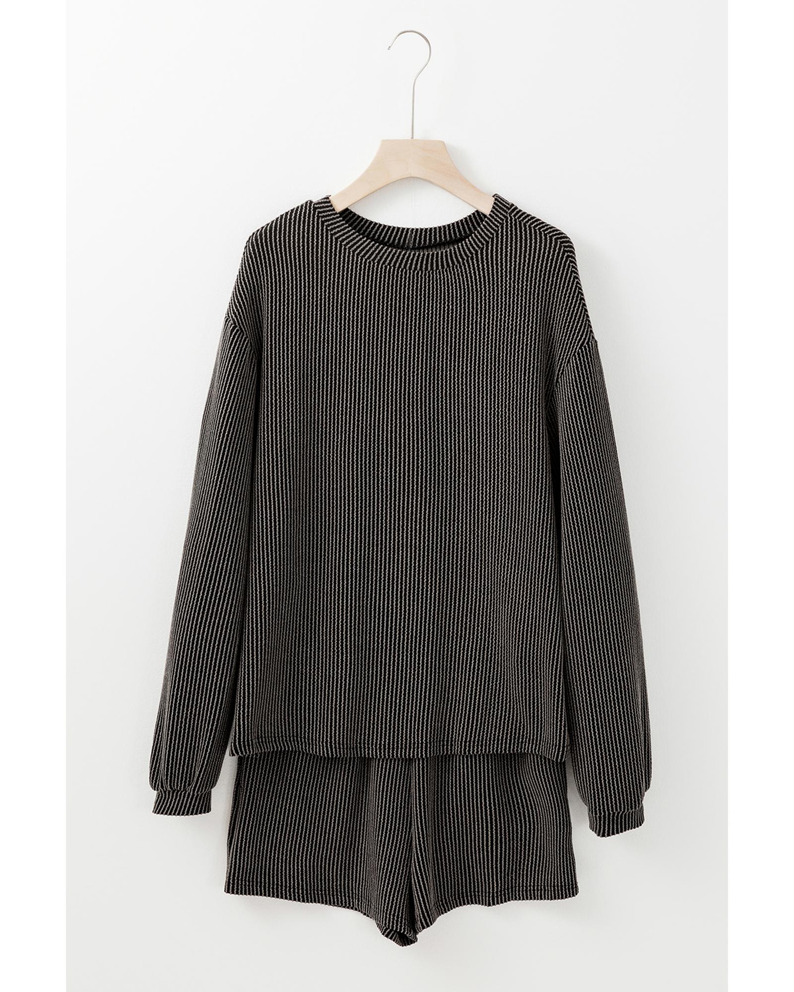 Carbon Grey Corded Knit Long Sleeve Top and High Waist Shorts Set – L