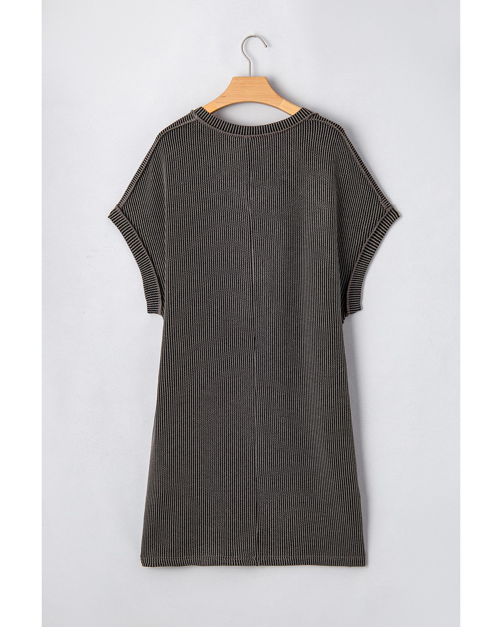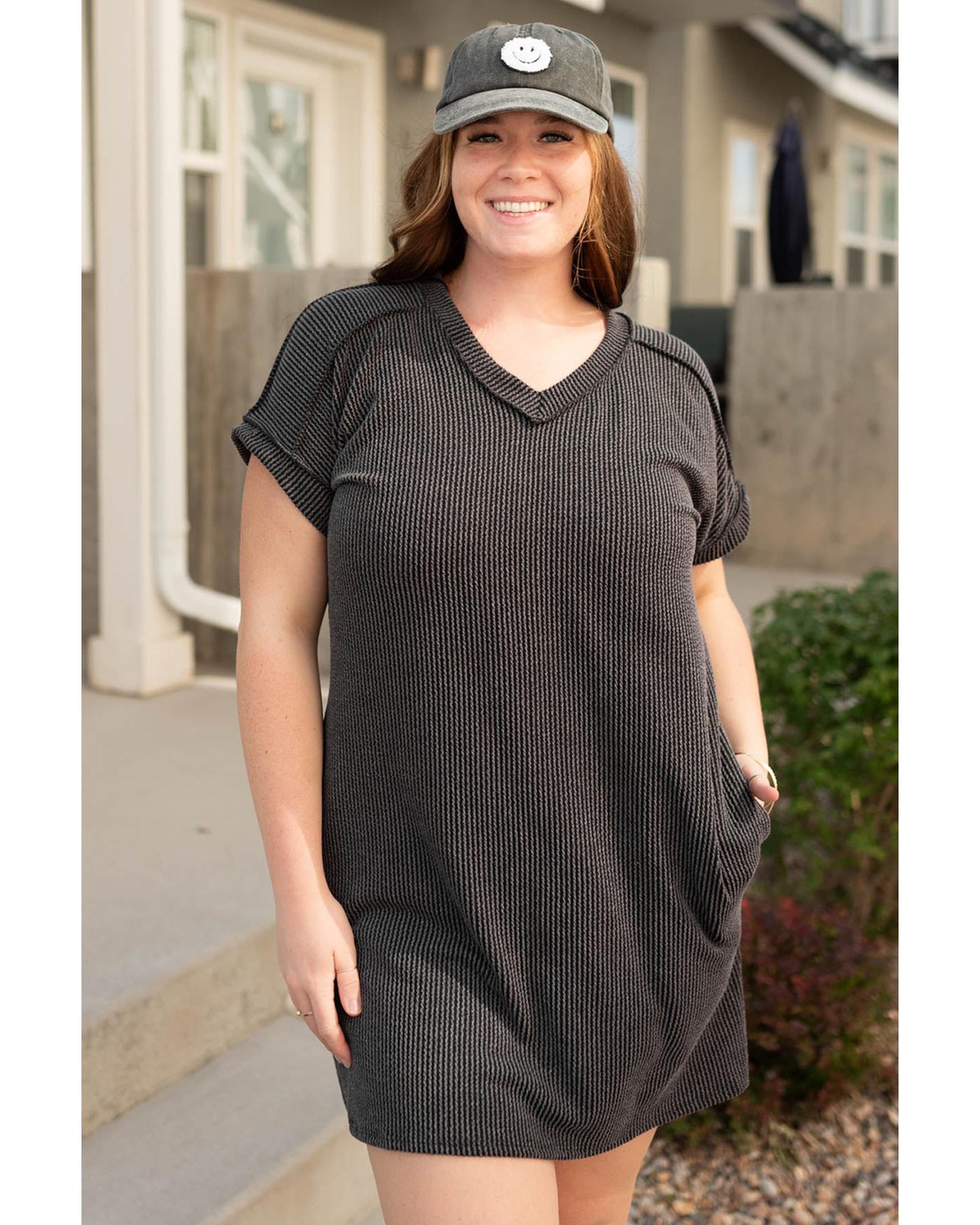Carbon Grey Corded V Neck Plus Size T Shirt Dress with Pockets – 1X