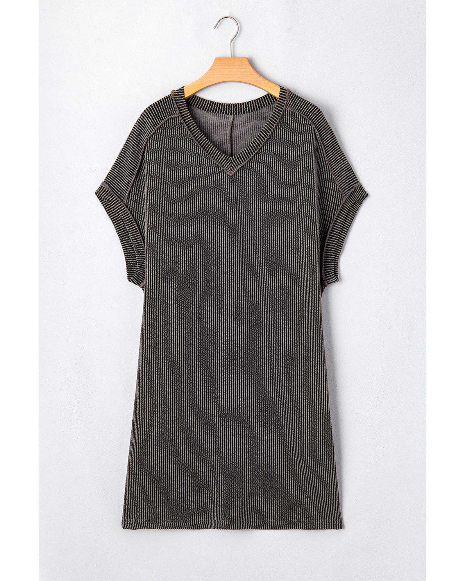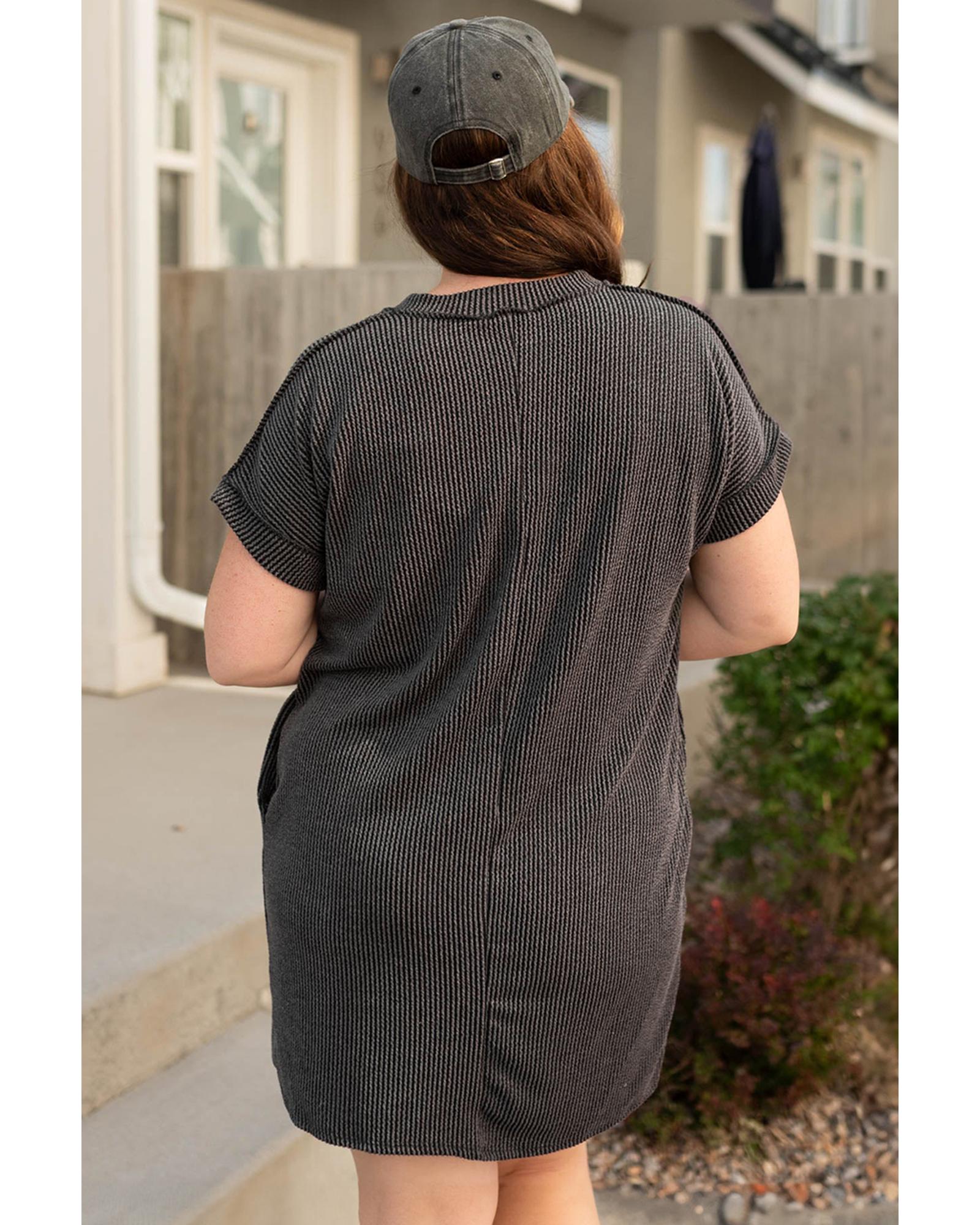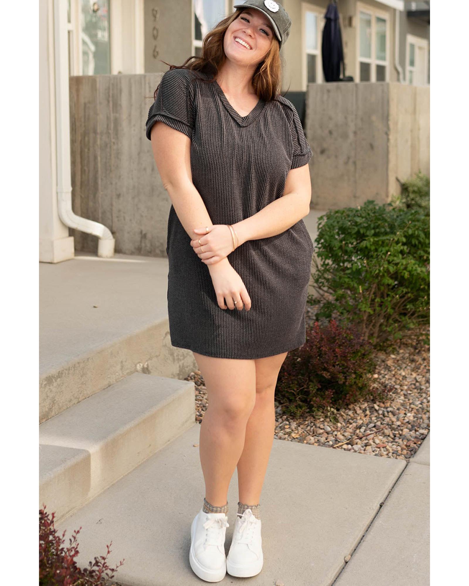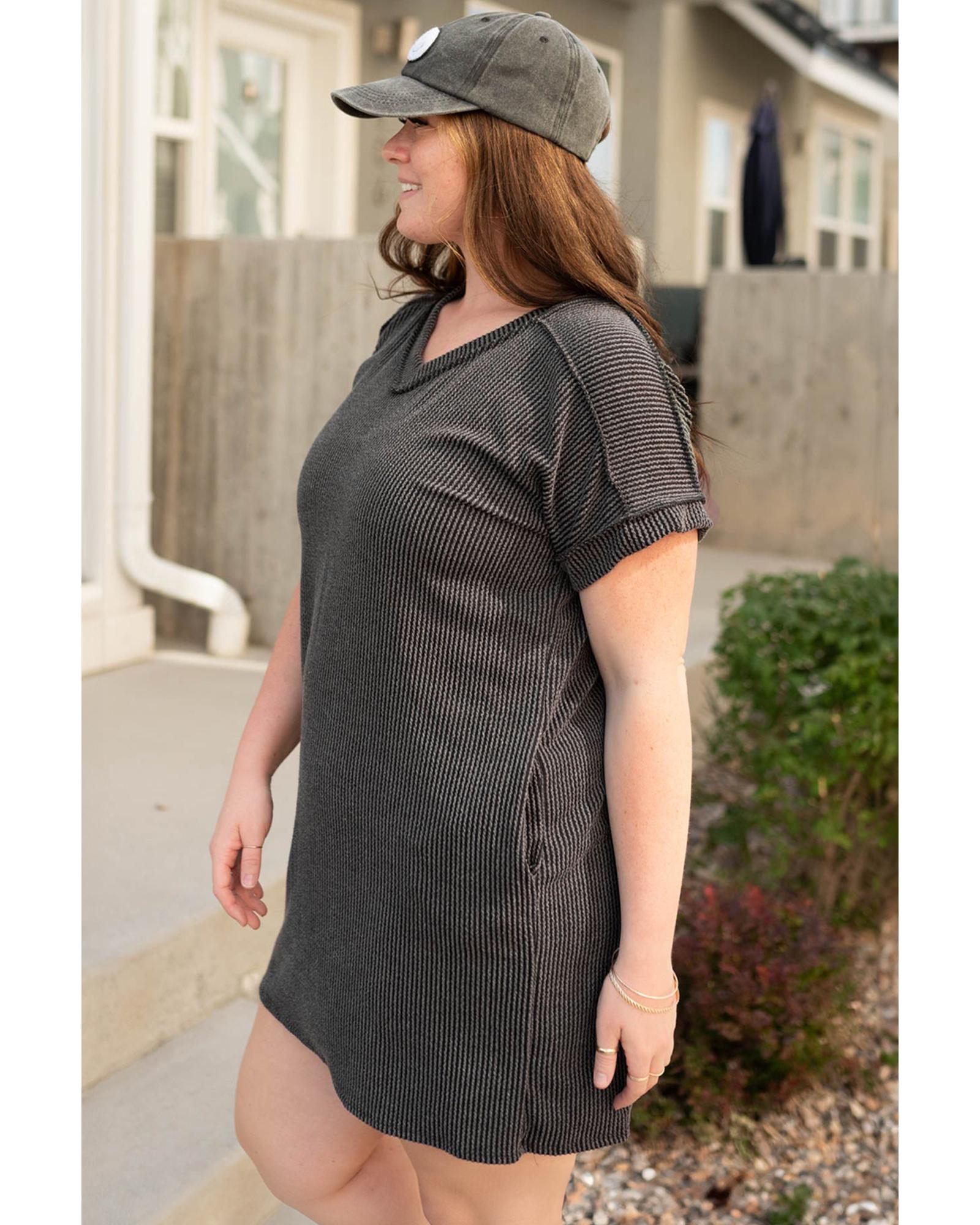 Carbon Grey Corded V Neck Plus Size T Shirt Dress with Pockets – 3X
