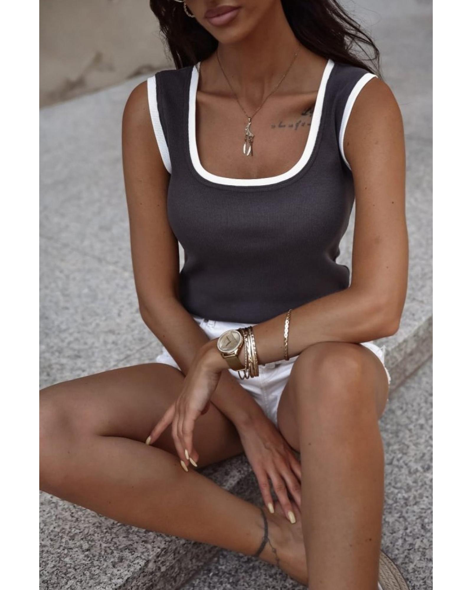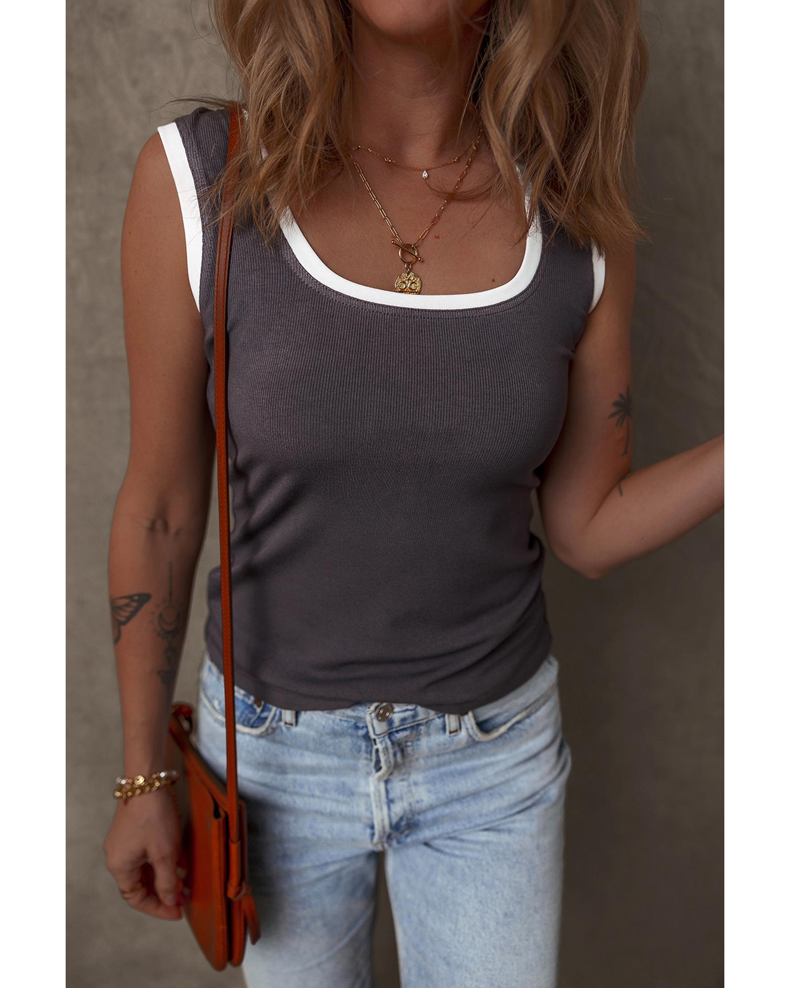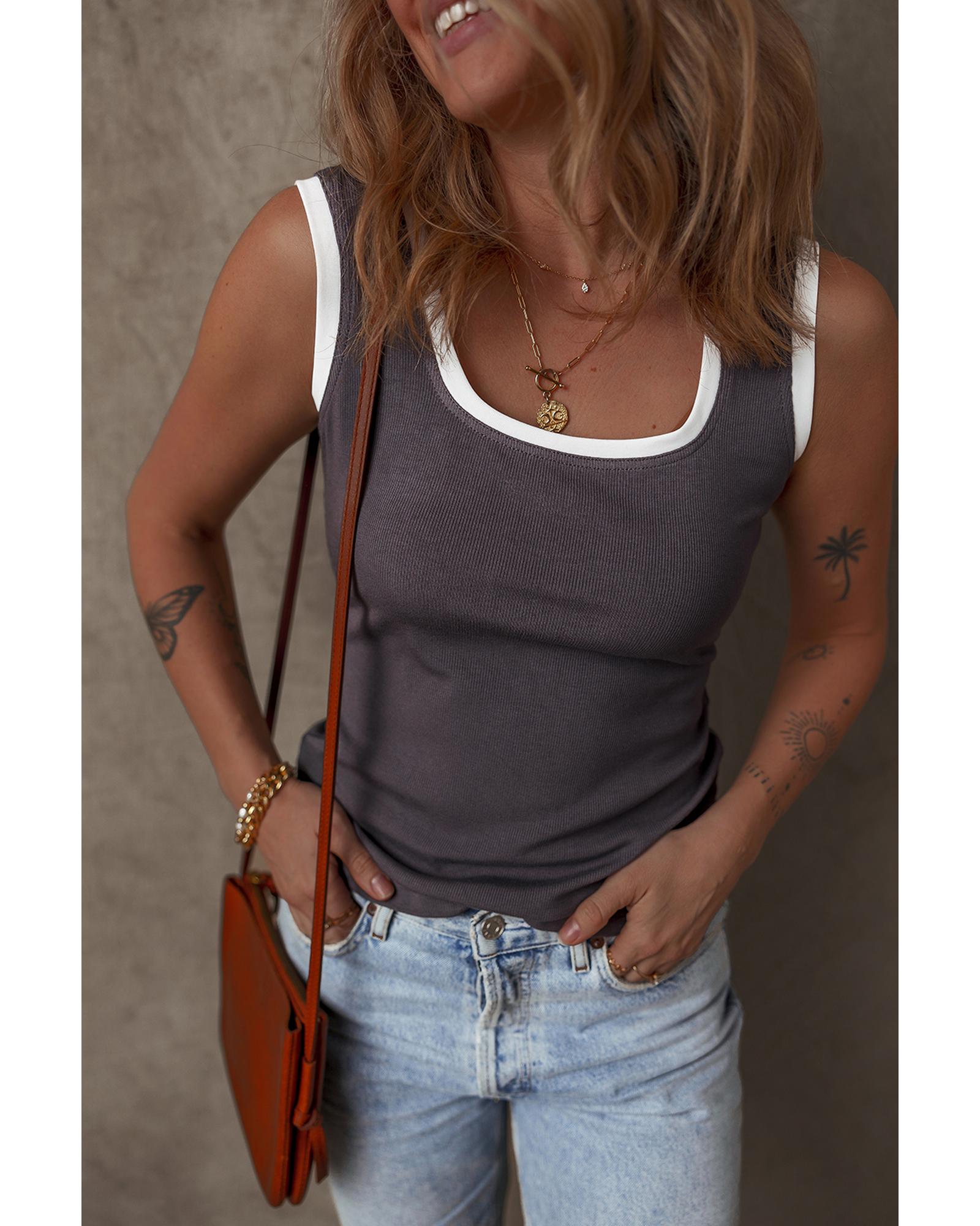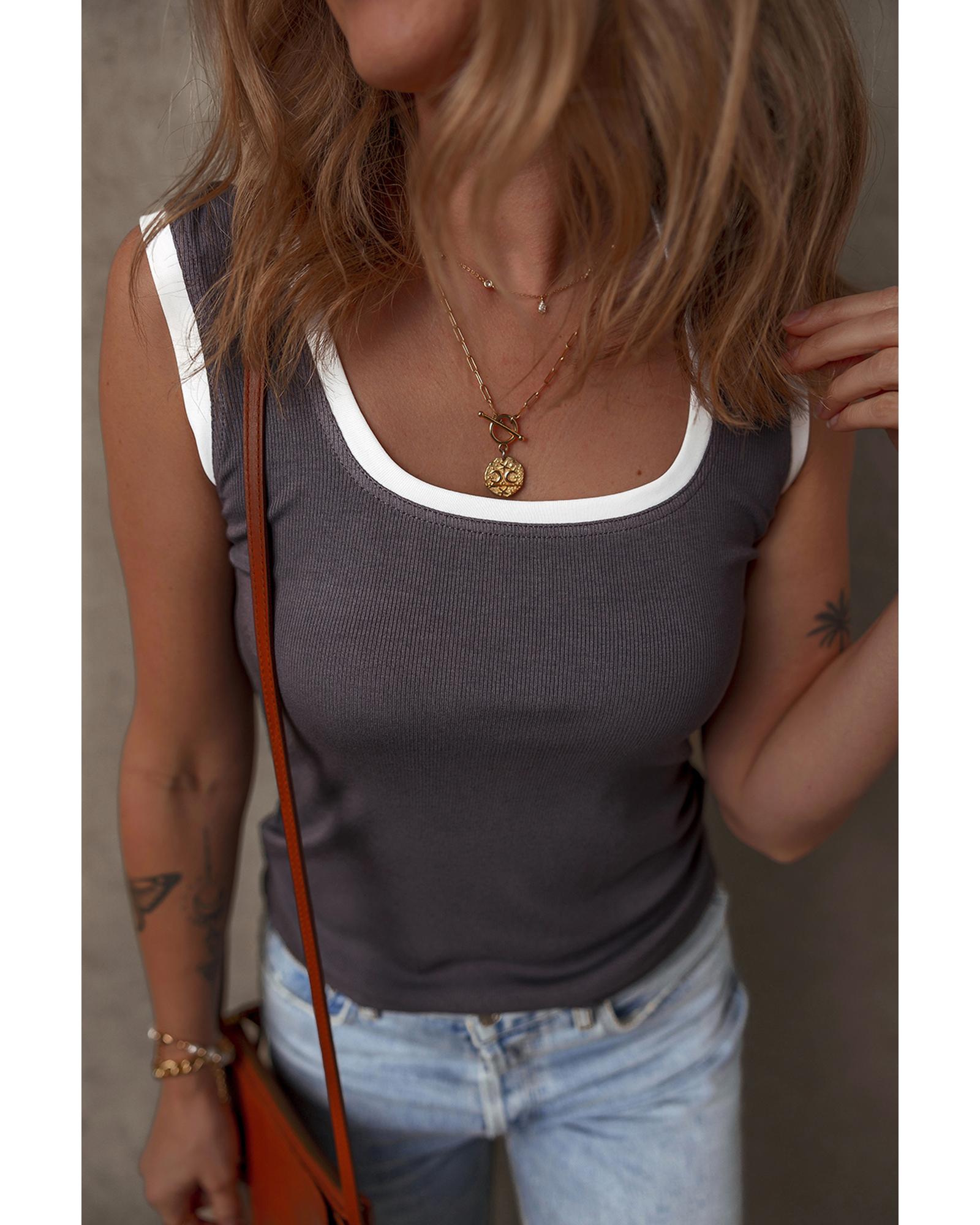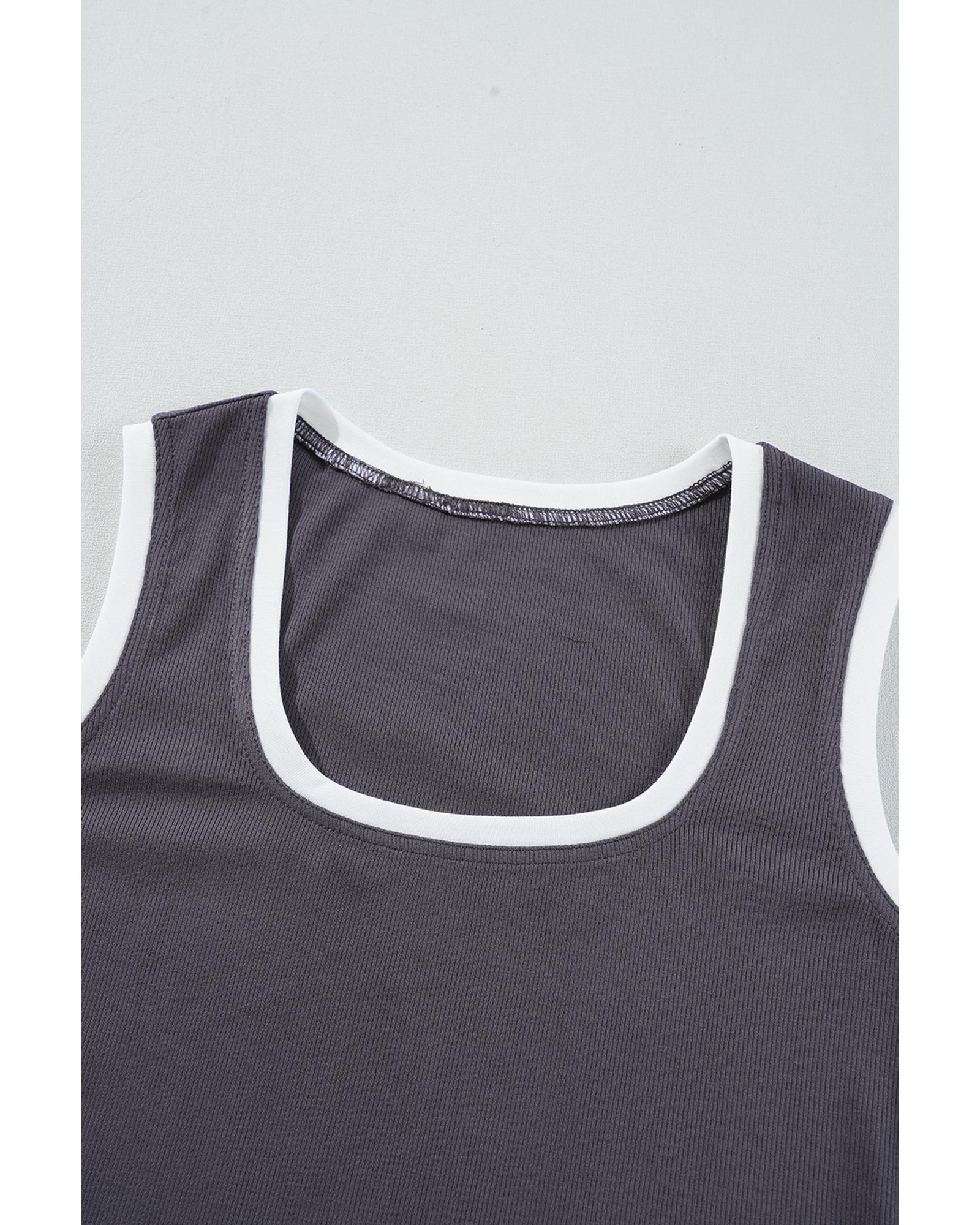 Carbon Grey Ribbed Knit Colorblock Edge U Neck Slim Fit Tank Top – S
