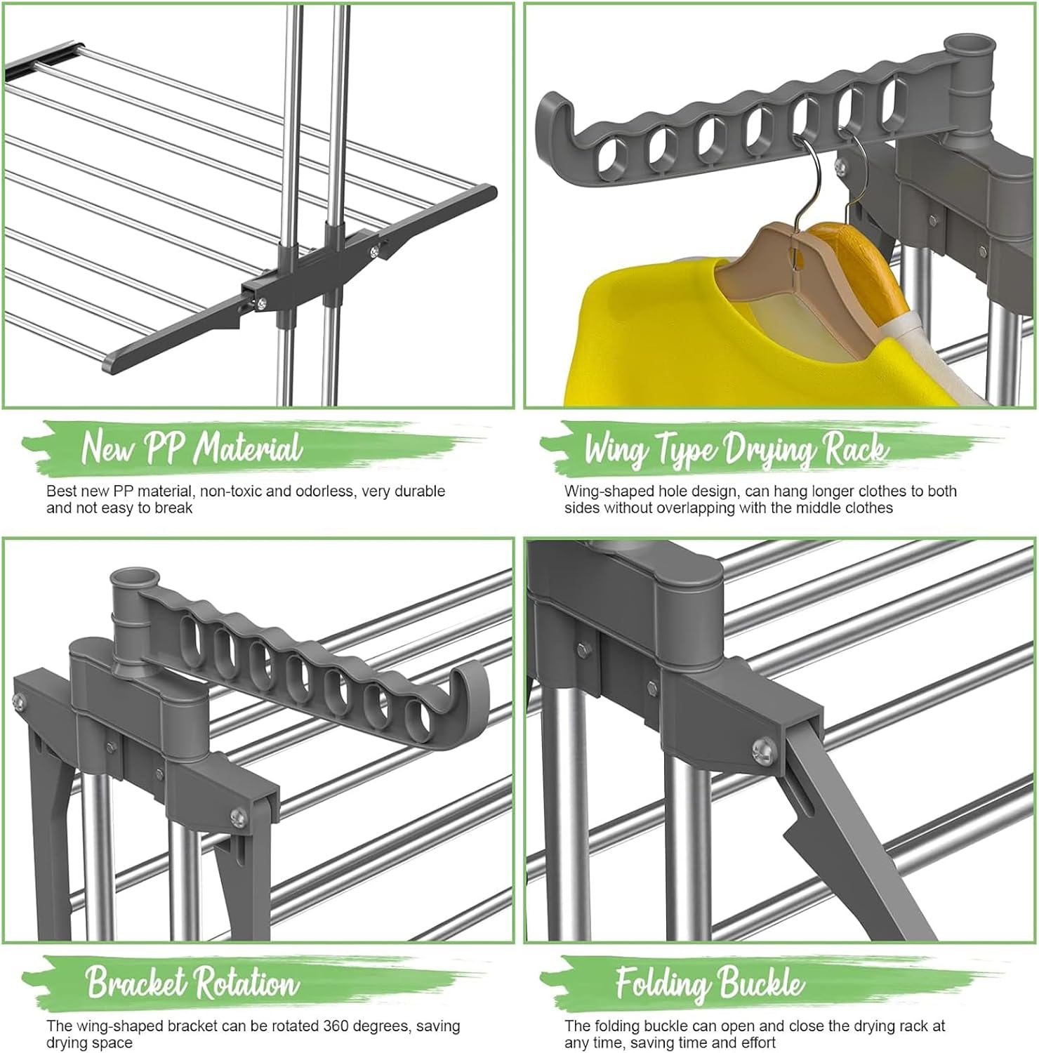 - HEAVY-DUTY & DURABLE DESIGN: Built with thick stainless steel and premium ABS connectors, this 4-tier drying rack offers exceptional stability and a max load capacity up to 50 kg, making it ideal for heavy garments, towels, and more.