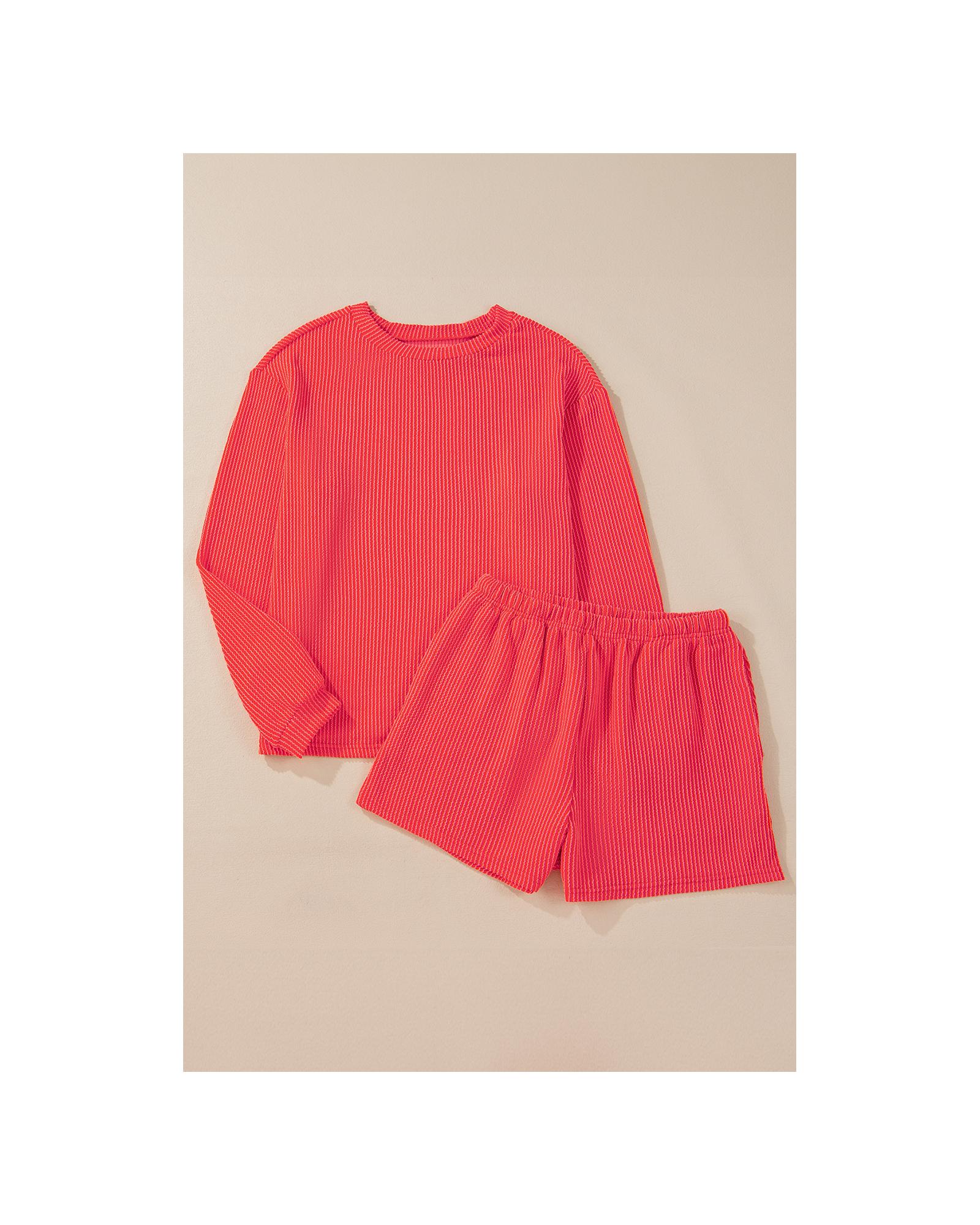 - Casual Corded Knit Long Sleeve Top and High Waist Shorts Set