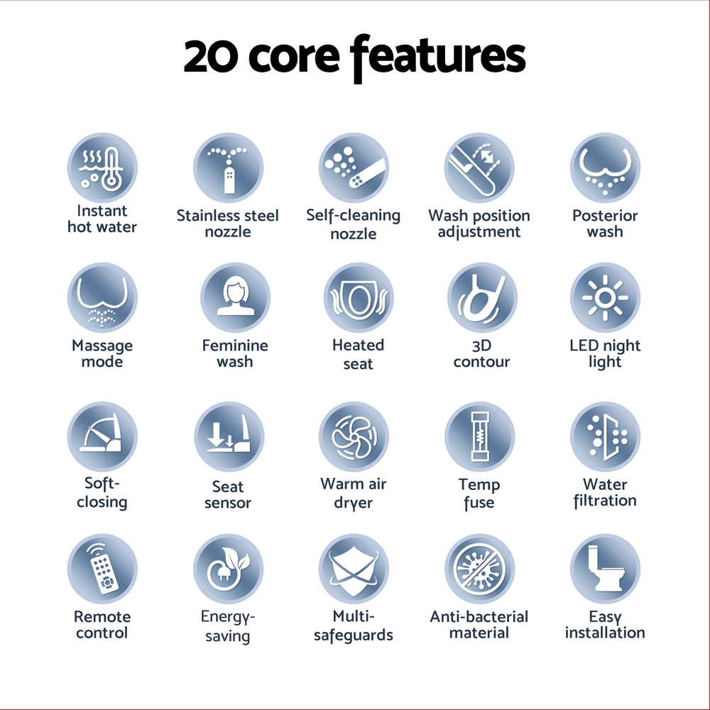 Transform your bathroom into a sanctuary of cleanliness comfort with the Cefito Smart Bidet Toilet Seat. This electronic bidet boasts IPX4 waterproofing and a user-friendly one-knob with adjustable water temperature (up to 40��) and spray intensity. Key features include a self-cleaning stainless steel nozzle, LED night light, and automatic deodorisation. Experience luxury with a heated seat (up to 40��) and warm air dryer. Designed for energy-saving, this Bidet Toilet Seat includes water-filtering and multi-safeguards for peace of mind. Its slow-closing lid adds quiet convenience to your toilet bidet experience.