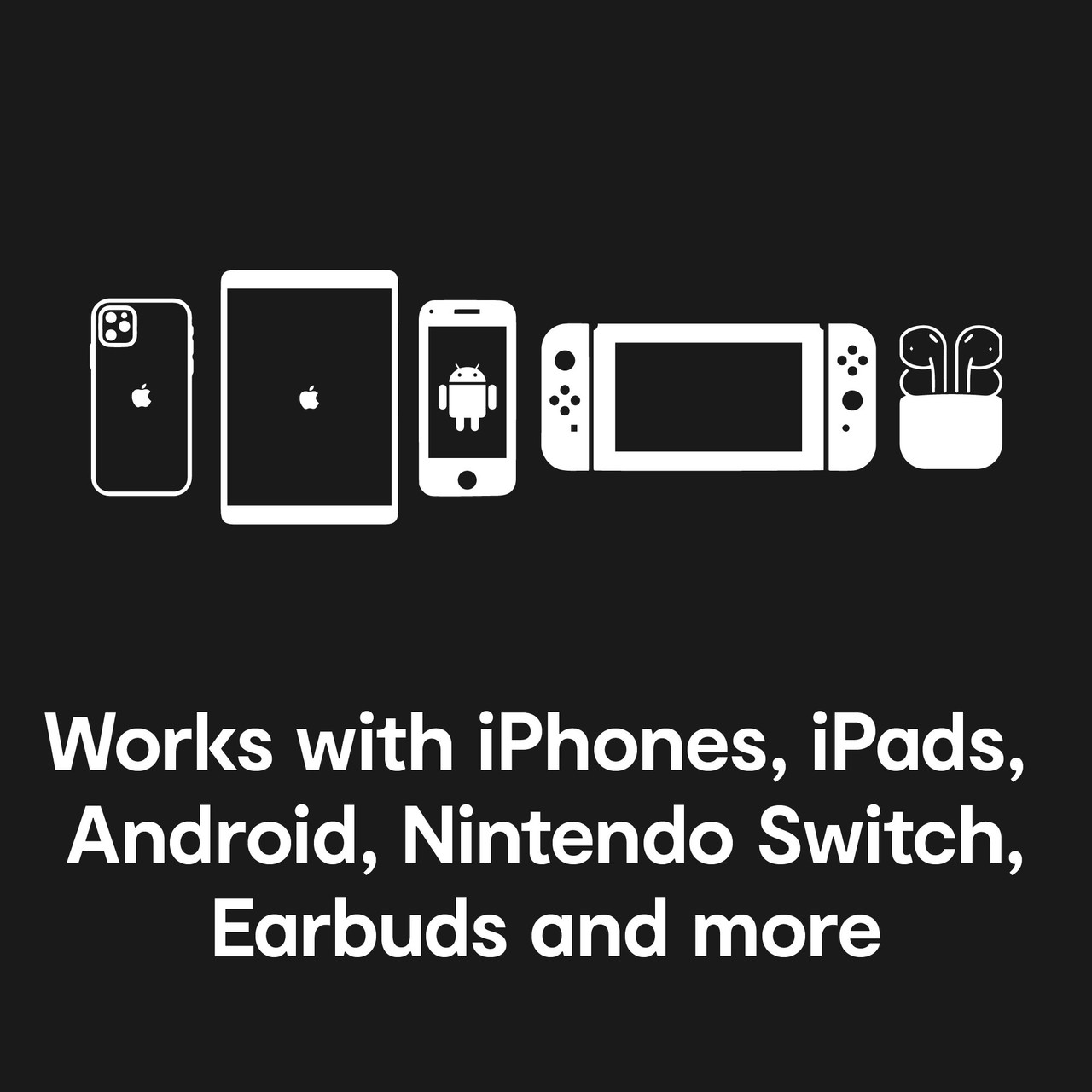 Charge your iPhone, iPad, Android, or Nintendo Switch all from one power bank. No extra chargers. No extra weight.