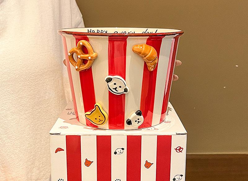Elevate your instant ramen experience with this whimsical and charming striped ceramic noodle bowl. This large-capacity bowl features a delightful design with vertical stripes and is adorned with cute, three-dimensional appliqués of cartoon characters, pretzels, and croissants. Inside the rim, a hand-written style message reads “Happy every day!”, adding a cheerful touch to your mealtime. The bowl boasts a smooth, delicate glaze on the inside and outside for easy cleaning, while the unglazed bottom provides an anti-slip design for stable placement on any surface. Beautifully packaged in a matching striped gift box, it’s a perfect gift for noodle lovers, students, or as a wonderful treat for yourself. Ideal for instant noodles, ramen, soup, cereal, or even as a fun popcorn bucket.