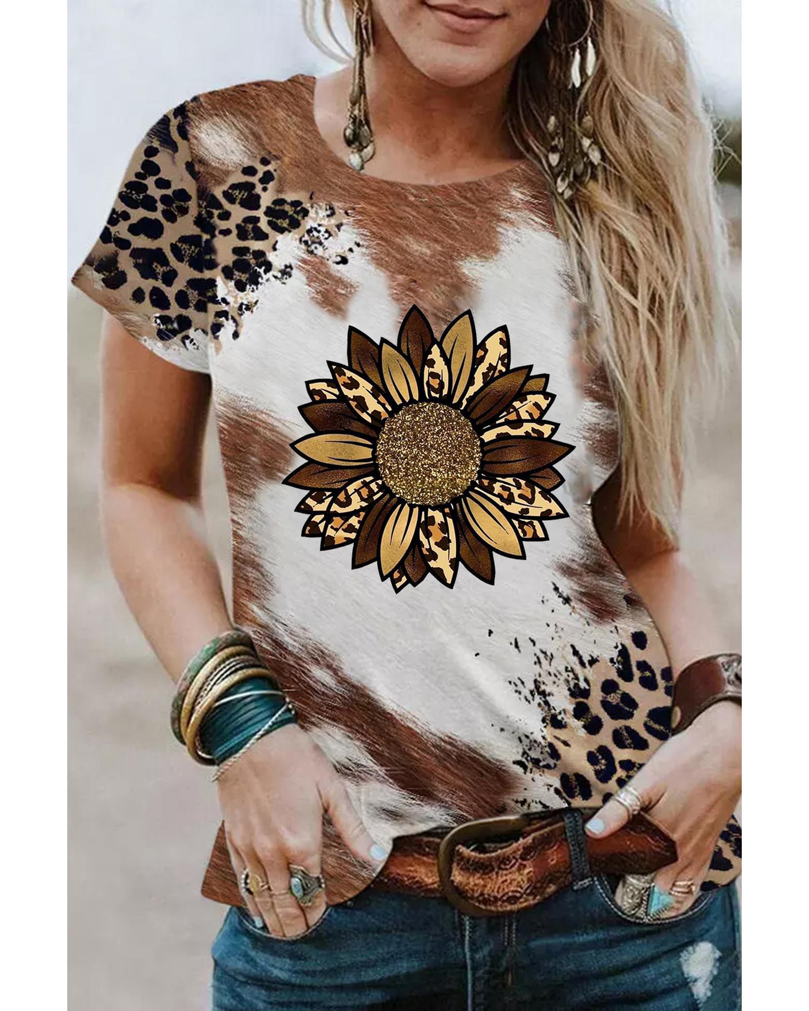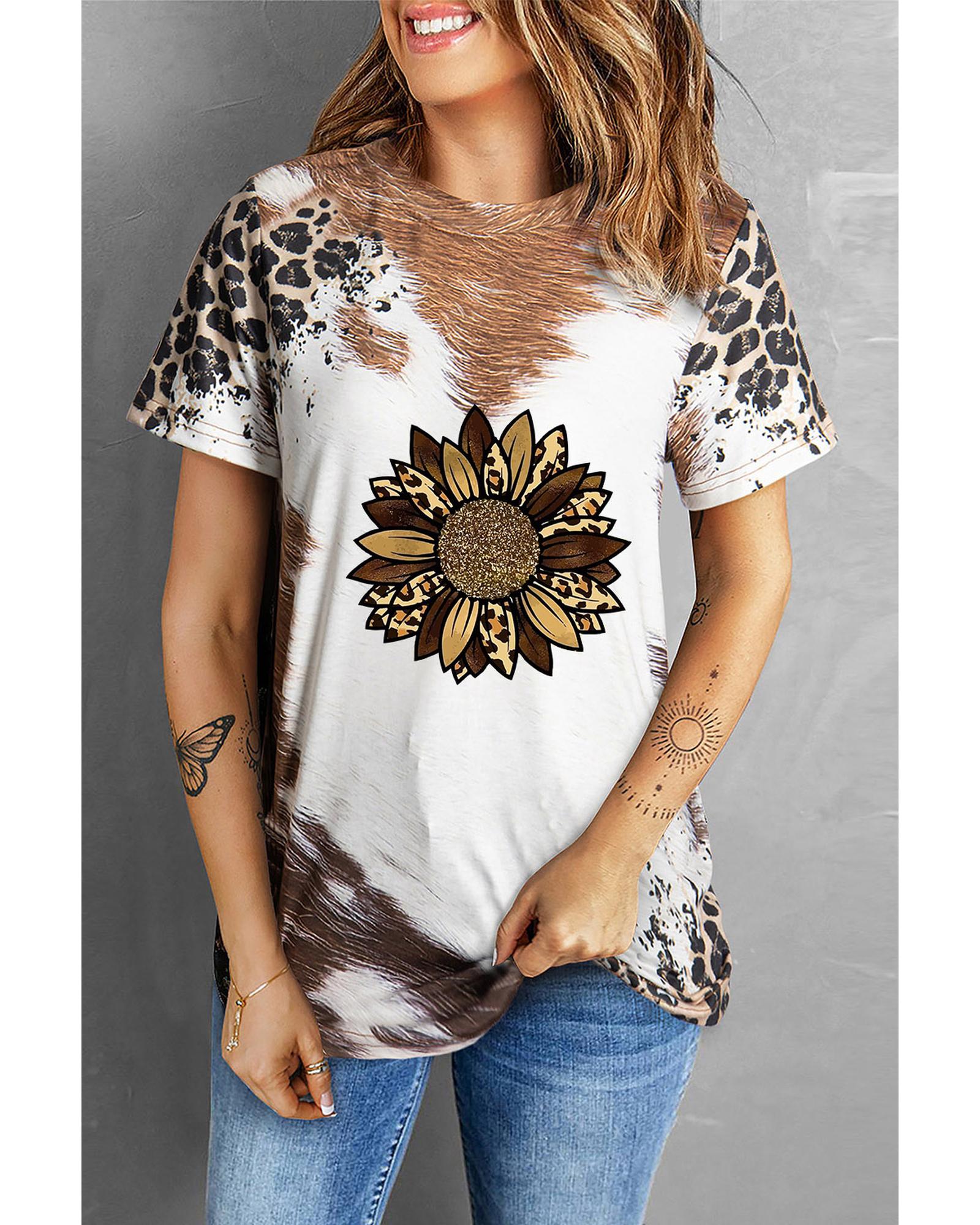 - Chestnut Leopard Bleached Sunflower Graphic Crewneck T
