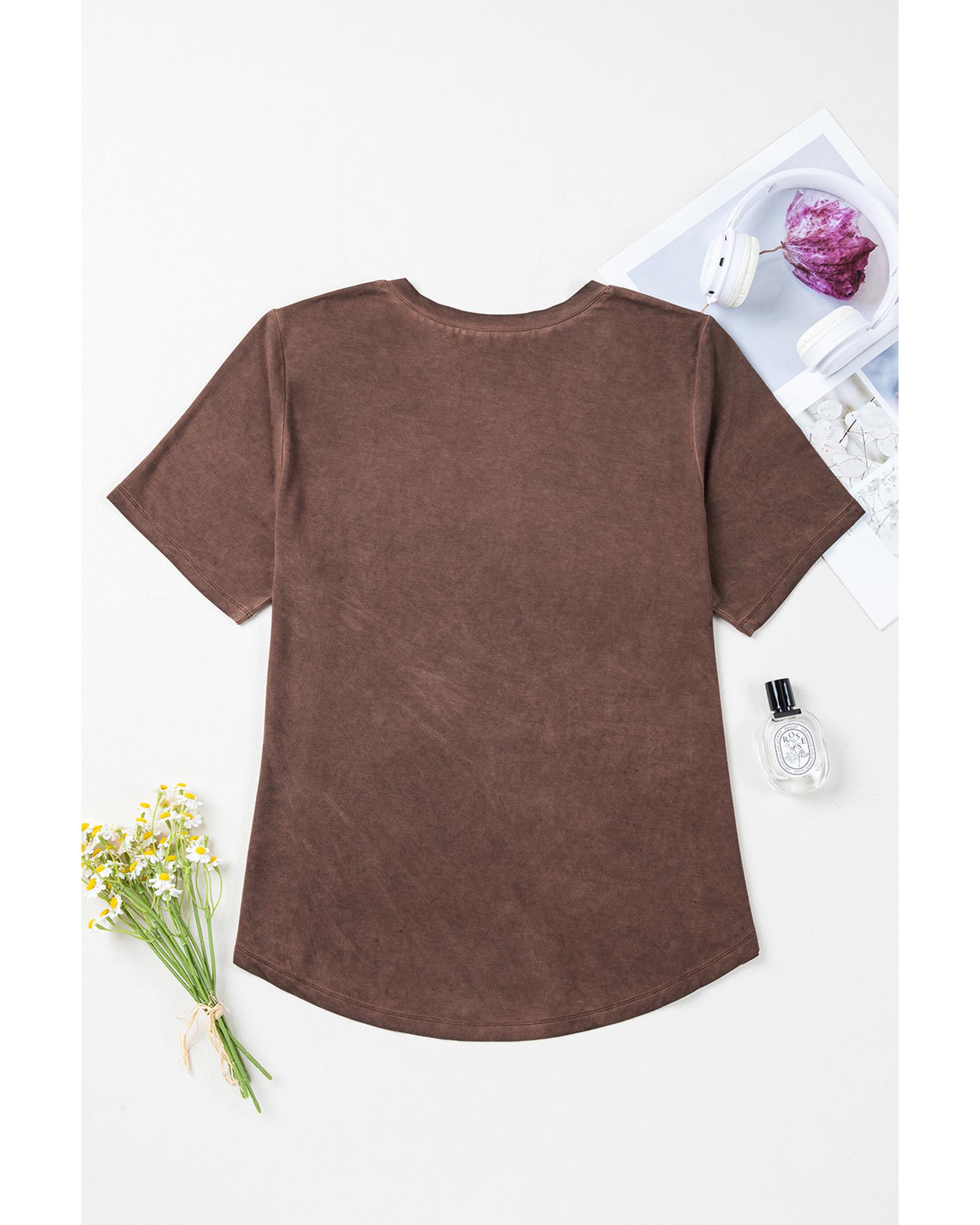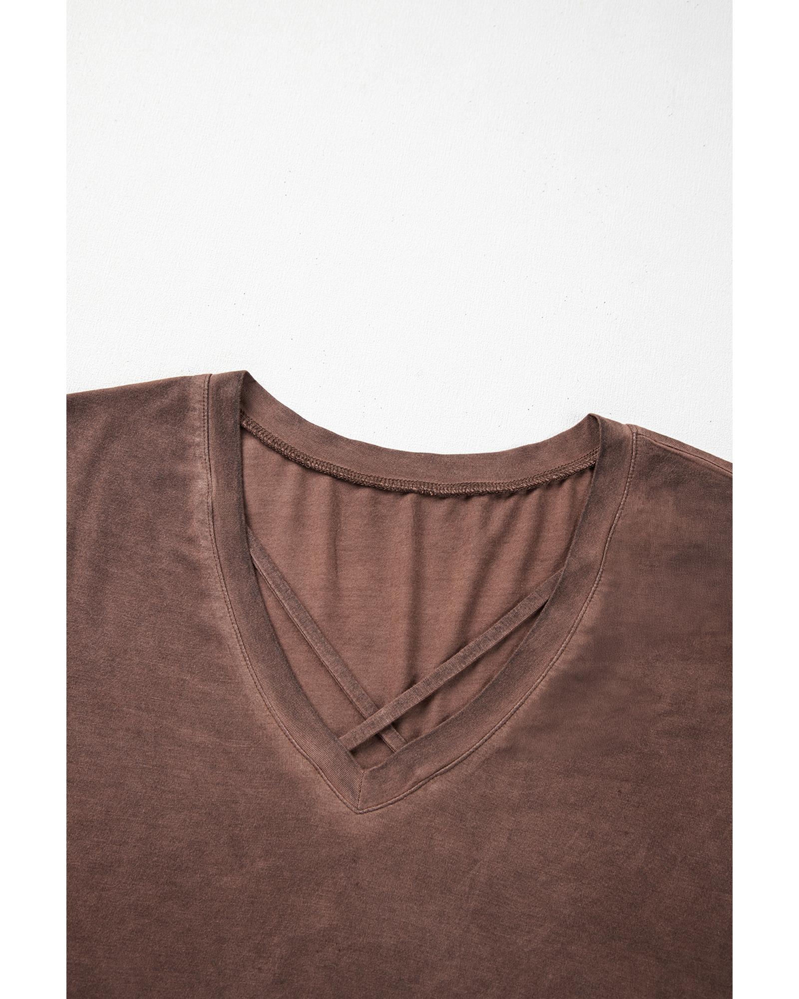 Chestnut Mineral Wash Criss Cross V Neck Casual T Shirt – M