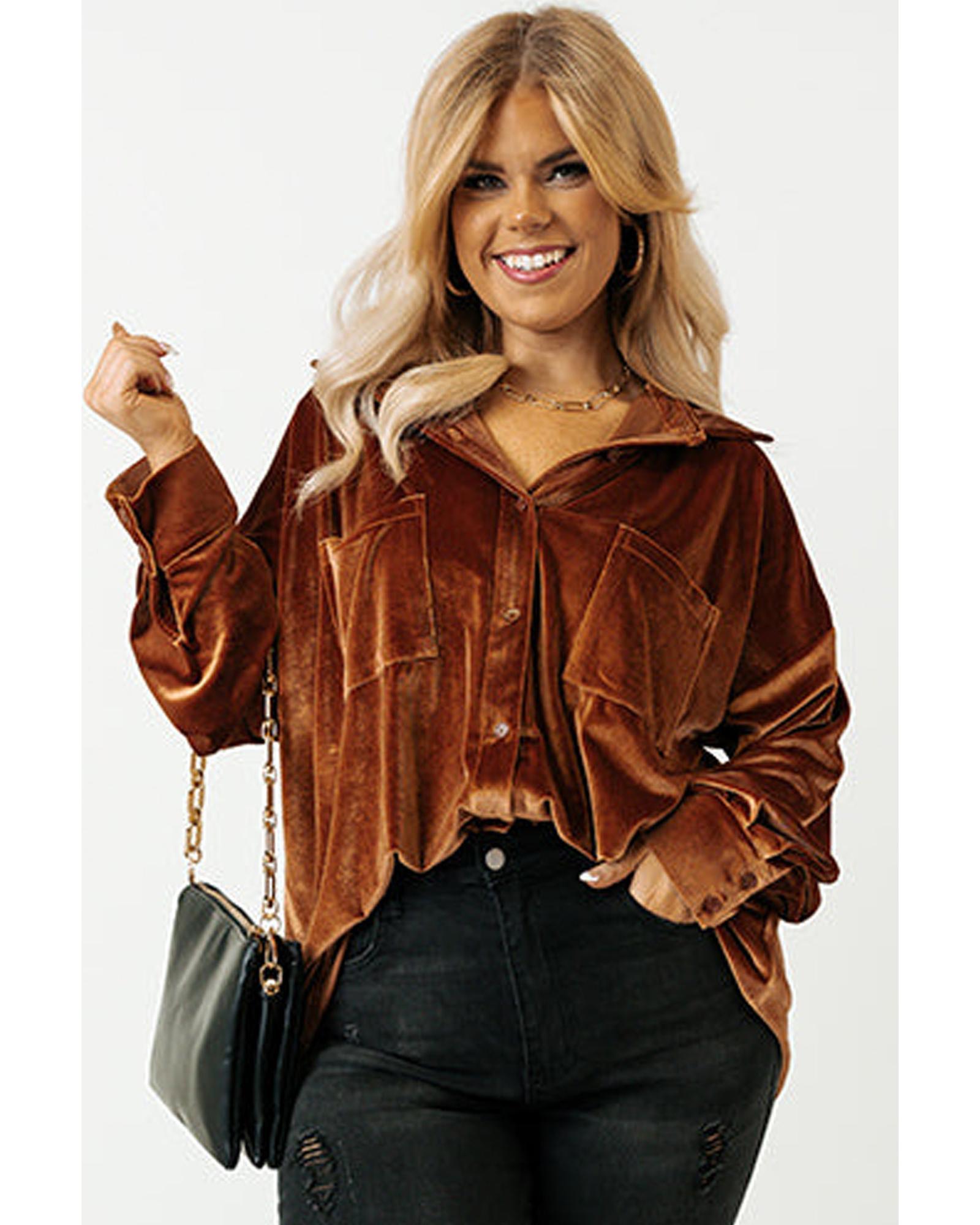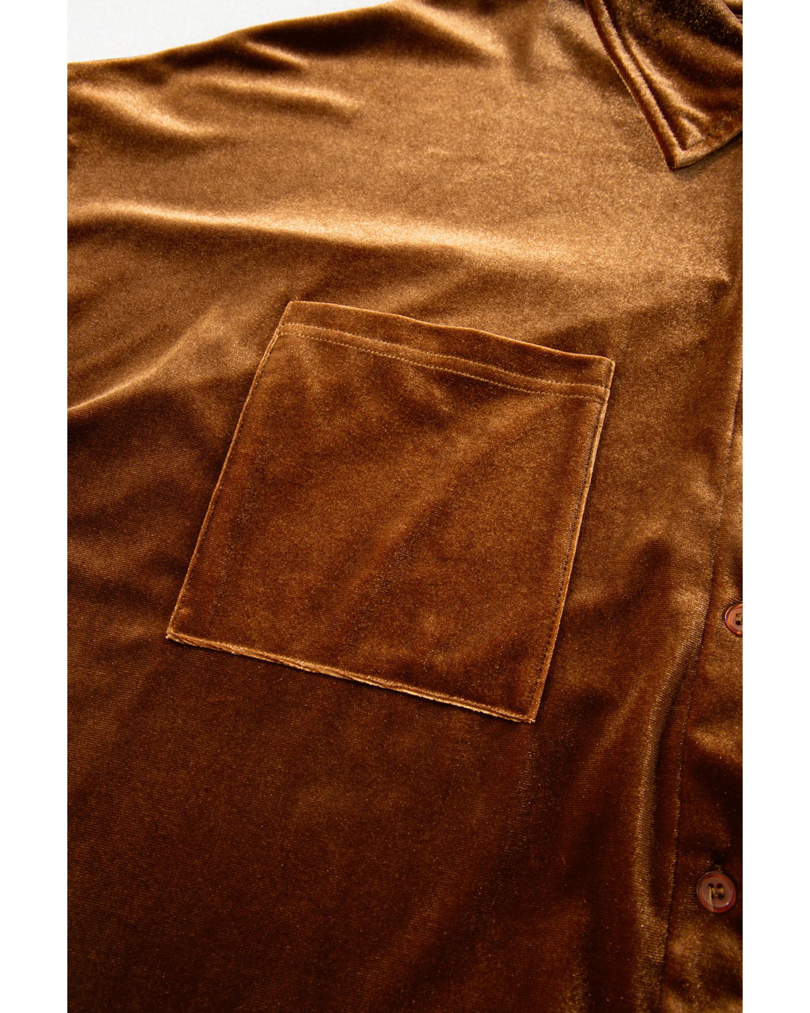 Chestnut Plus Size Velvet Chest Pocket Drop Shoulder Shirt – 2X