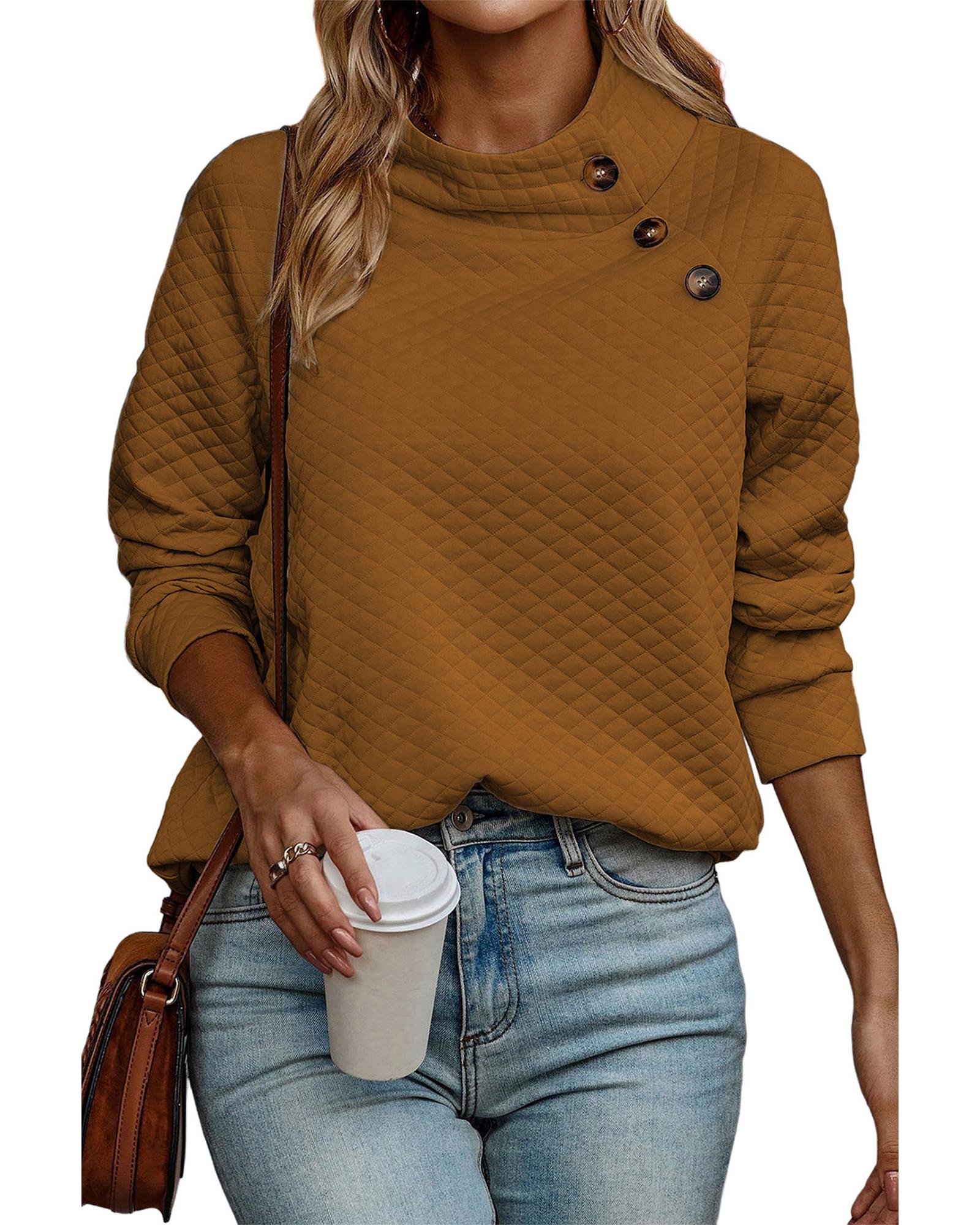Chestnut Quilted Buttoned Neckline Stand Neck Pullover Sweatshirt – L